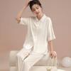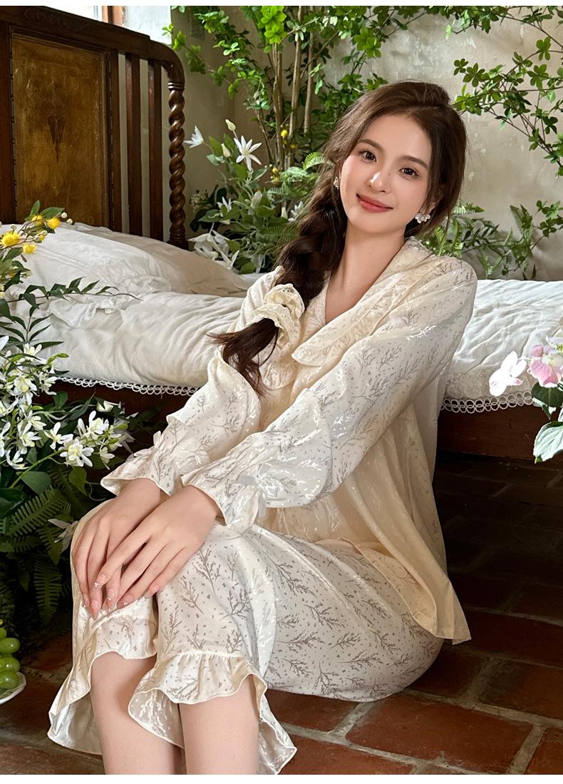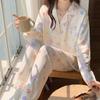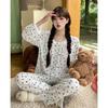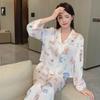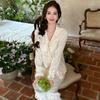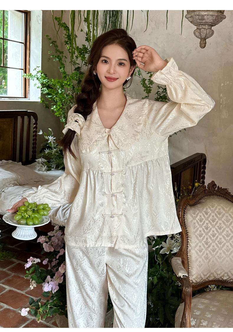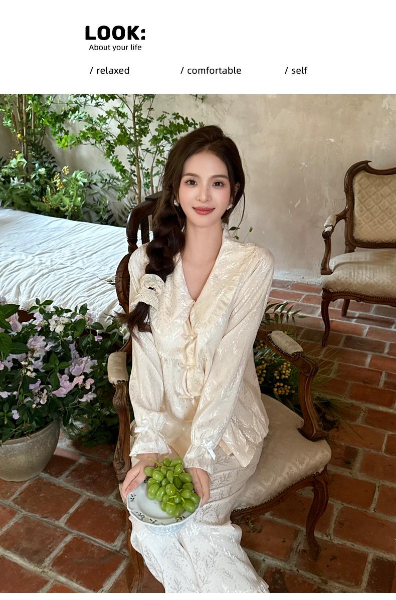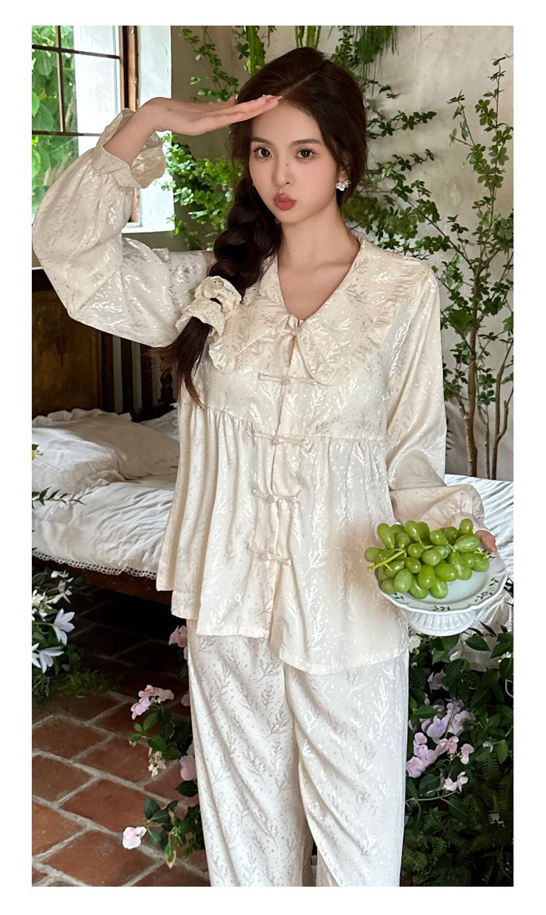 Pijama para Mujer Primavera y Otoño Simple Lindo Seda de Hielo Suelto Cuello de Muñeca Francesa Manga Larga Set de Pantalones Ropa de Casa Antigua