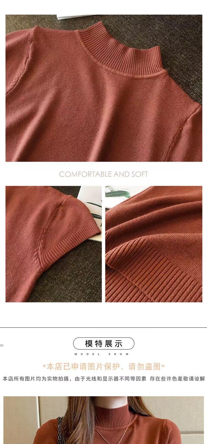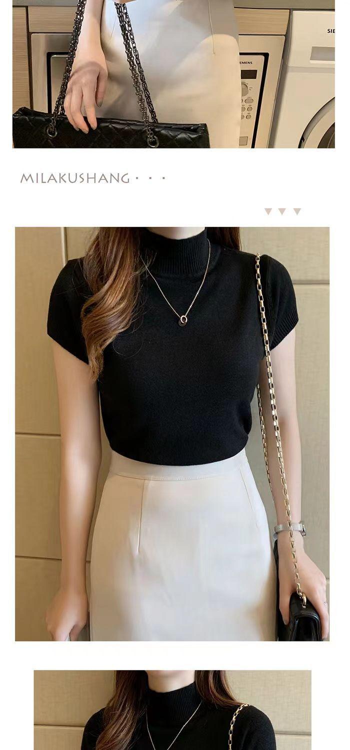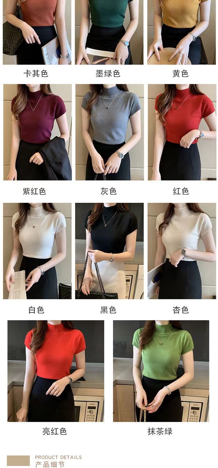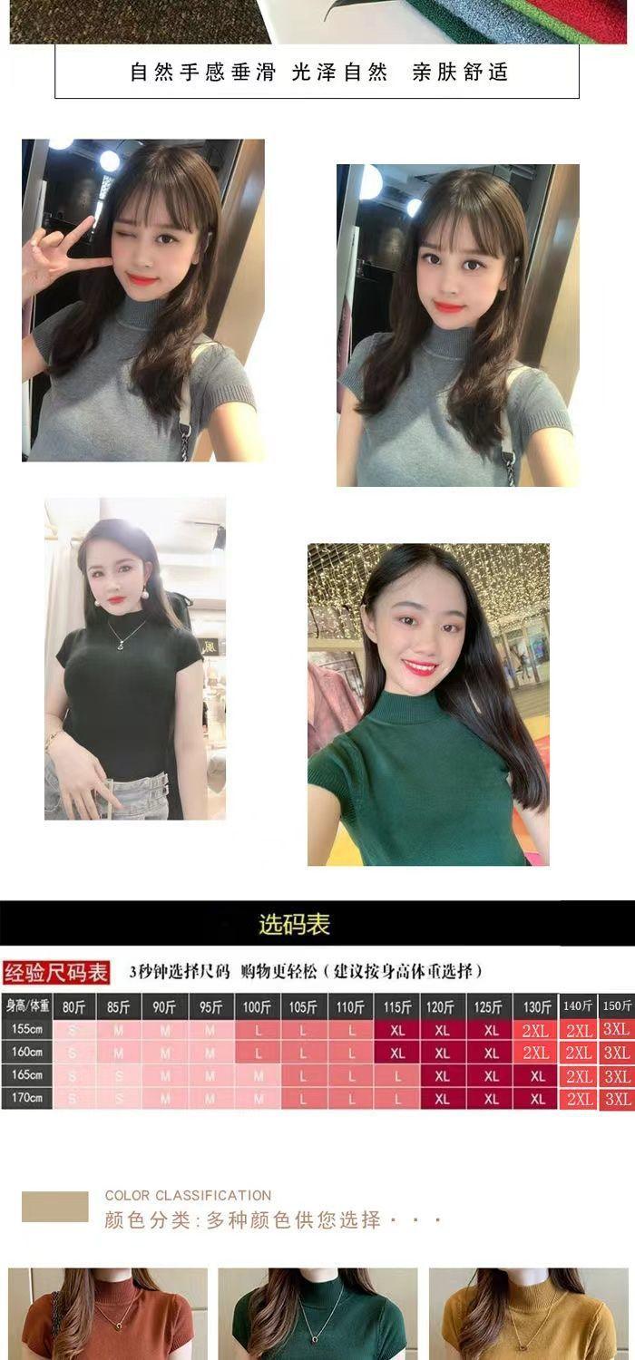 2023 Nuevo Camiseta Básica de Cuello Alto Medio para Mujer Delgada Corta de Manga Corta Tejido de Punto Tejido de Punto Corta Ajustada Top Coreano