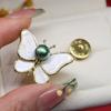 D parrot brooch, E small rabbit brooch, A plum brooch, B fishtail brooch, F flower brooch