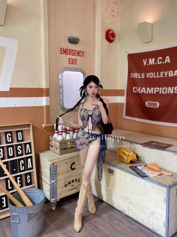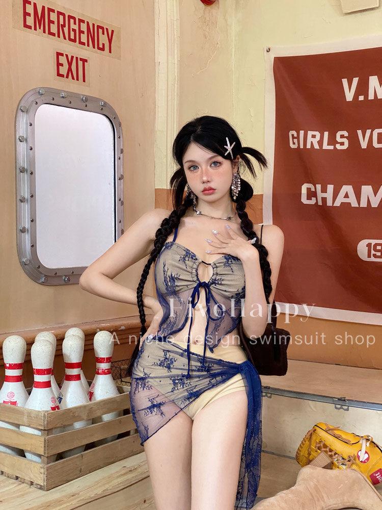 Traje de Baño para Mujer Nuevo Encaje Sexy Vacaciones Aguas Termales Orilla del Mar Chica Caliente Vestido Retro Bikini Tres Piezas Dividido Traje de Baño