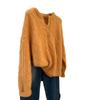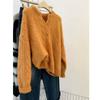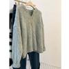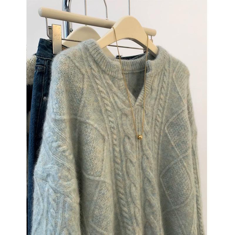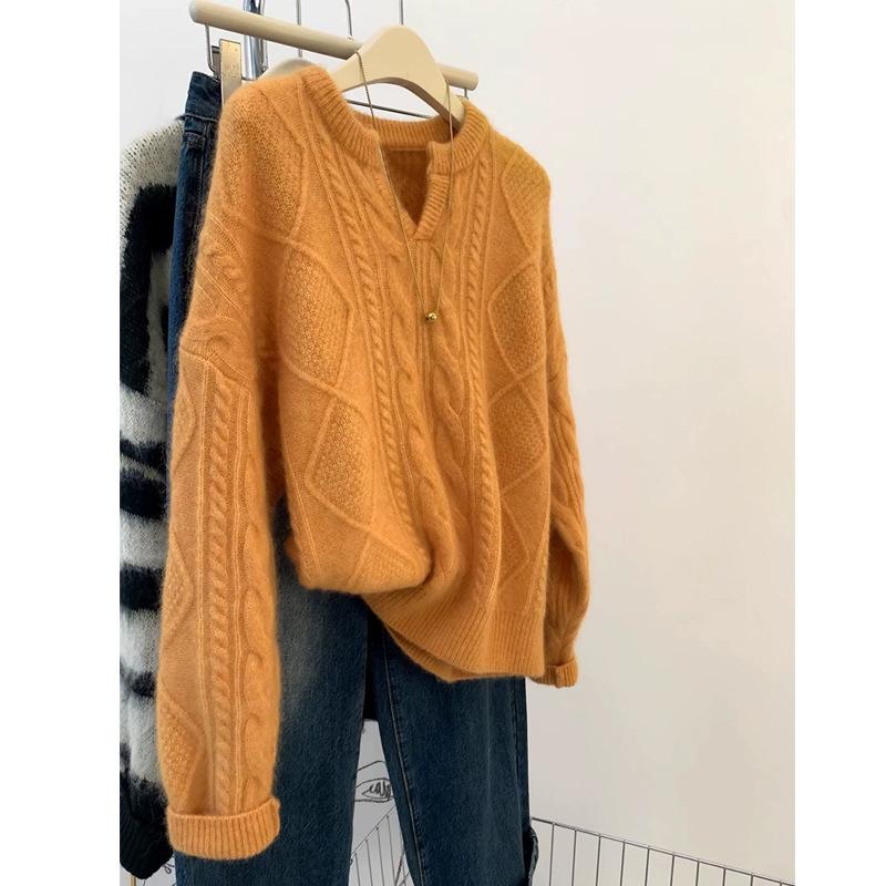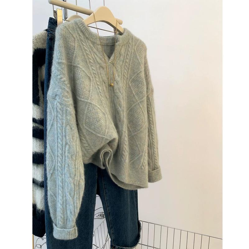 Suéter de Terciopelo de Mapache Gris con Trenzado de Rombos Cuello en V para Mujer Otoño e Invierno Estilo Retro Holgado Suéter Interior de Punto Invierno Grueso