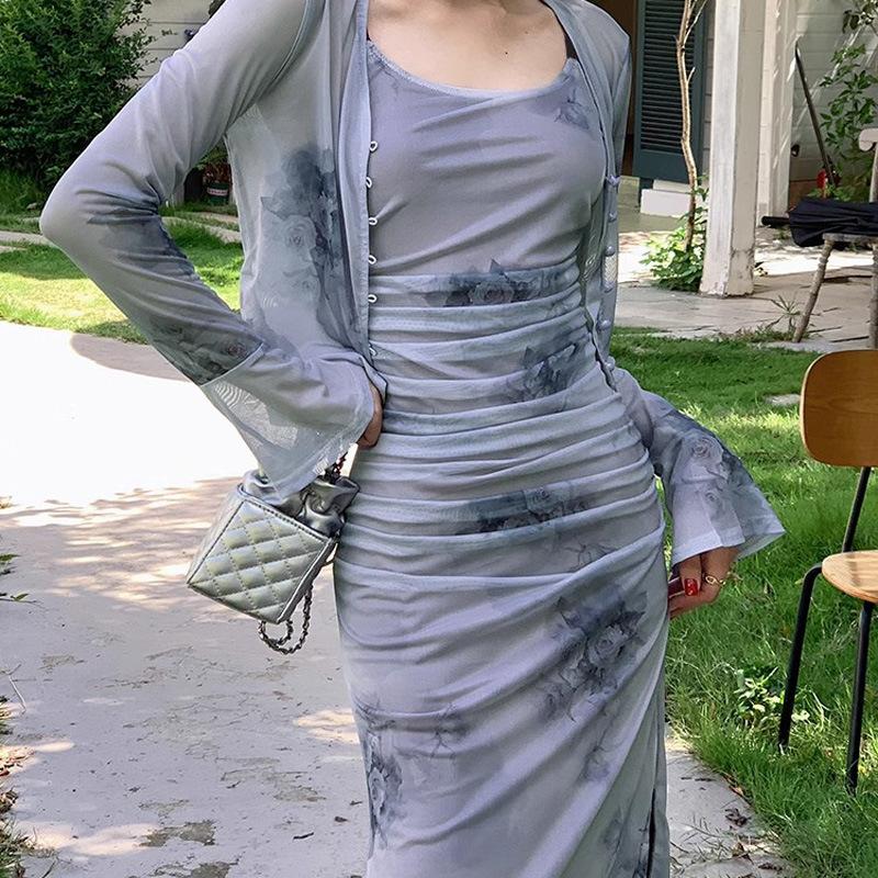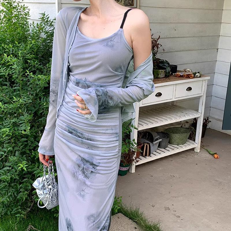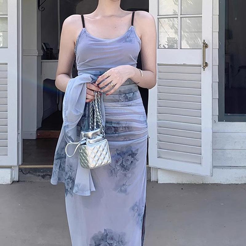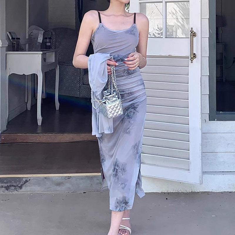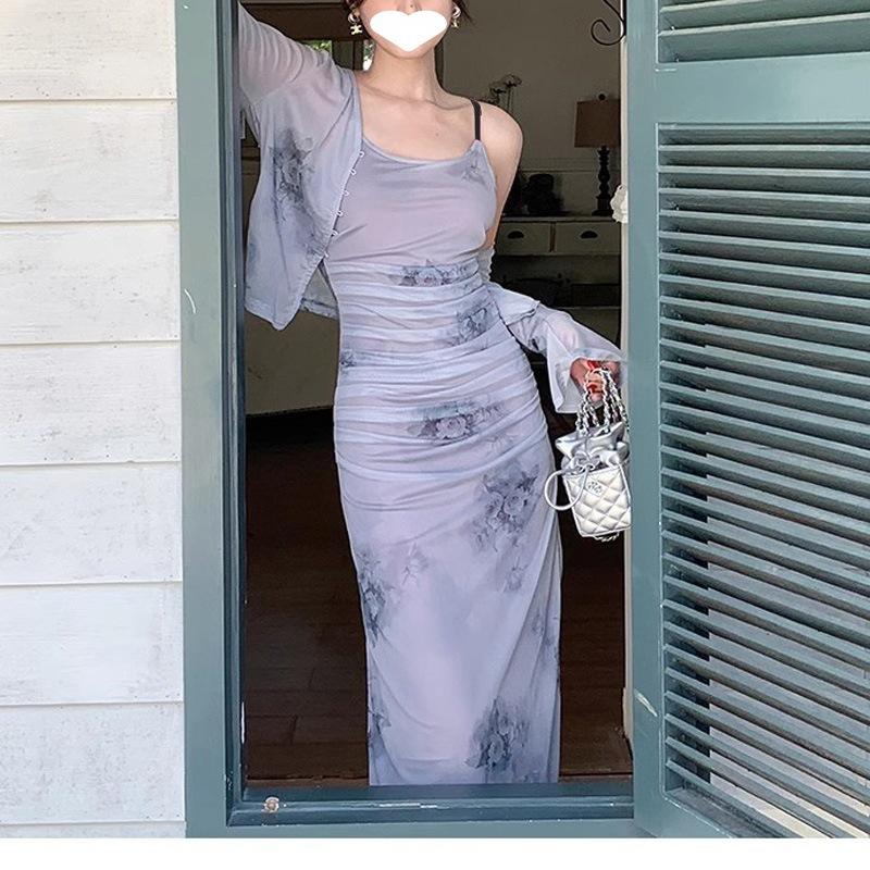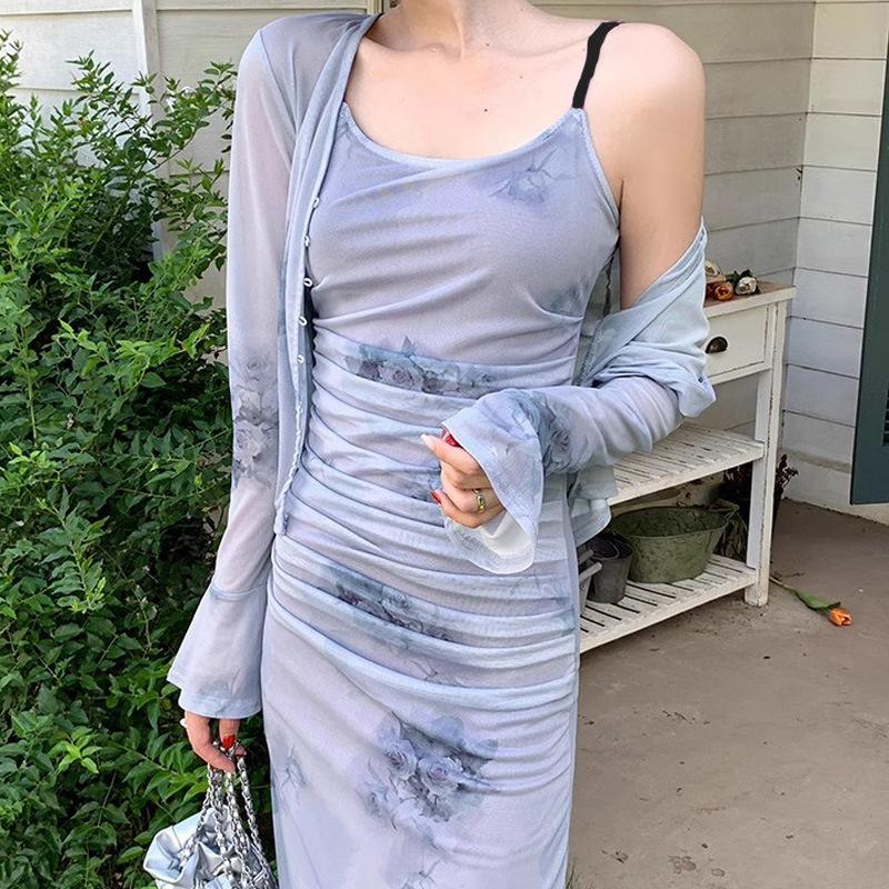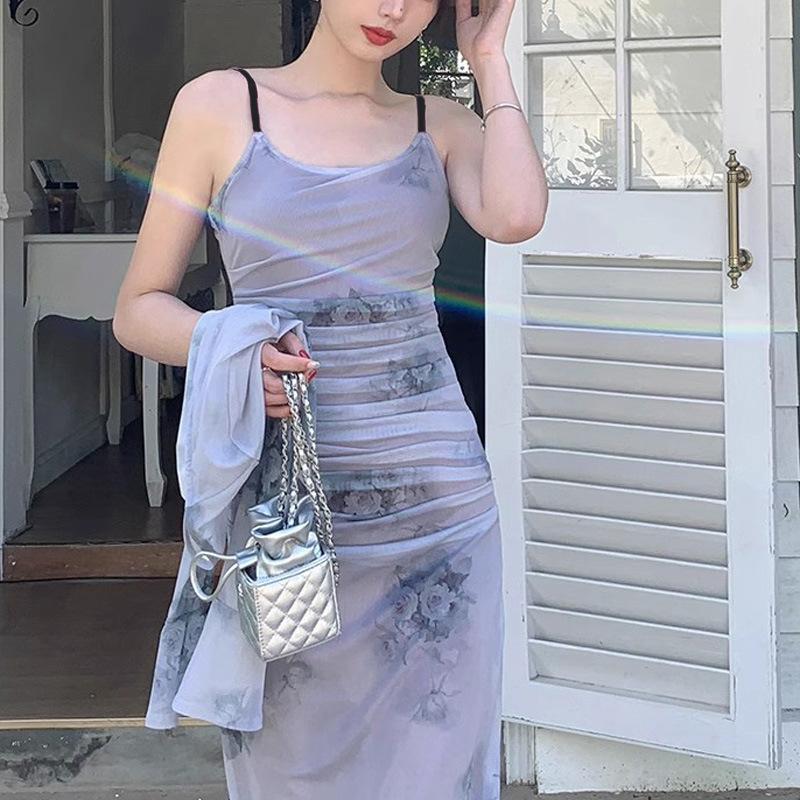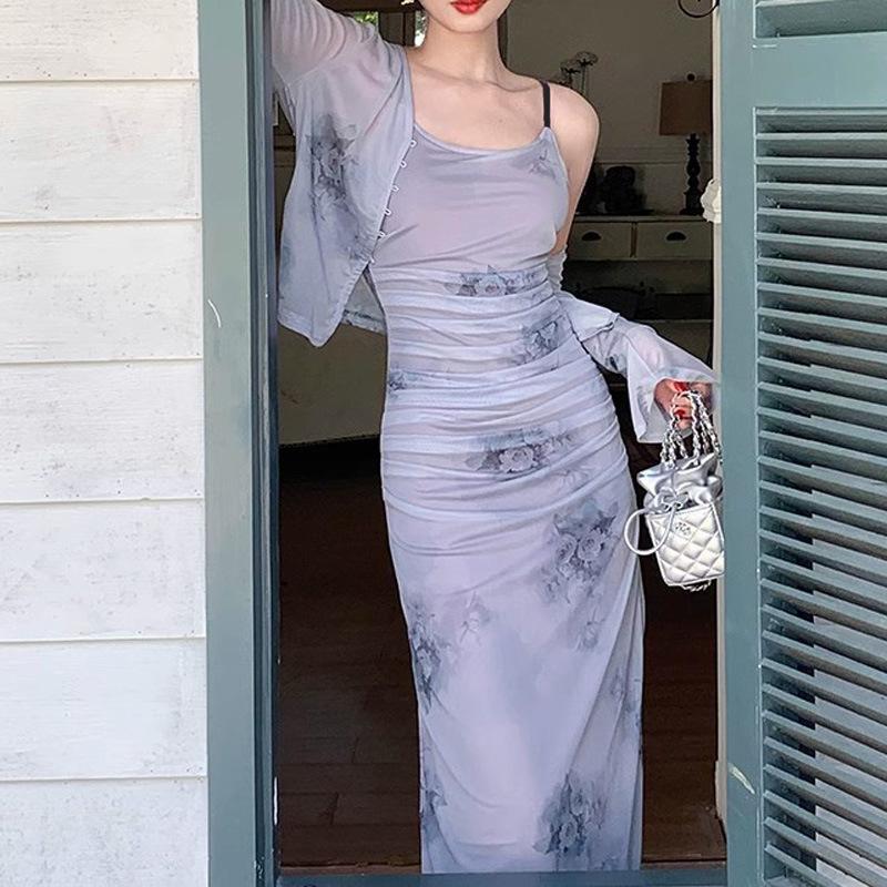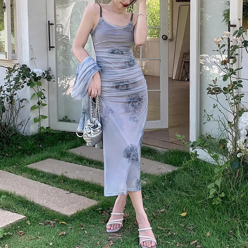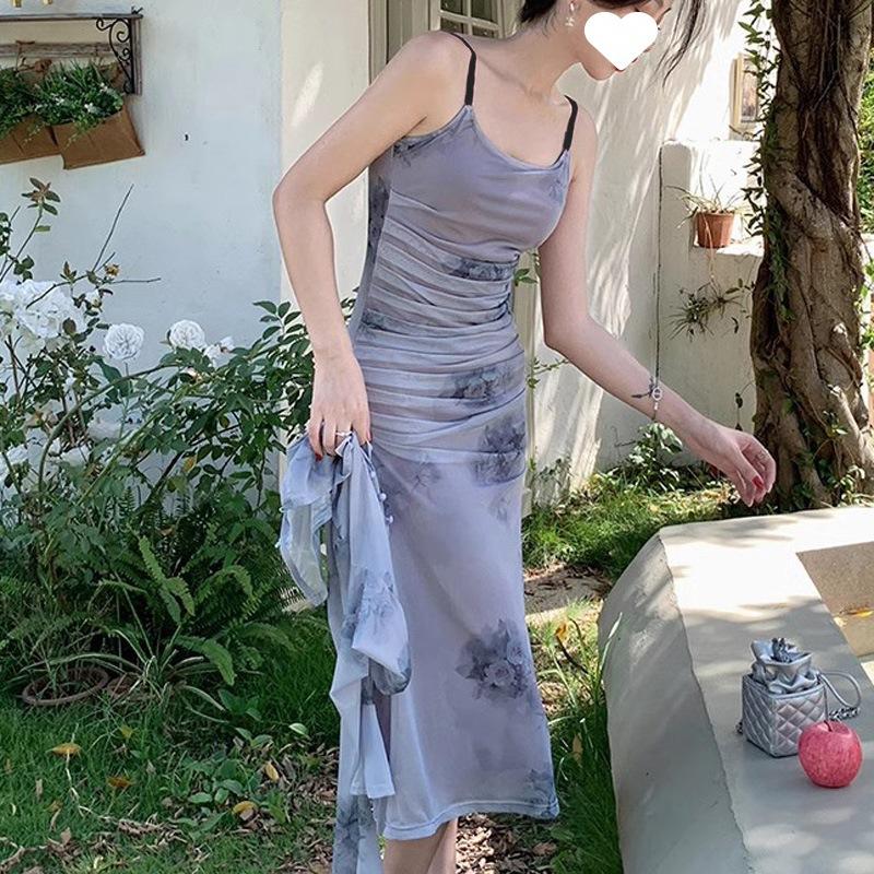 Vestido lencero estilo francés vintage con rosas, plisado, estampado a la cadera, para mujer, novedad de 2024