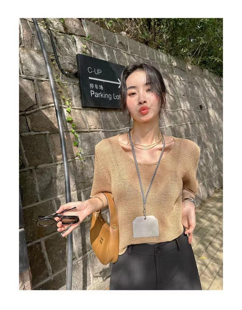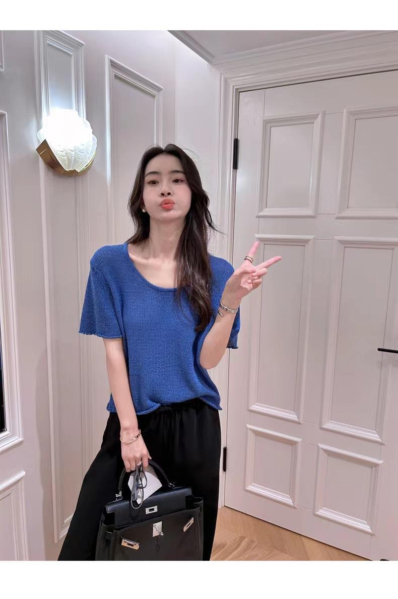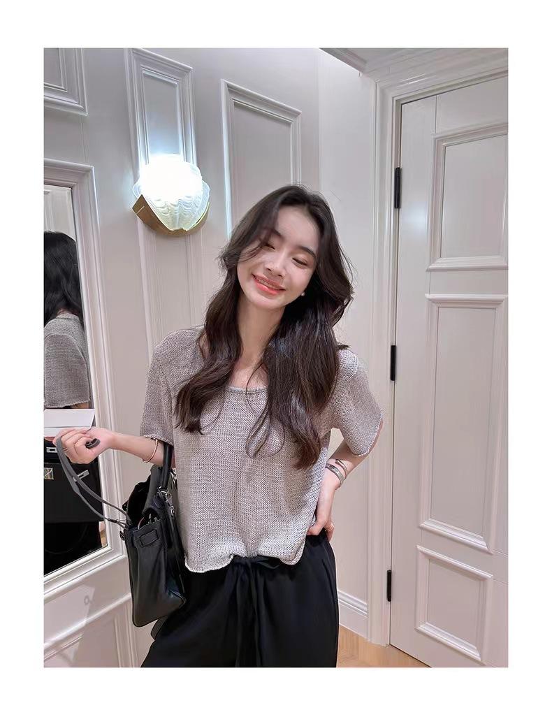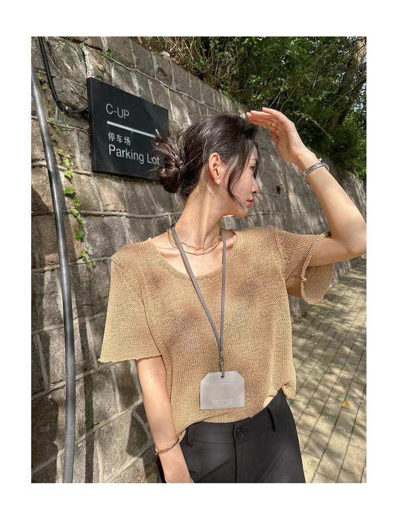 Blusa casual de manga corta para mujer con diseño de hilo de cinturón de verano, sentido del diseño, holgada, de malla calada transpirable, punto, camiseta