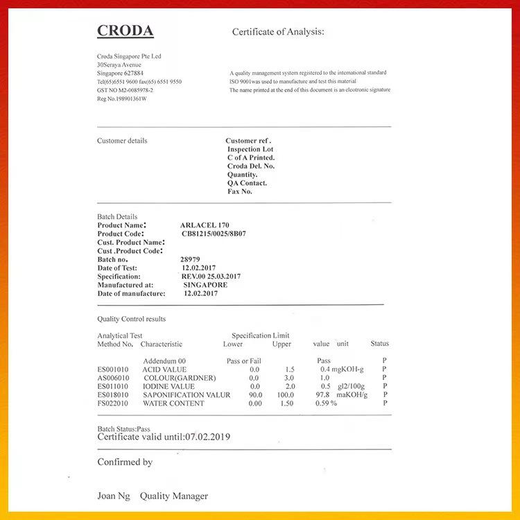 El A165 es un excelente emulsionante de agua en aceite, apto para diversas sustancias lipofílicas. Permanece estable en un entorno ácido específico para cosméticos y puede utilizarse junto con tensioactivos no iónicos, aniónicos y catiónicos.
