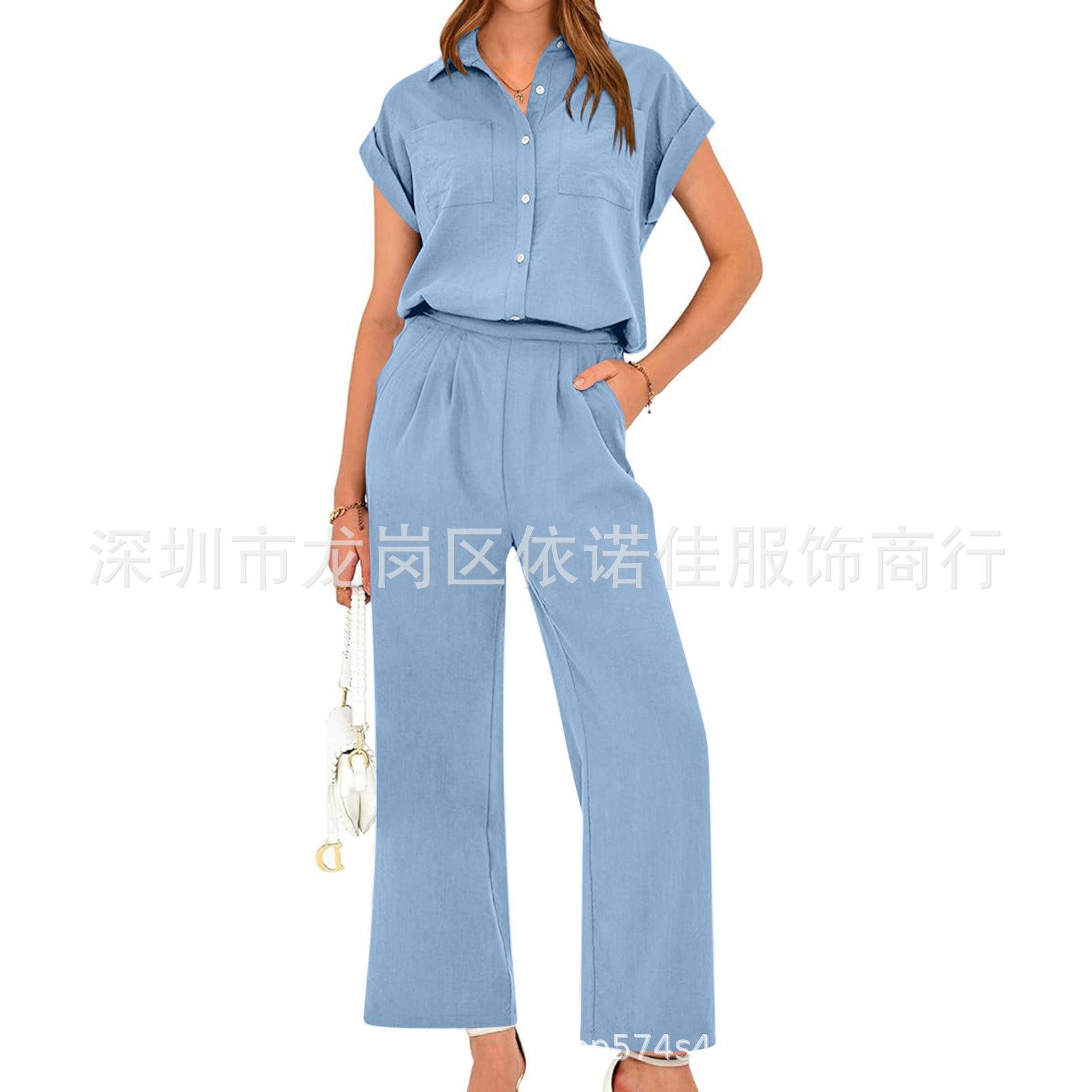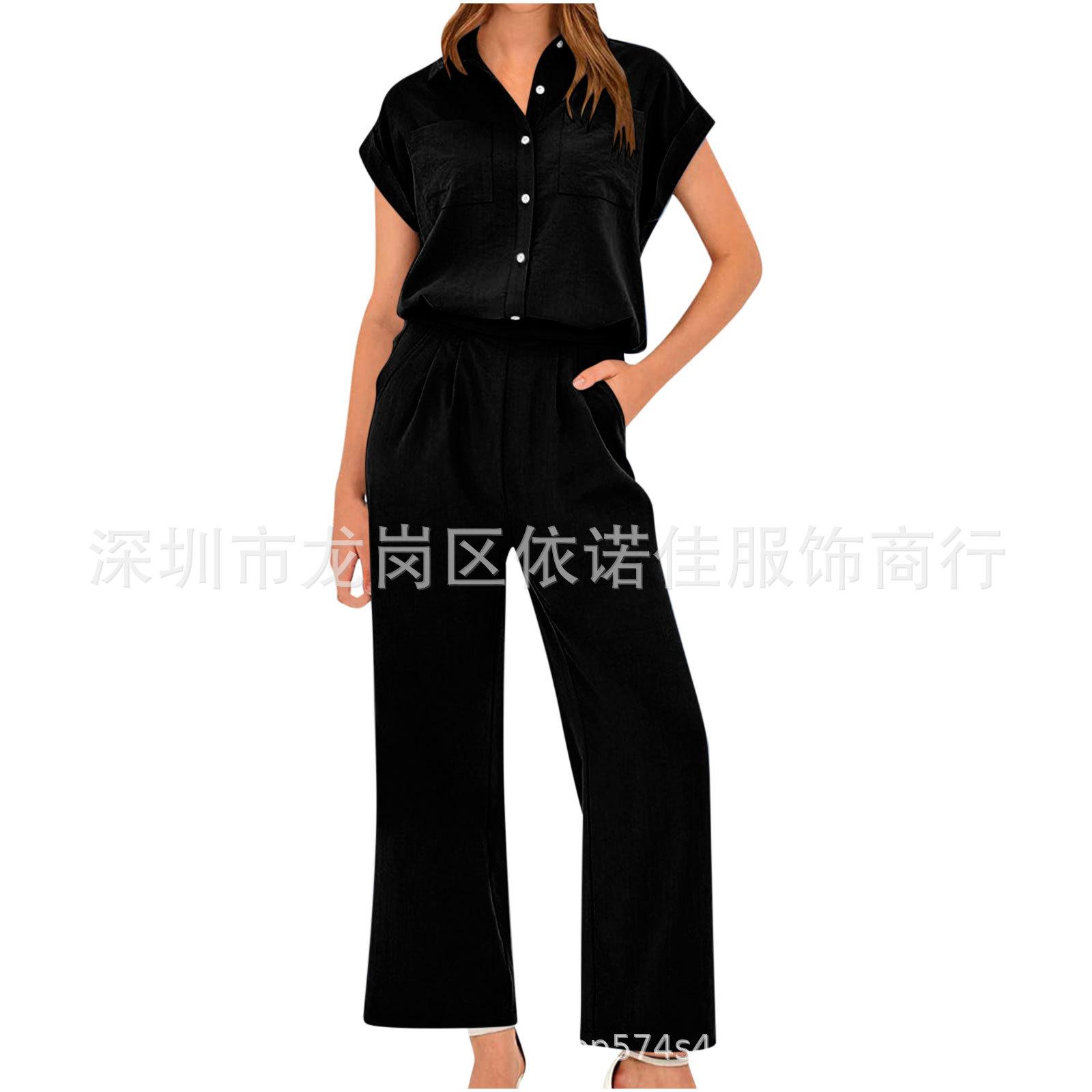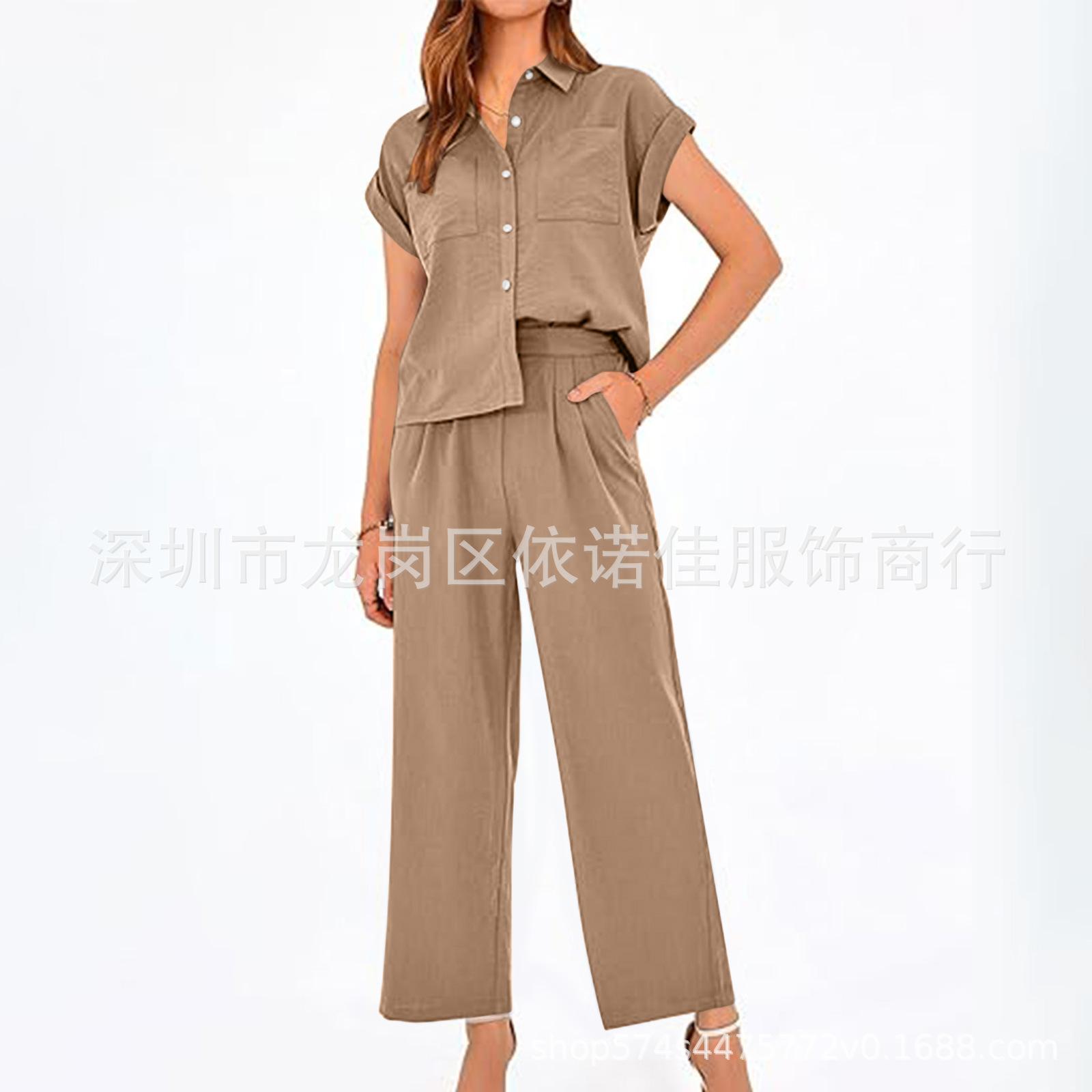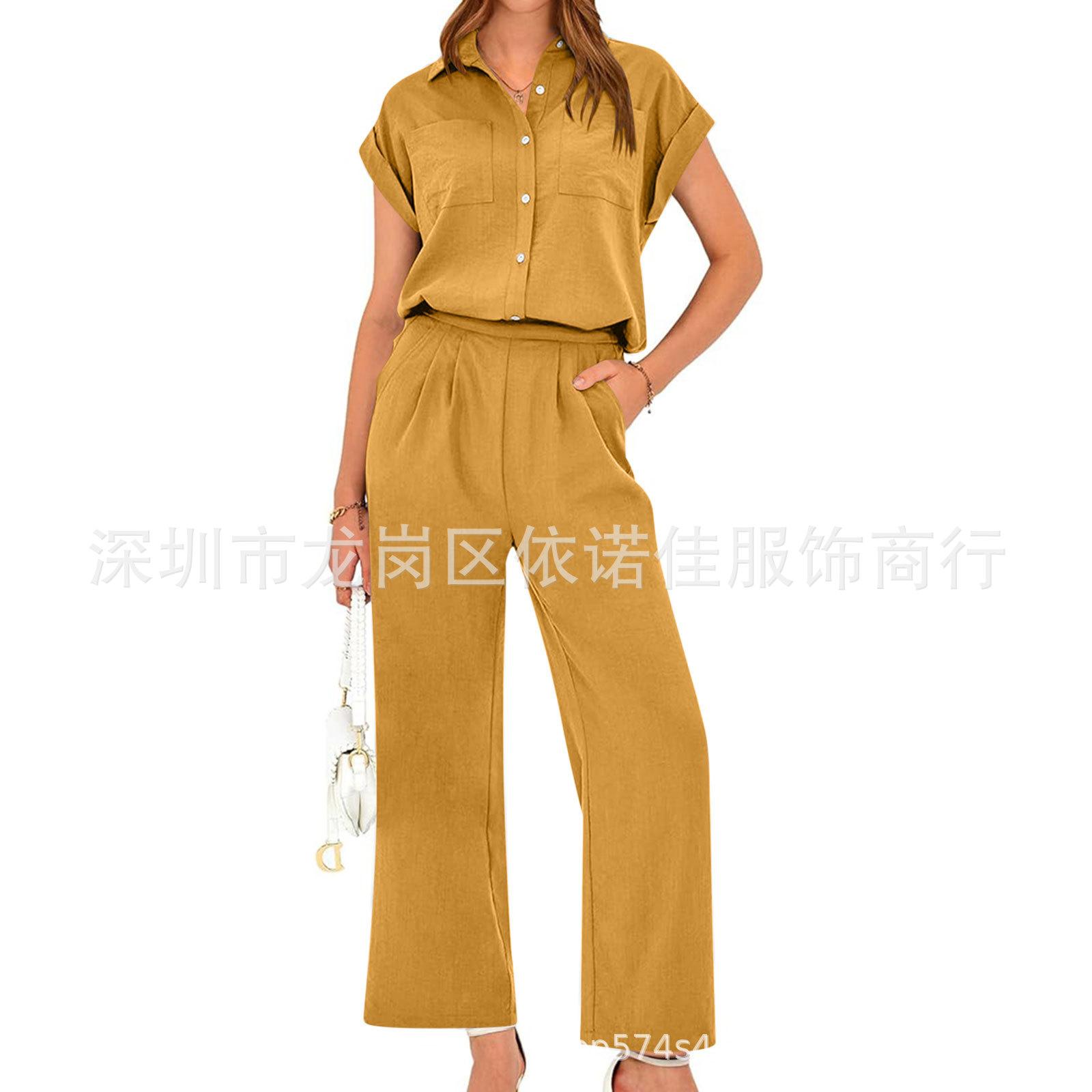Traje de dos piezas de verano para mujer, informal, con solapa, manga corta y pierna ancha, disponible en stock