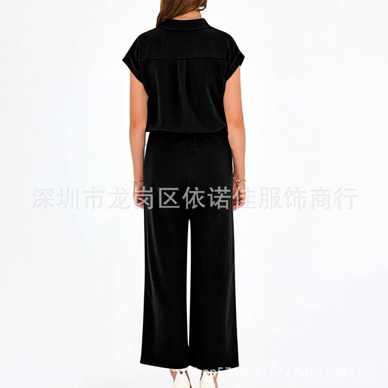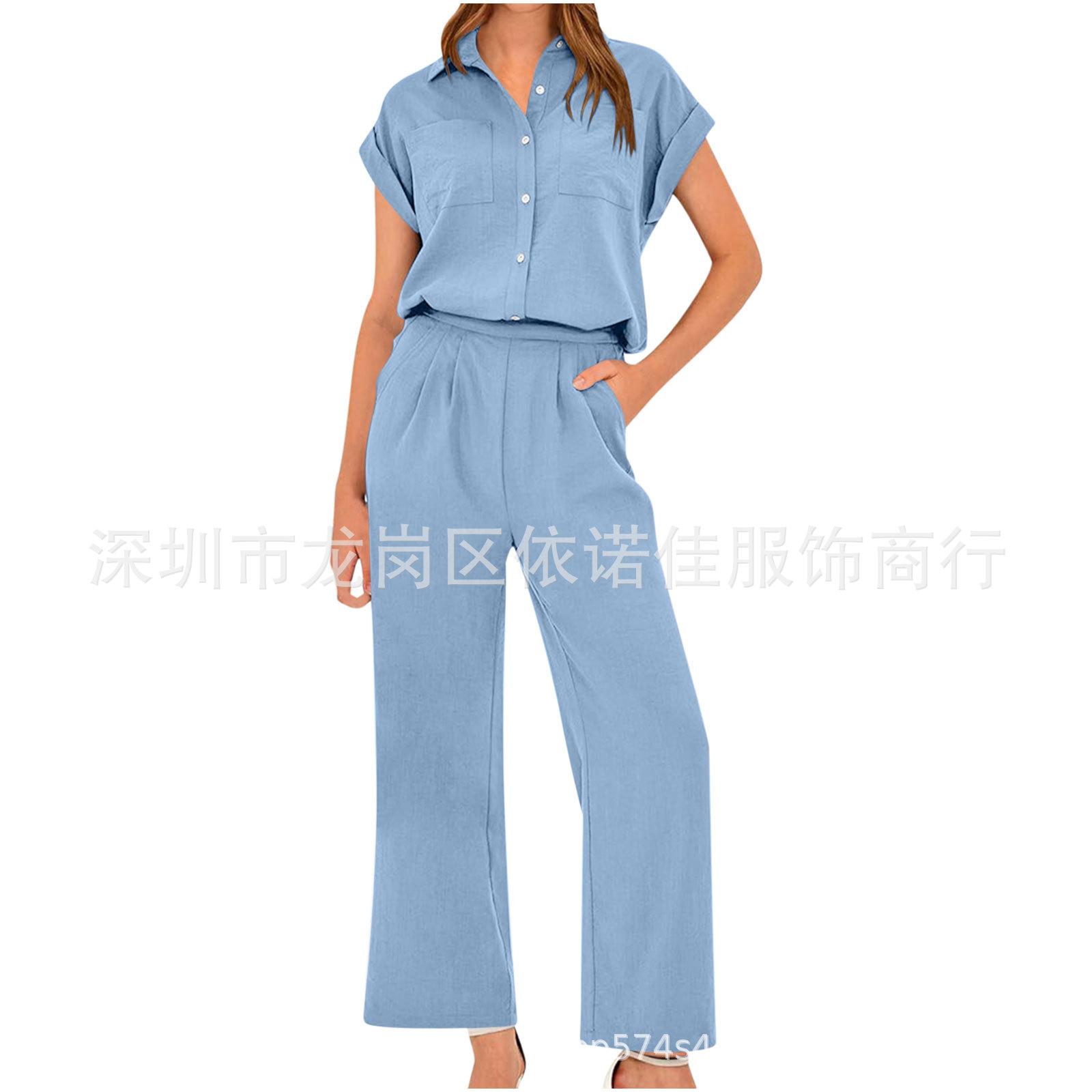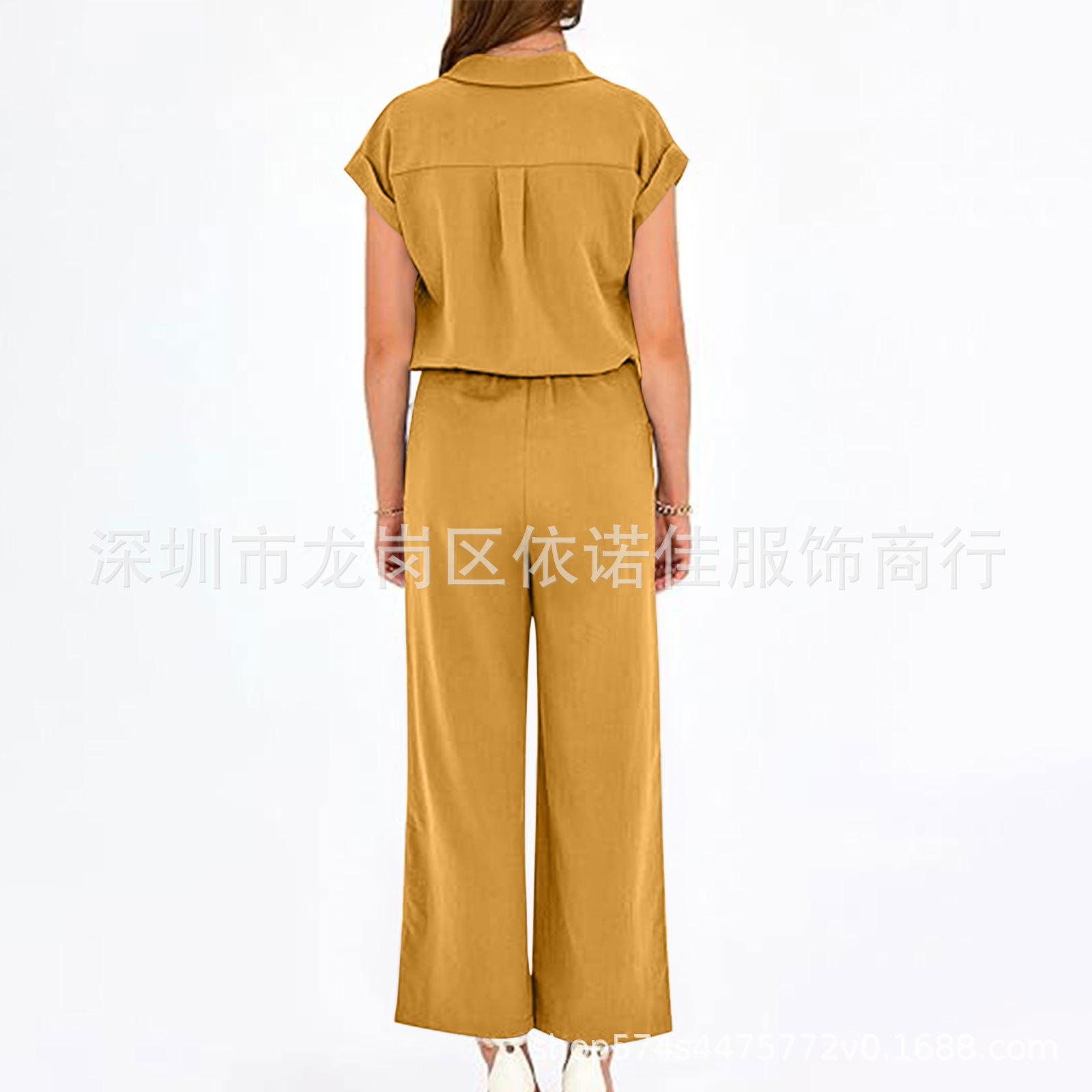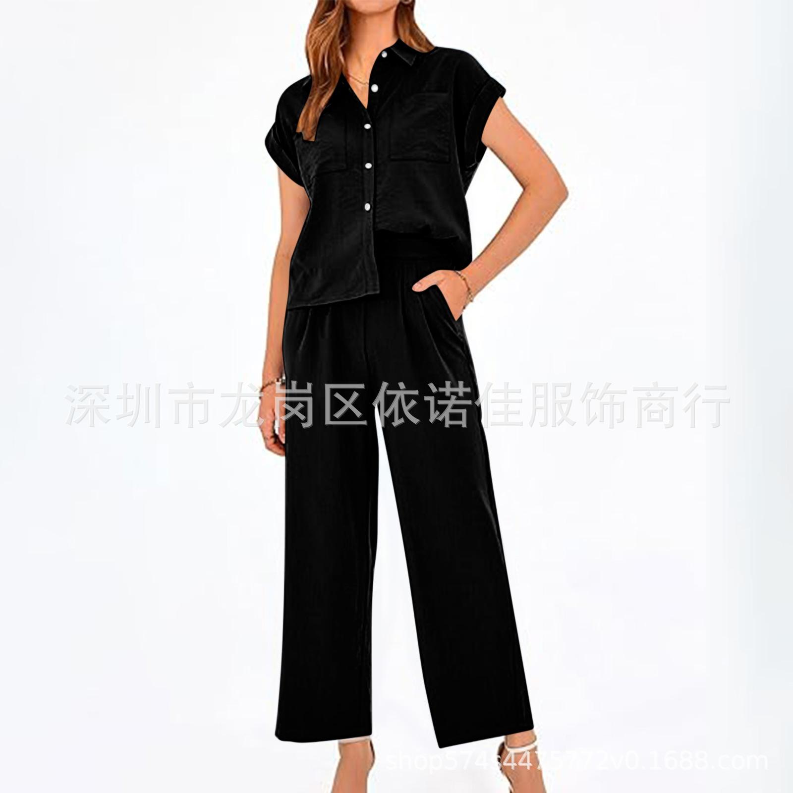 Traje de dos piezas de verano para mujer, informal, con solapa, manga corta y pierna ancha, disponible en stock