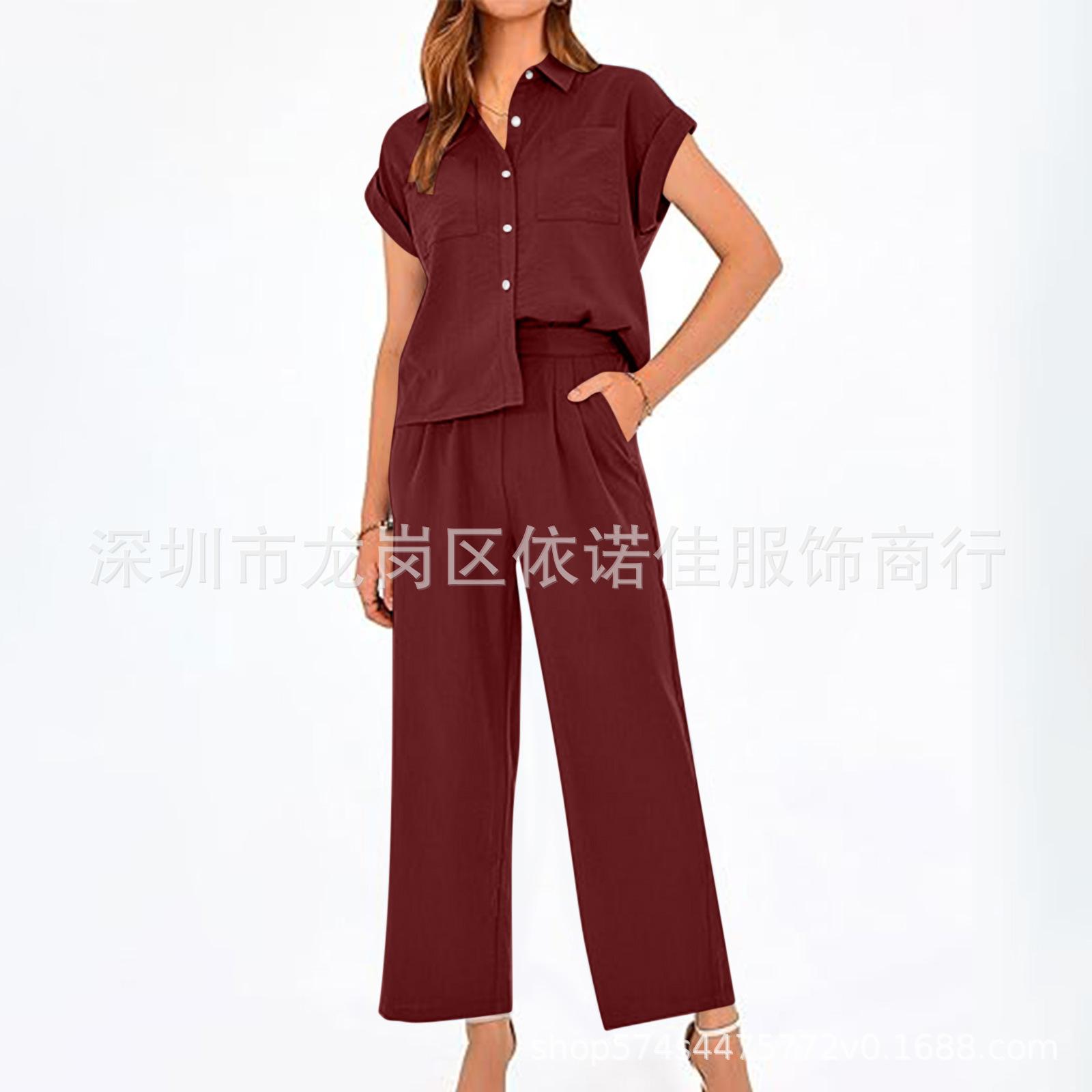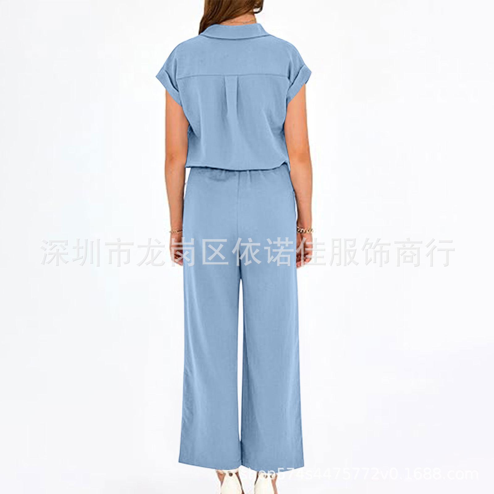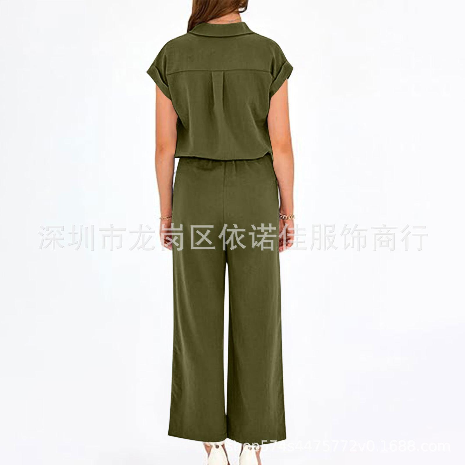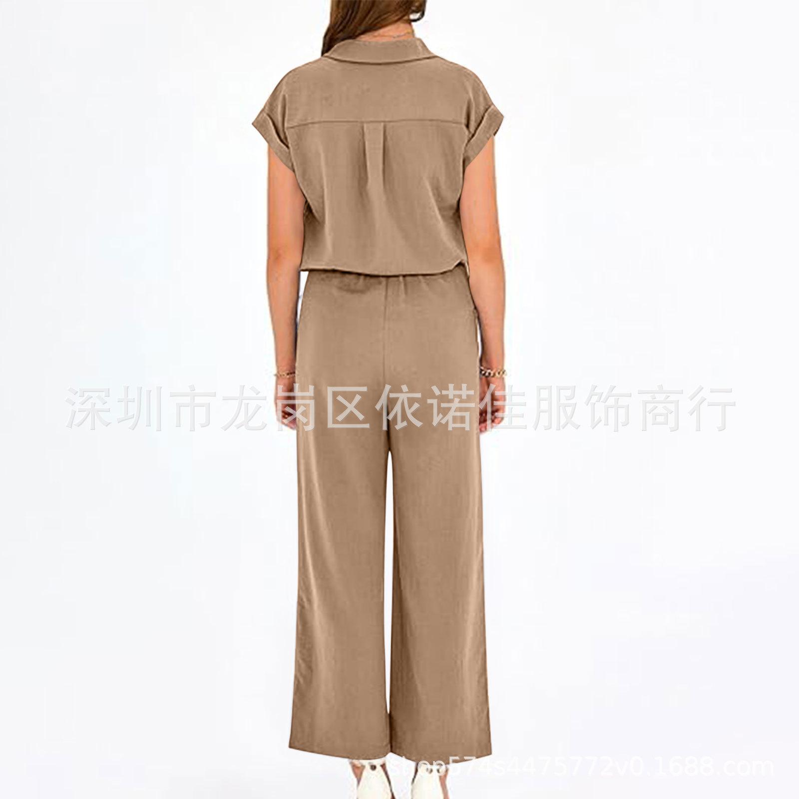 Traje de dos piezas de verano para mujer, informal, con solapa, manga corta y pierna ancha, disponible en stock