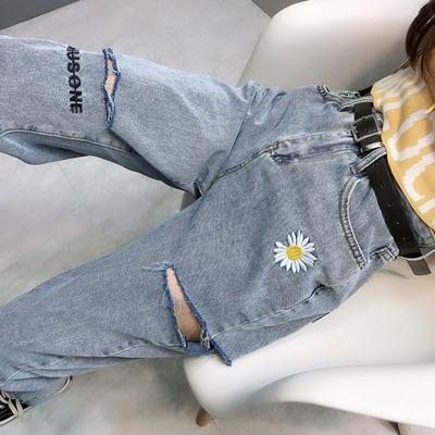 Jeans bordados de margaritas para mujer 2020 primavera y verano rectos sueltos adelgazantes agujeros pierna ancha cintura alta papá pantalones de nueve puntos