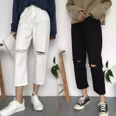 Moda coreana 2018 jeans ajustados de cintura alta rasgados de mendigo para mujer pantalones rectos versión holgada estilo BF pantalones de pierna ancha