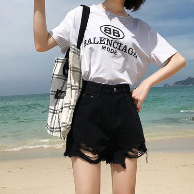 2020 Nueva versión coreana de shorts de mezclilla rotos para estudiantes, holgados y ajustados, pantalones versátiles de pierna ancha y cintura alta, pantalones cortos de verano