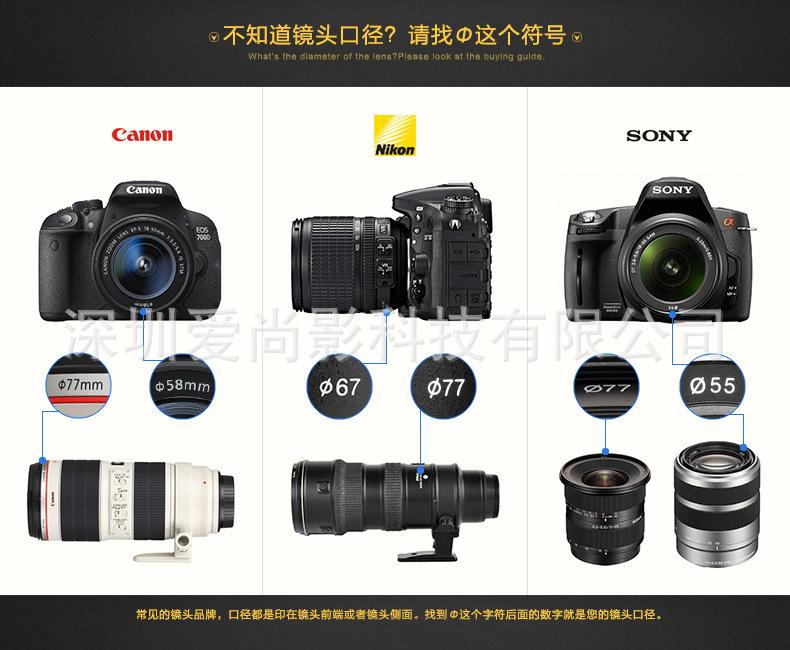 Consejos de Alfabetización:Al comprar una tapa de objetivo, debe fijarse en el tamaño del objetivo, que no tiene nada que ver con el modelo de la máquina. Generalmente, la apertura de Canon, Nikon y Sony estará escrita en el frente. Algunos Tamron y Sigma no la tienen escrita. Puede simplemente buscar la apertura del modelo de objetivo en Baidu. Si realmente no entiende, por favor consulte al dueño de la tienda.