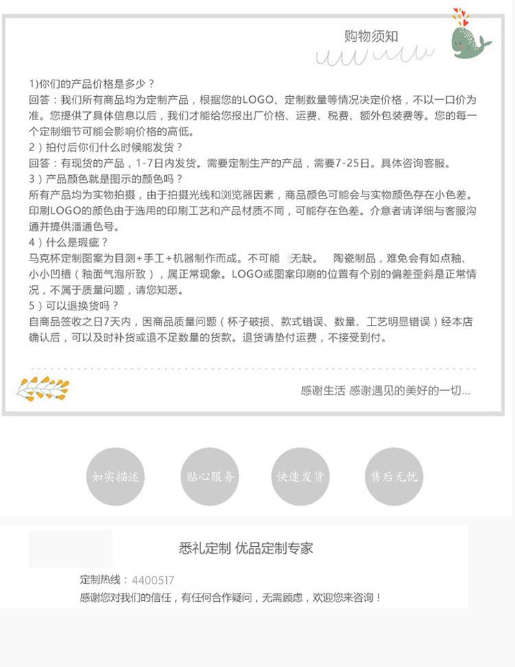 1. El precio marcado es para tazas de porcelana blanca ordinaria y tazas de porcelana reforzada. Consulte al servicio de atención al cliente si se admite la personalización.