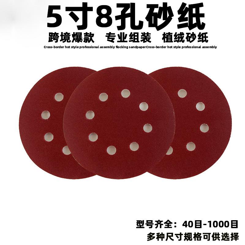 Papel de lija rojo de 5 pulgadas y 8 agujeros para explosiones transfronterizas de Amazon, lija flocada de 125 mm, papel de lija seco de 6 pulgadas y 6 agujeros, papel de lija para traje.