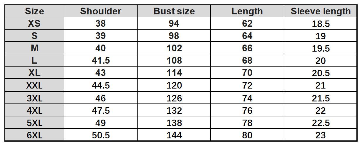 XS, S, M, L, XL, XXL, 3XL, 4XL, 5XL, 6XL