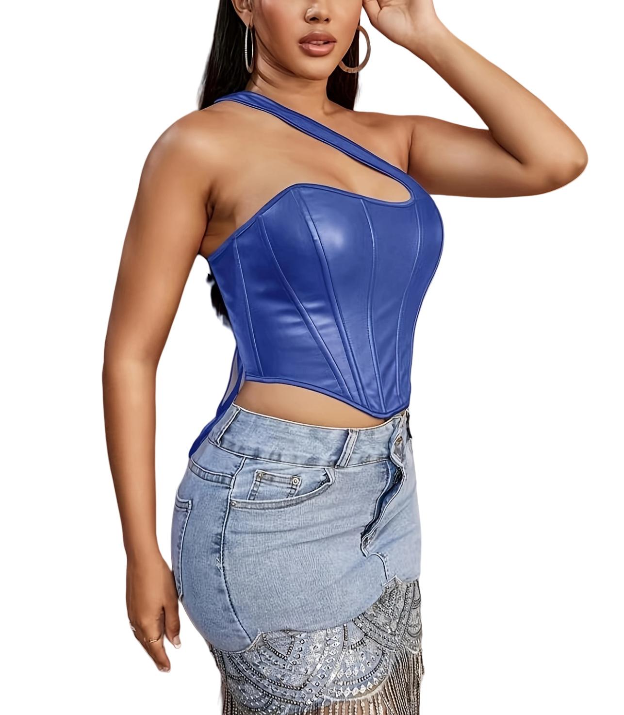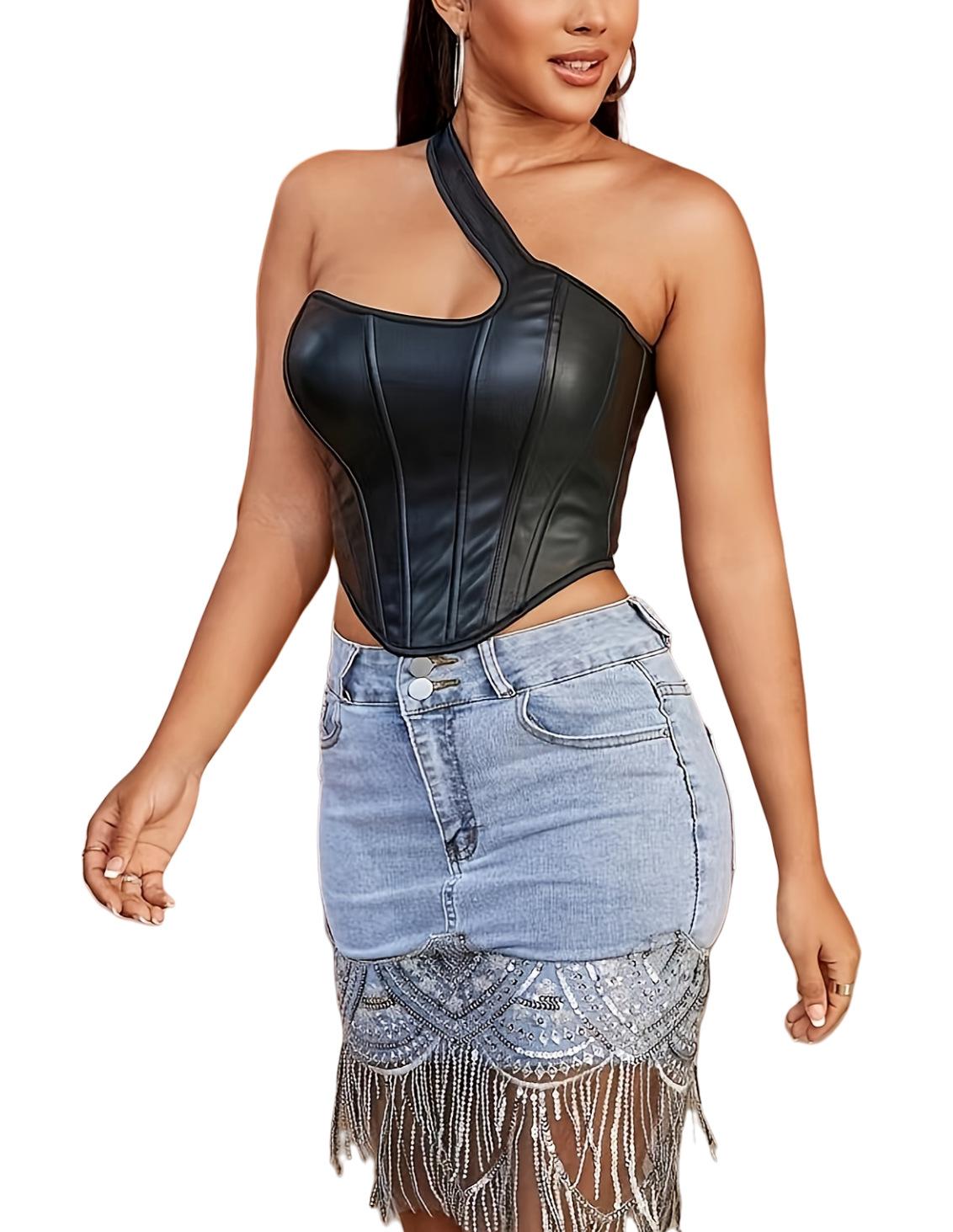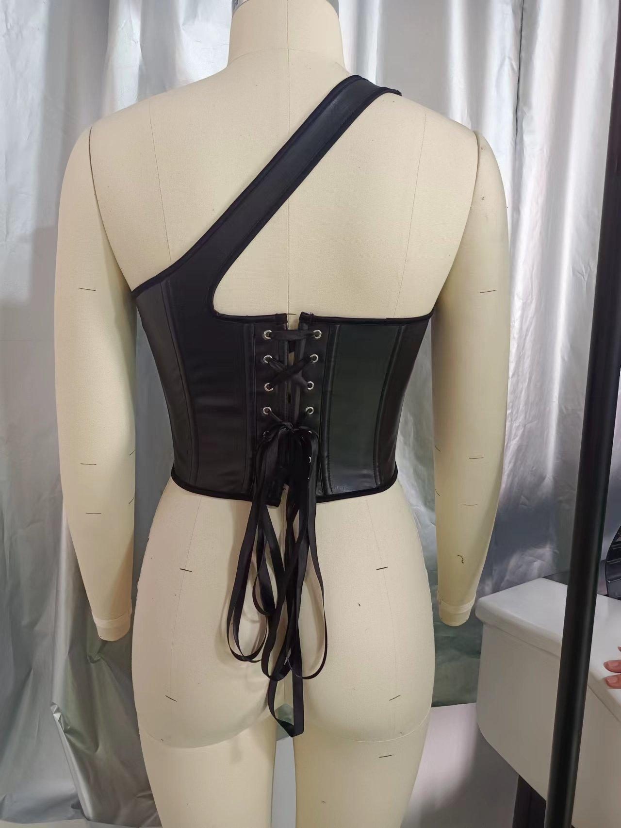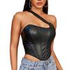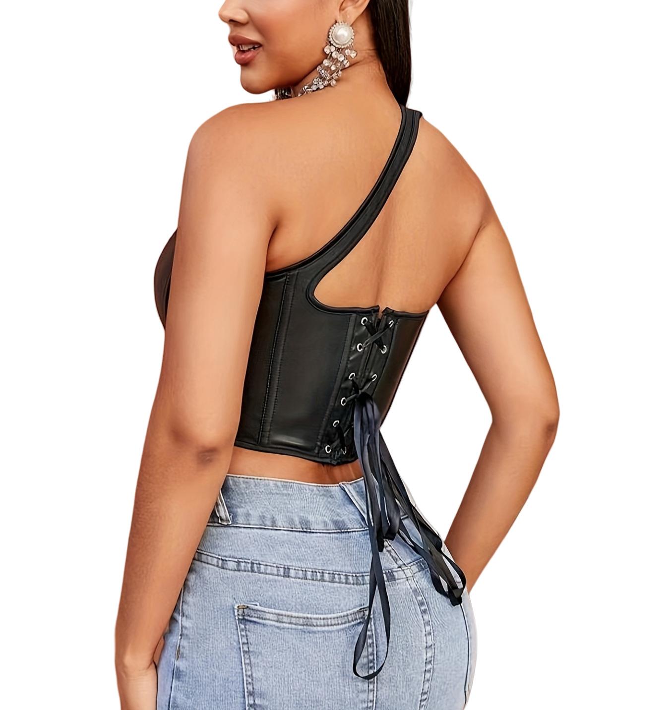 Nuevo Top Moldeador de Cuerpo de Cuero PU Transfronterizo Europeo y Americano, Chaleco de un Hombro, Sujetador de Ballena de Moda para Mujer, Corsé Sexy sin Espalda