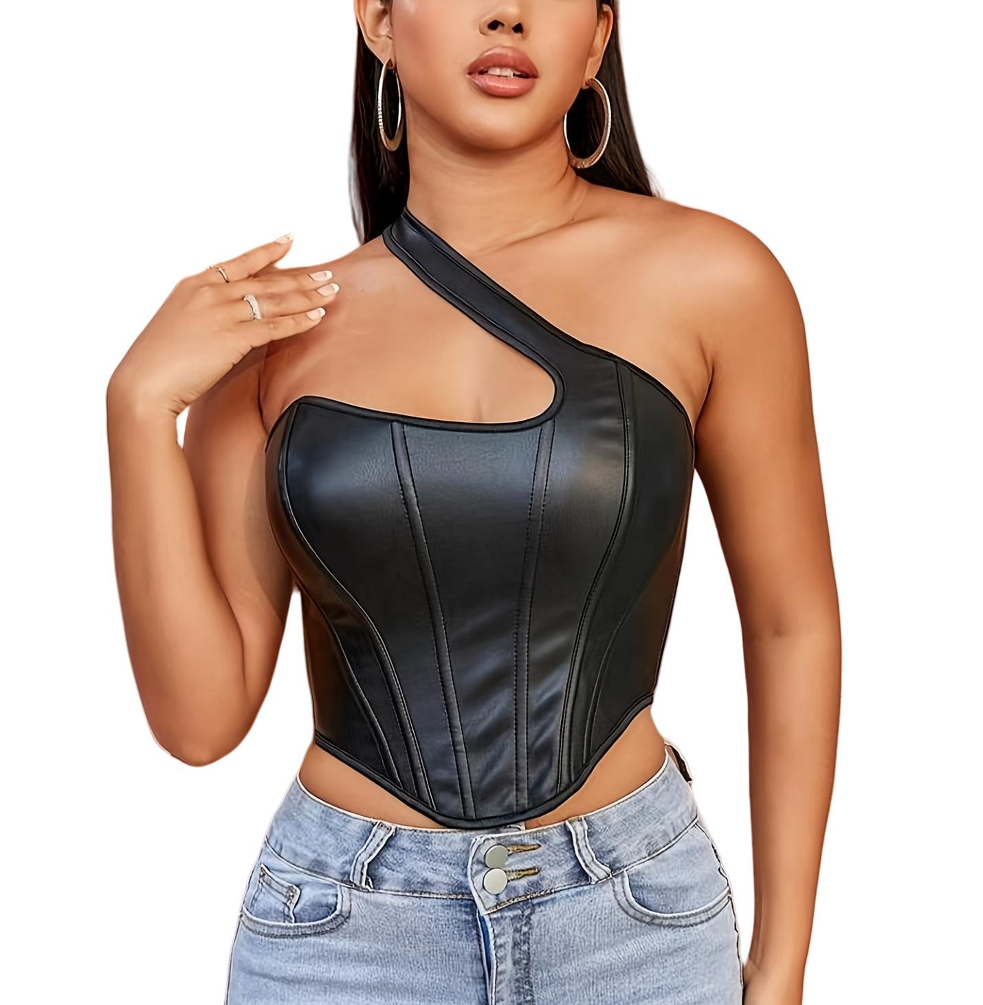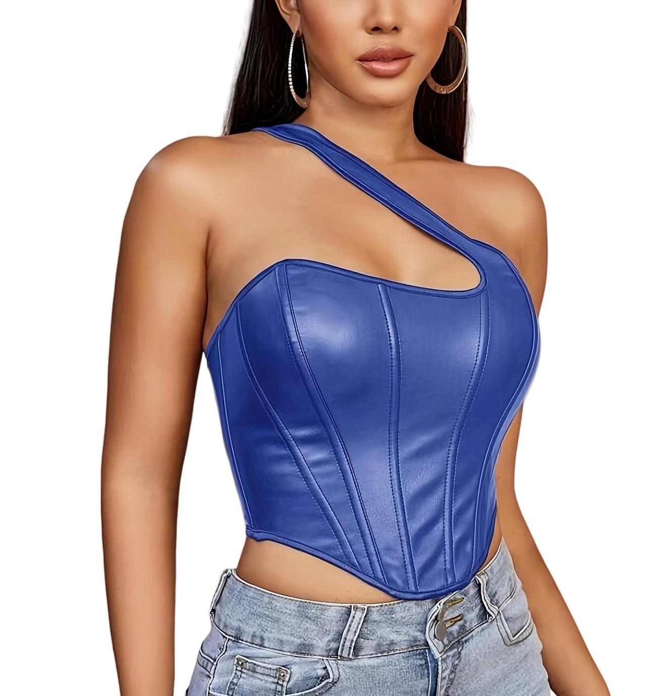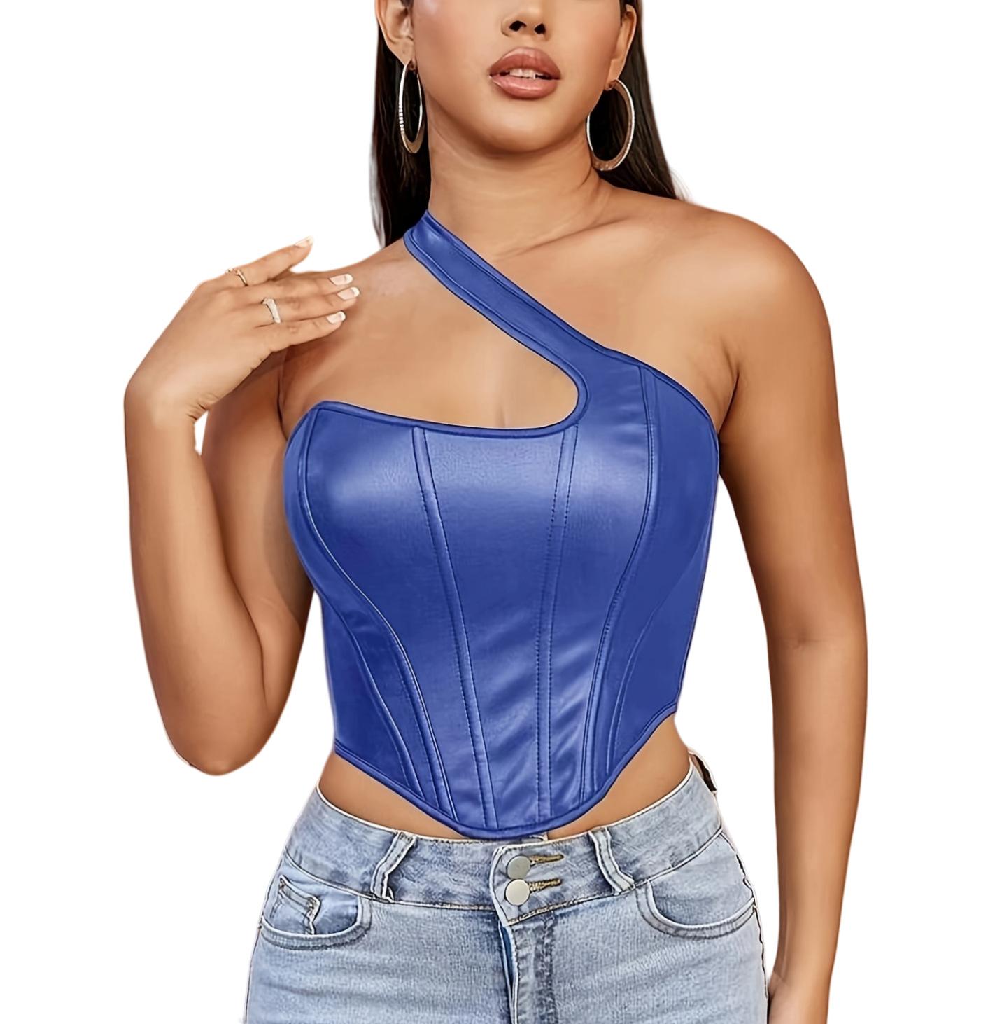 Nuevo Top Moldeador de Cuerpo de Cuero PU Transfronterizo Europeo y Americano, Chaleco de un Hombro, Sujetador de Ballena de Moda para Mujer, Corsé Sexy sin Espalda