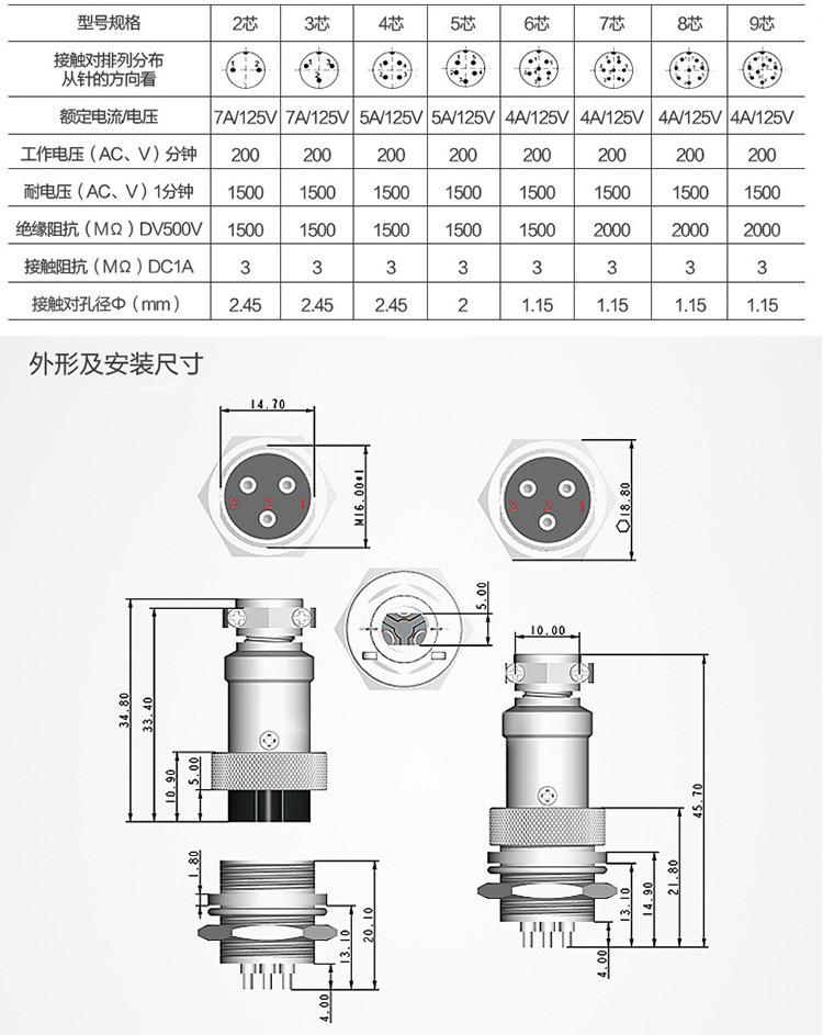 Tensión nominal: 400V para pares de contactos de 2, 3 y 4 núcleos; 250V para pares de contactos de 5, 6, 7 y 8 núcleos