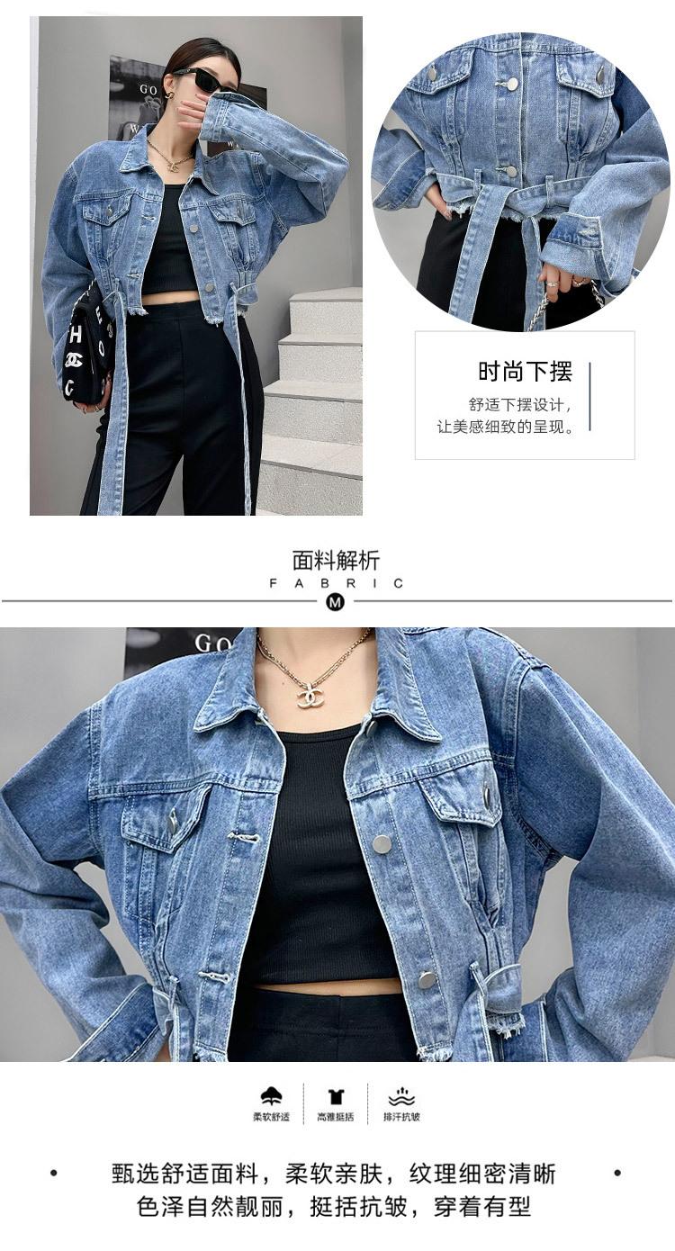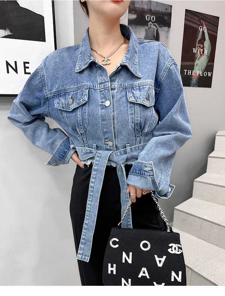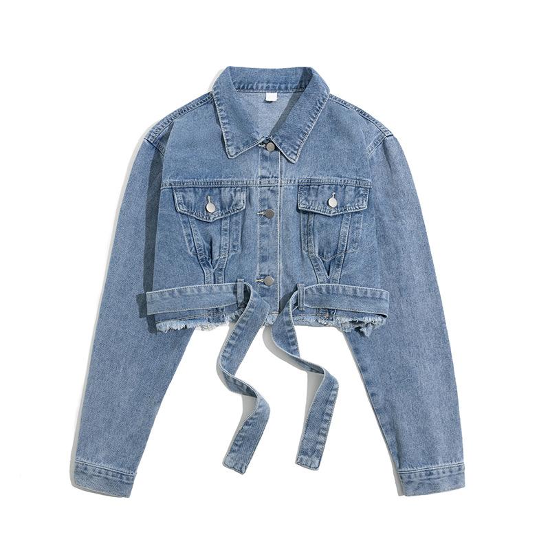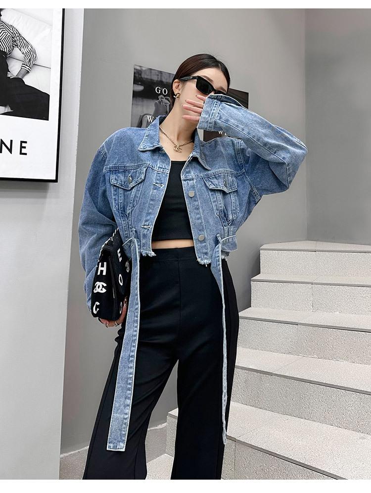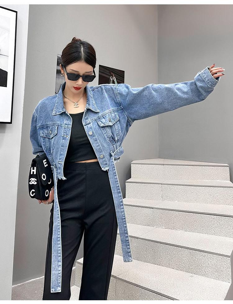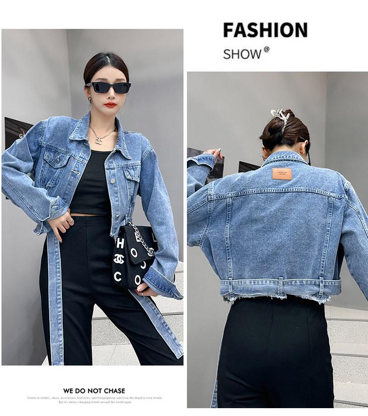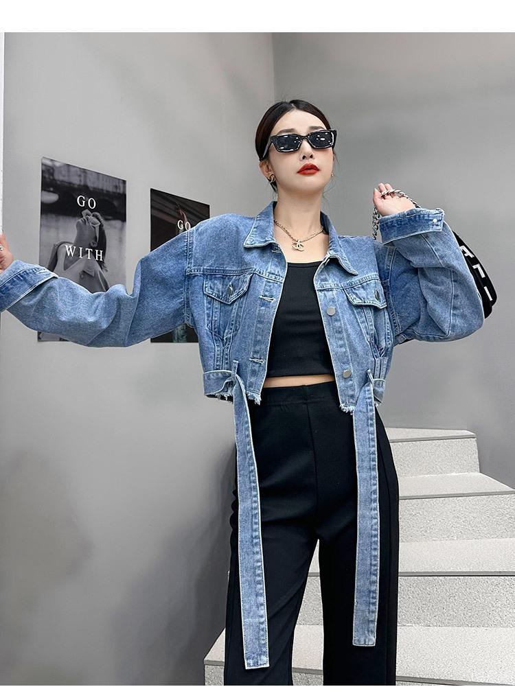 Chaqueta vaquera de estilo europeo para mujer, primavera 2023, nueva chaqueta de estilo coreano a la moda, ajustada, con cordones y corte entallado.