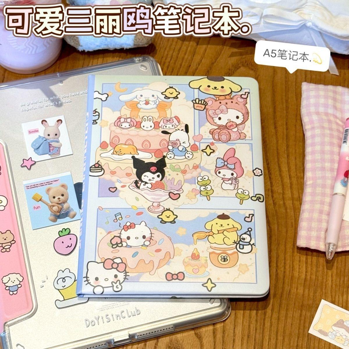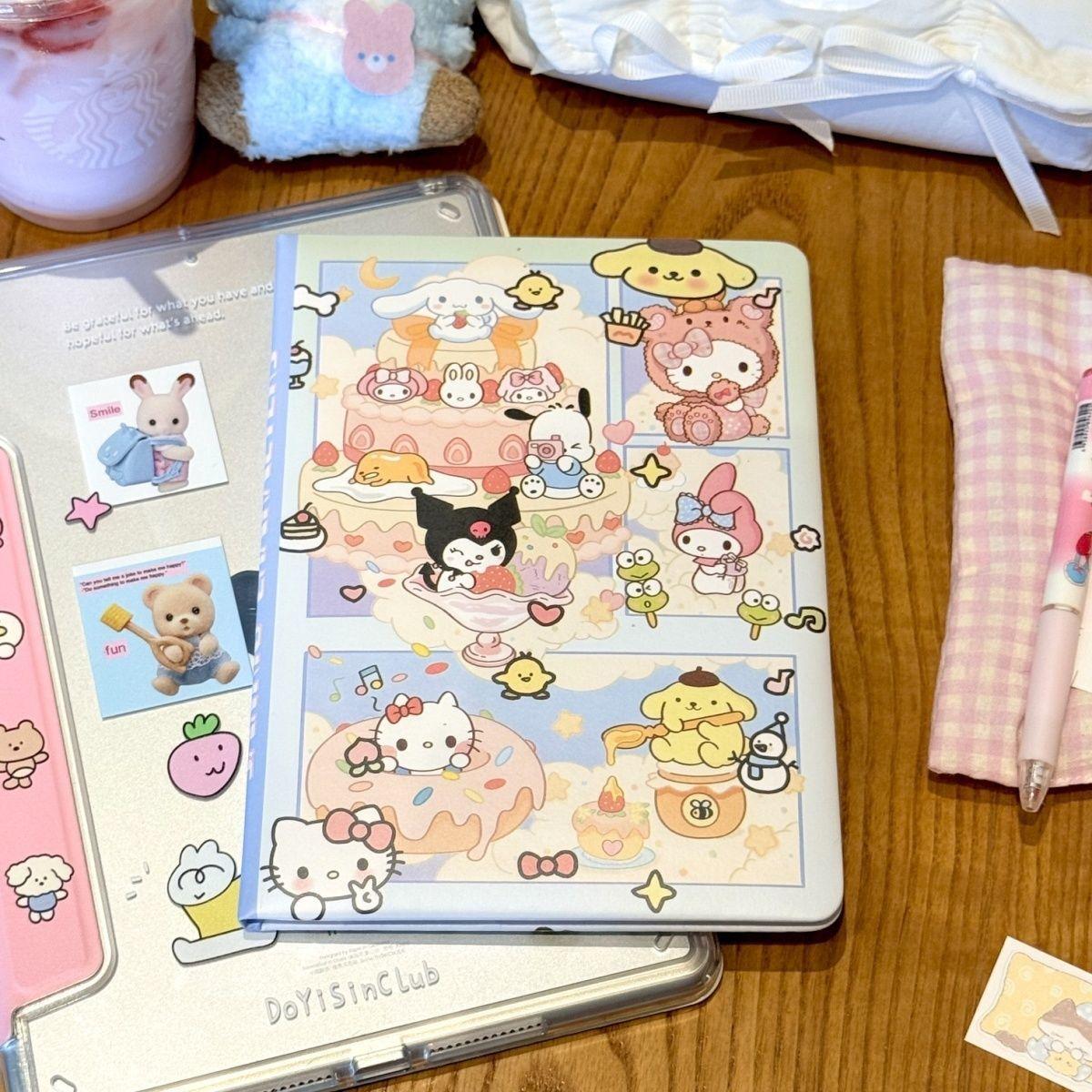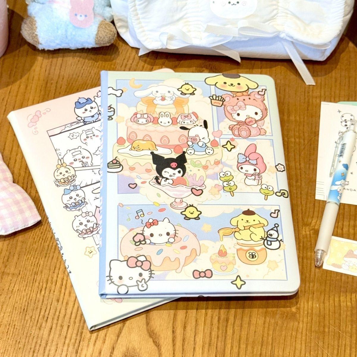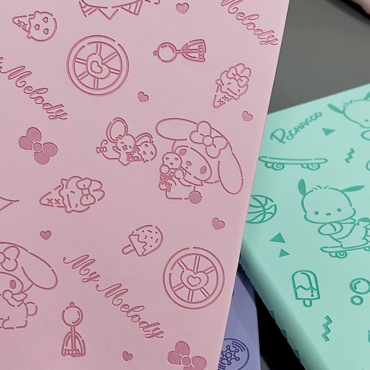 Lindo Cuaderno de Cuero Estampado Sanrio, Página para Colorear de Aspecto Sofisticado, Bloc de Notas de Dibujos Animados, Diario de Papelería para Estudiantes