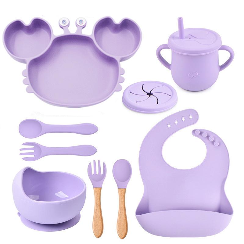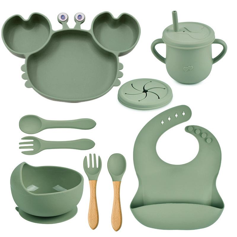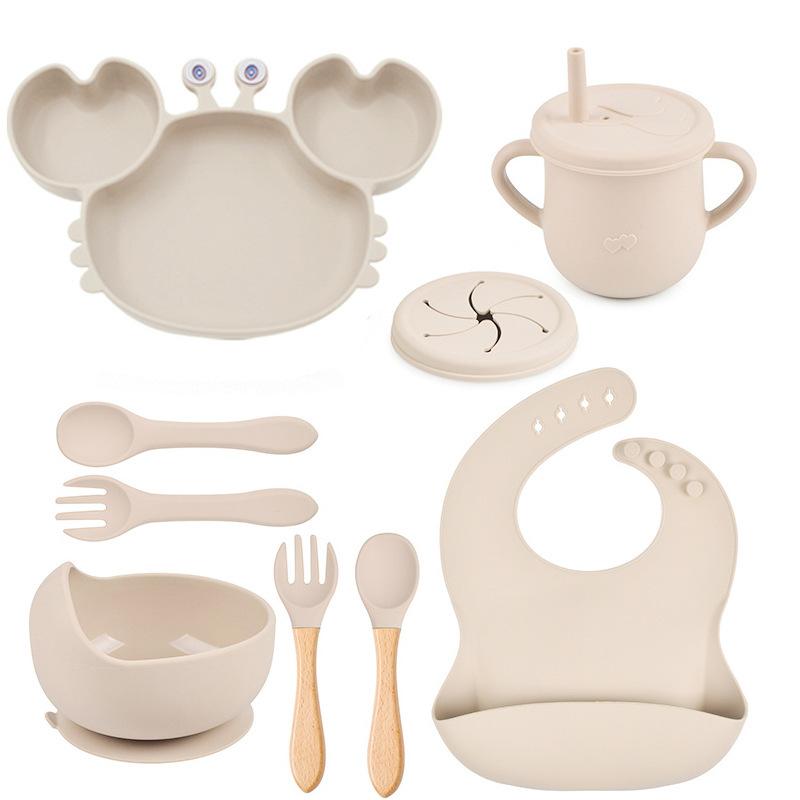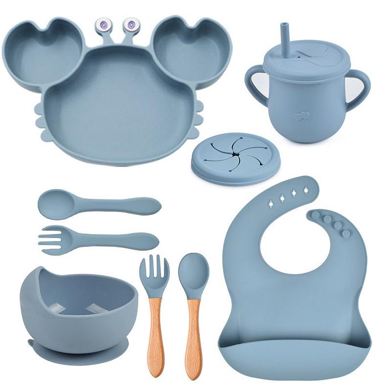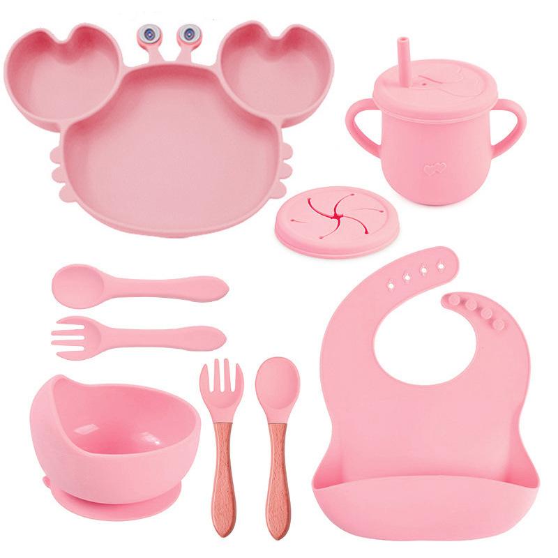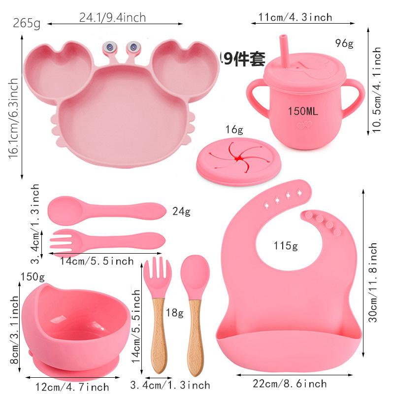 Plato de cena de cangrejo, plato de cena de silicona para niños, tazón de bebé con ventosa antideslizante, juego de vajilla de 9 piezas en stock, multicolor