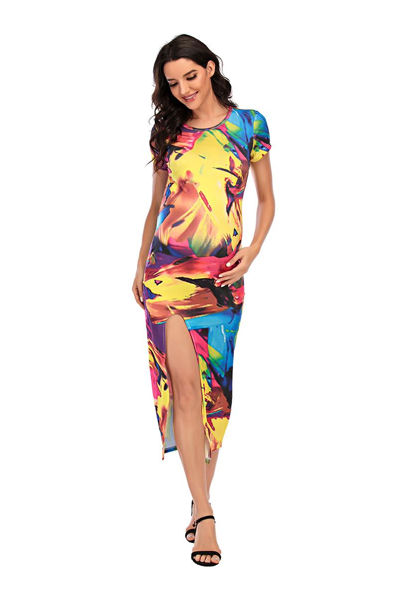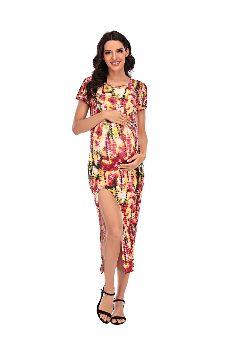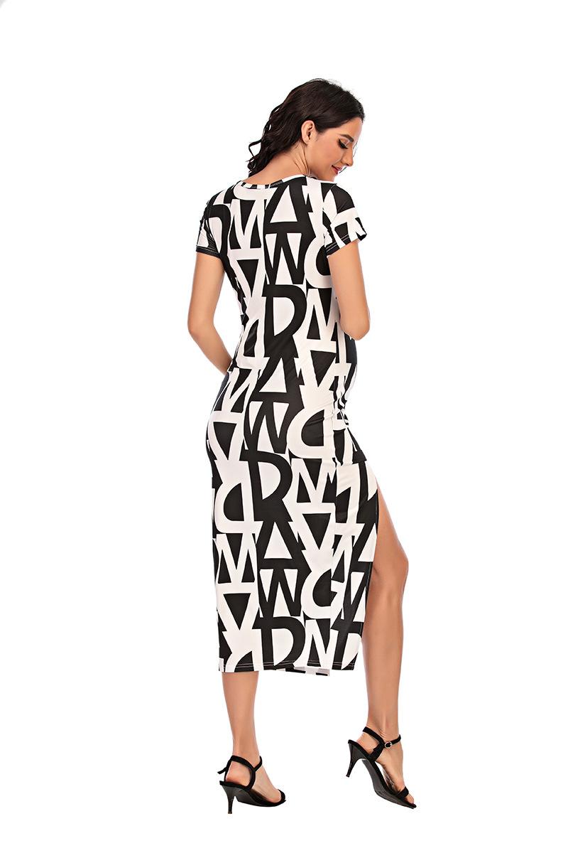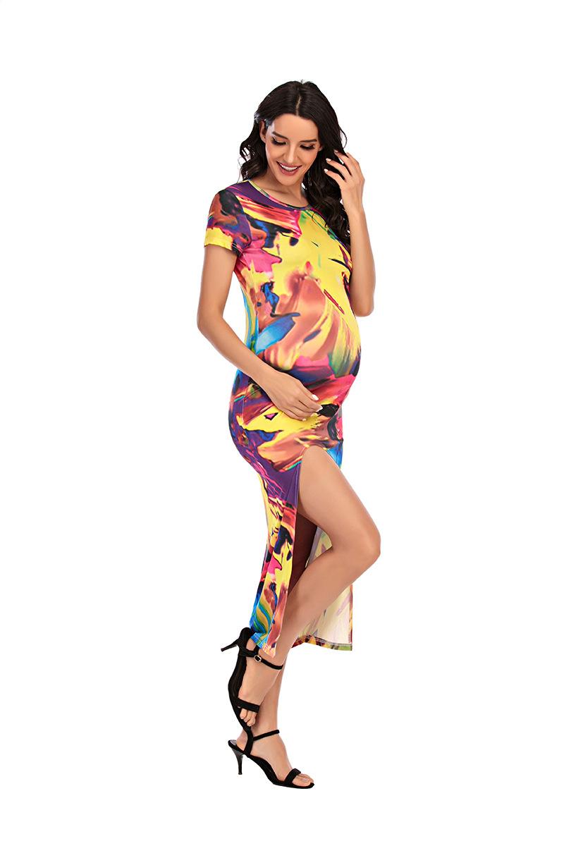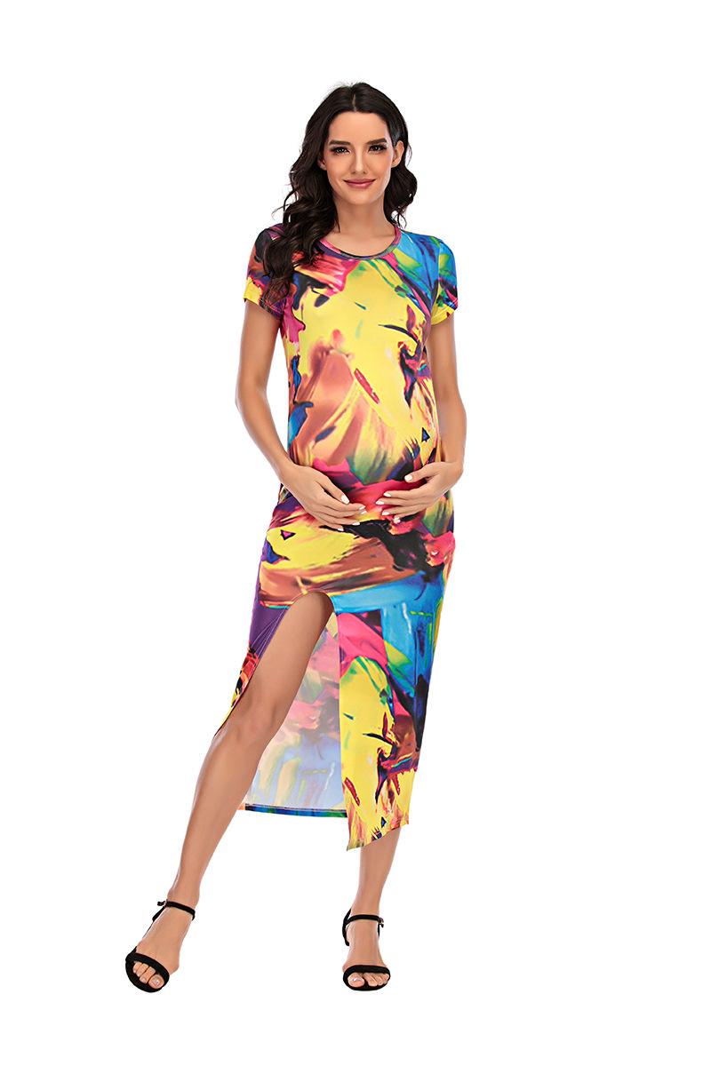 6185# AliExpress impresión digital ropa europea y americana para mujer nuevo cuello redondo manga corta abertura vestido de maternidad vestido en stock