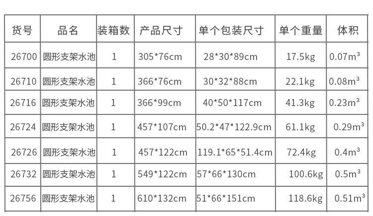 Tabla de parámetros del número de artículo de la piscina redonda con soporte Bestway: