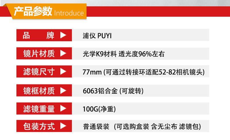 Contenido de la caja: Filtro de 77 mm*1 Bolsa para filtro*1 Paño de fibra libre de polvo*1 Caja de embalaje*1