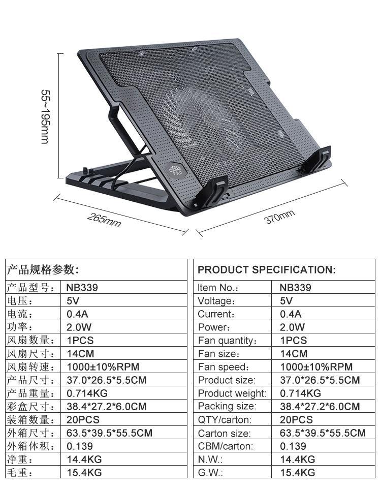 La base de enfriamiento para computadora portátil B339 es adecuada para levantar y ajustar el radiador de la computadora portátil de 14 y 17 pulgadas.