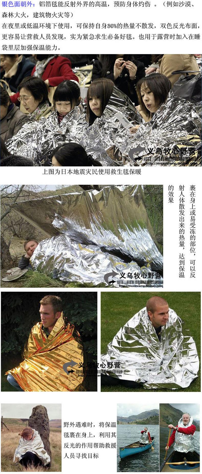 Las mantas salvavidas de emergencia se ven a menudo en televisión, por ejemplo, en escenas de accidentes automovilísticos y diversas escenas de desastres donde se rescata a heridos. Envolver a los heridos con una manta salvavidas de emergencia puede prevenir eficazmente la pérdida de calor corporal, aumentar las probabilidades de supervivencia y crear las condiciones para un mejor rescate en el futuro.