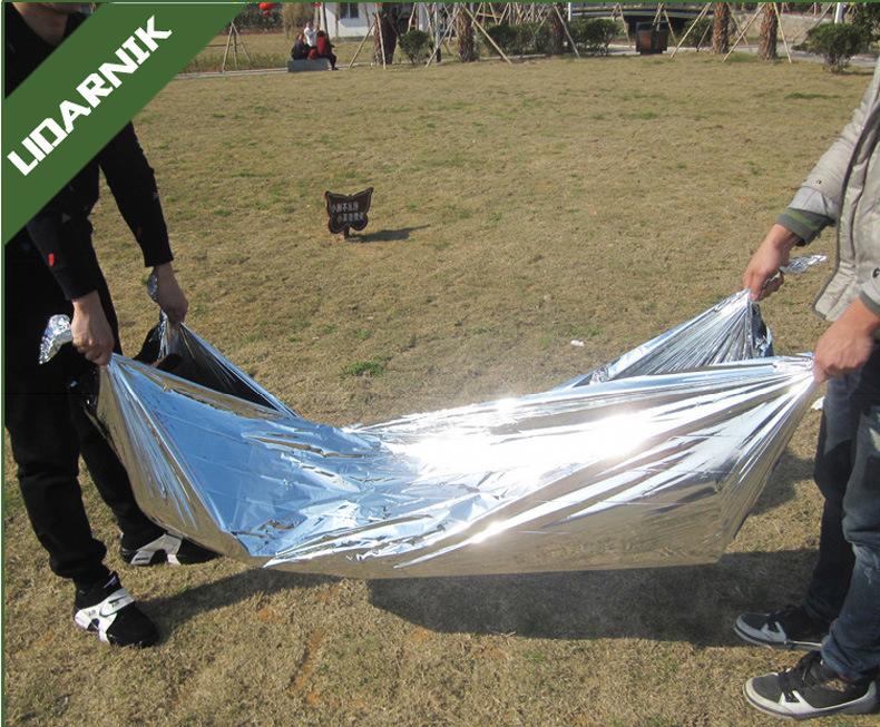 Por supuesto, la manta salvavidas de emergencia sigue siendo una manta. Gracias a su gran superficie, su buen aislamiento térmico y del frío, y su total impermeabilidad, satisface plenamente las necesidades de las actividades al aire libre. Como tela para el suelo de una tienda de campaña, evita que la humedad y el frío entren en contacto con el cuerpo; como tela para cubrirla, proporciona una barrera adicional tanto en veranos calurosos como en inviernos fríos. Dado que el revestimiento plateado refleja el calor, cubrir la tienda con esta capa de película reflectante bajo el intenso sol del verano la mantiene fresca. Al acampar al aire libre en invierno, cubrir la tienda con esta capa de película reflectante refleja la mayor parte del calor emitido por el cuerpo humano, aumentando así la temperatura interior.