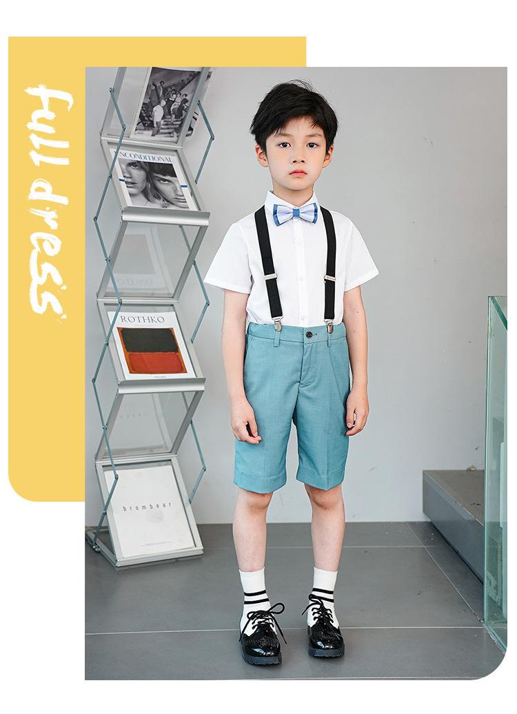 8028 short-sleeved white shirt + khaki striped shorts + black suspenders + khaki striped bow tie, 8028 short-s...