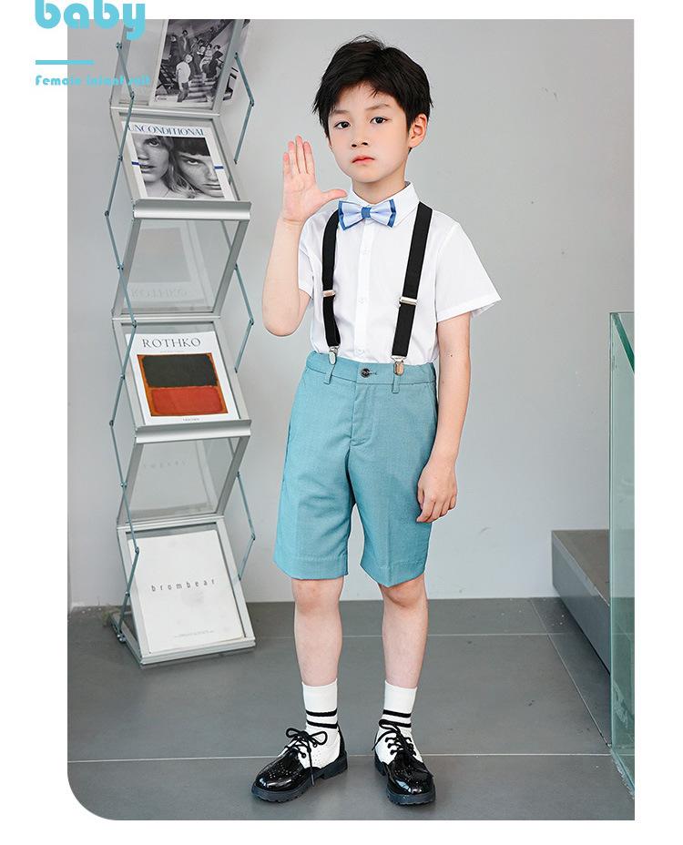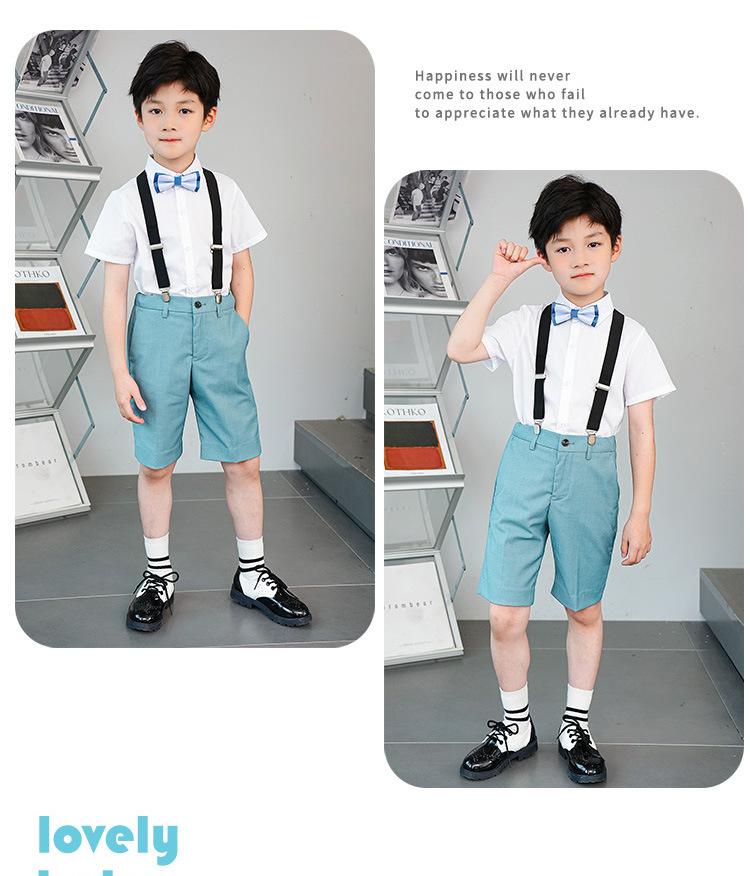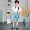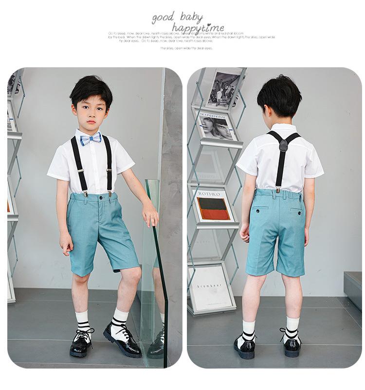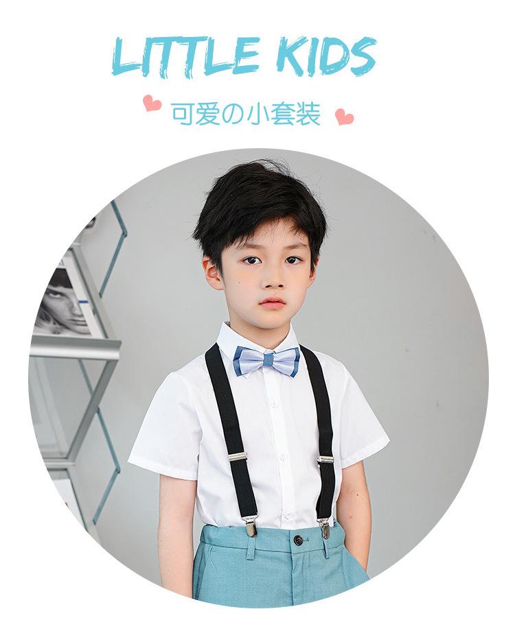 8008 lake blue shorts + short-sleeved shirt + black suspenders + double blue bow ties