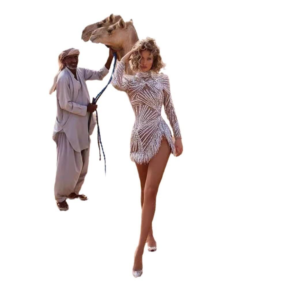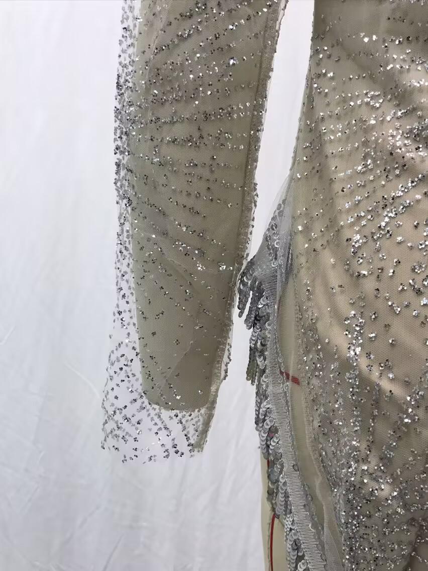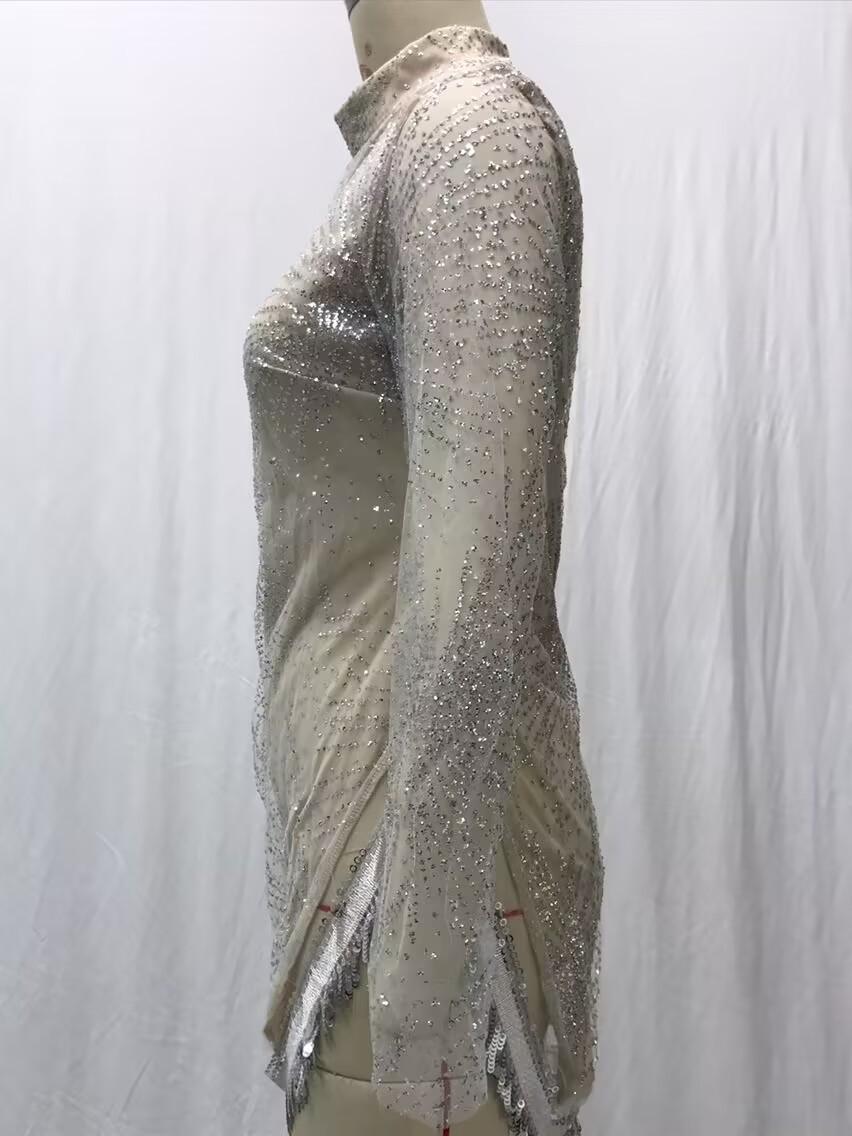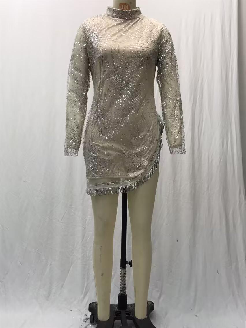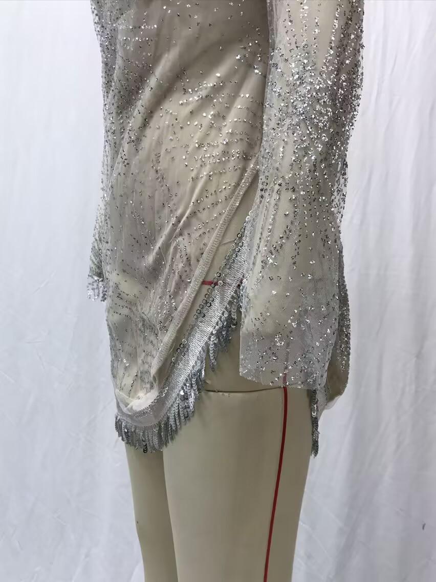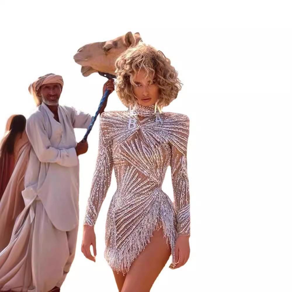 2025 Primavera y Verano Transfronterizo Nuevo Ropa Europea y Americana Vestido Sexy de Manga Larga Salpicado con Borlas Doradas y Plateadas Abertura Vestido de Noche