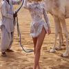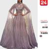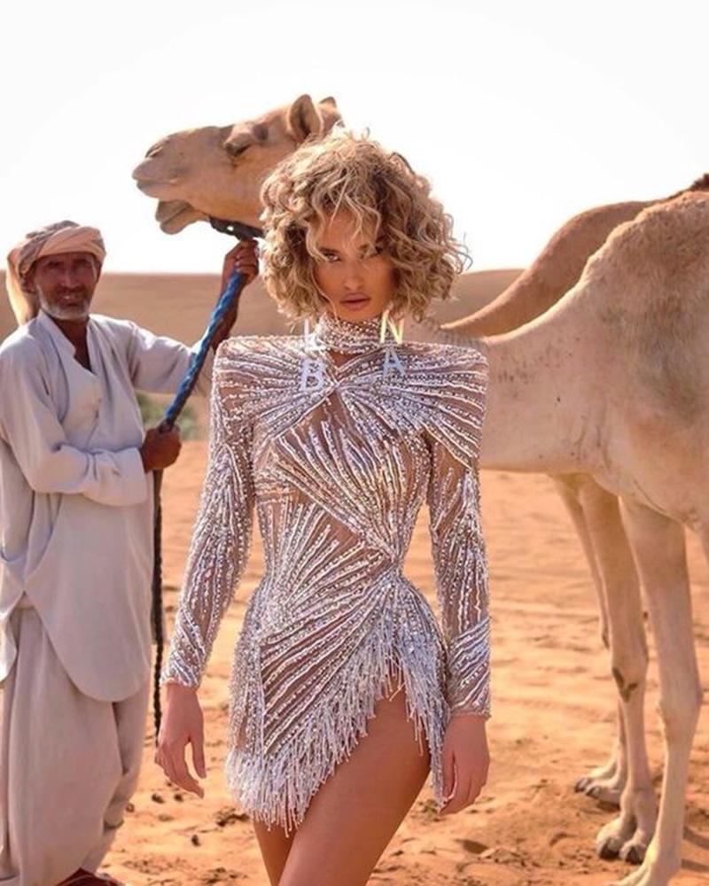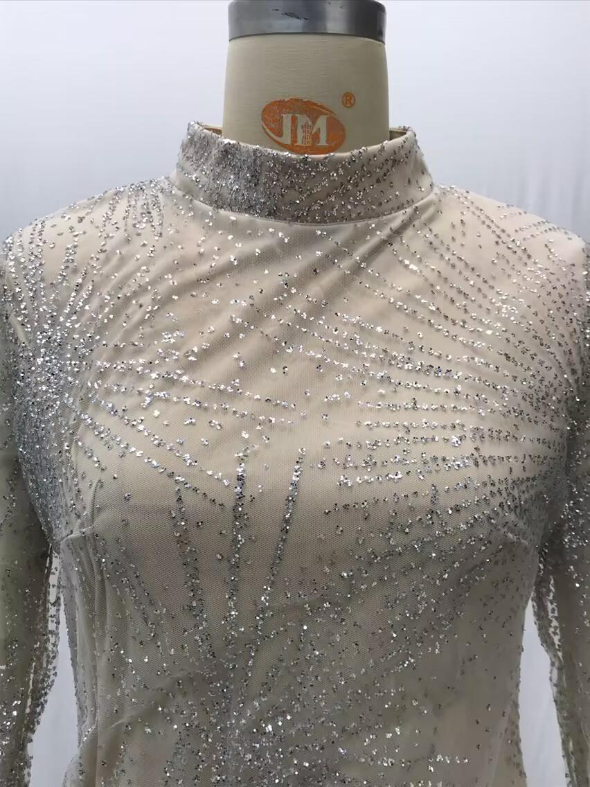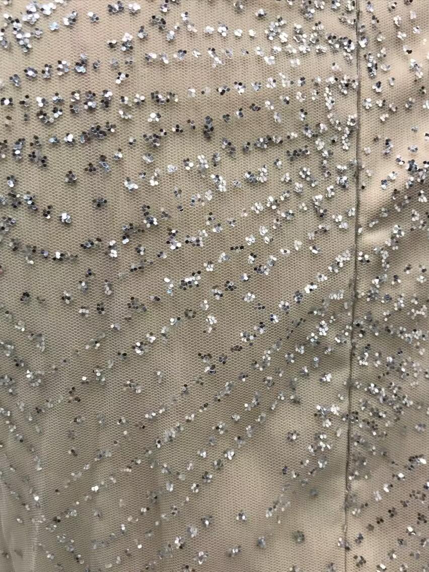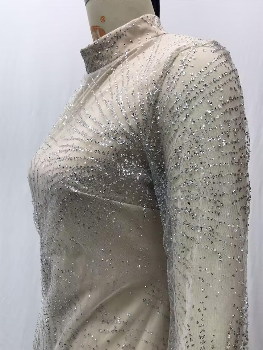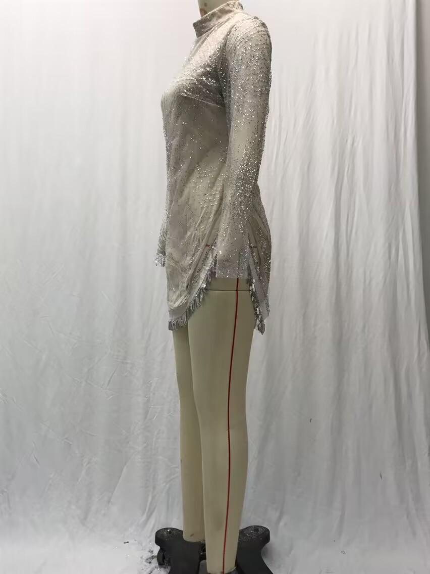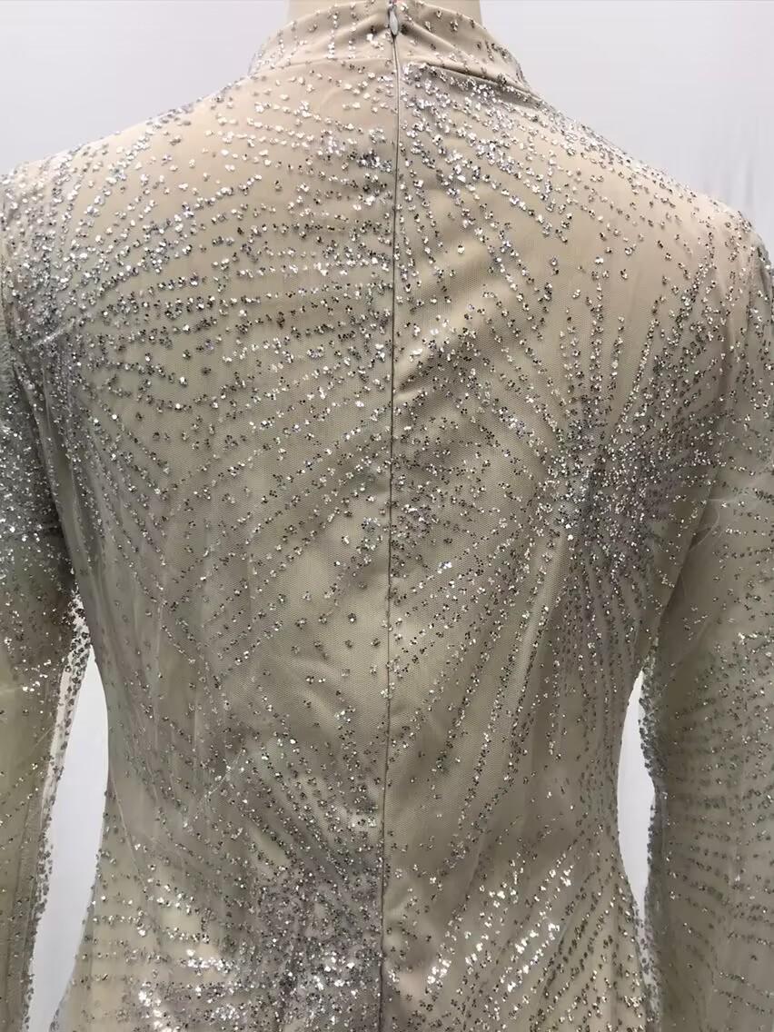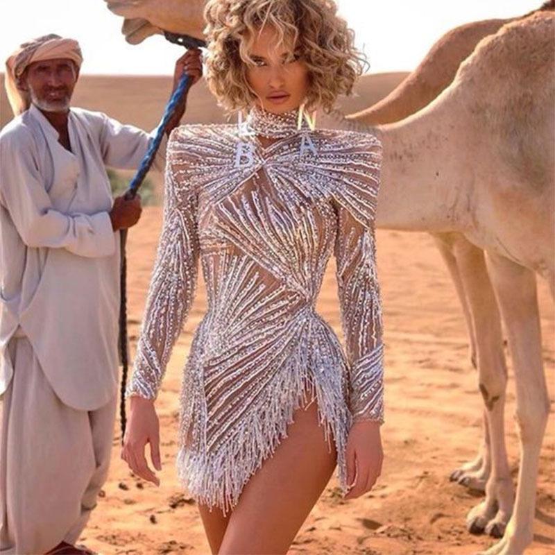 2025 Primavera y Verano Transfronterizo Nuevo Ropa Europea y Americana Vestido Sexy de Manga Larga Salpicado con Borlas Doradas y Plateadas Abertura Vestido de Noche