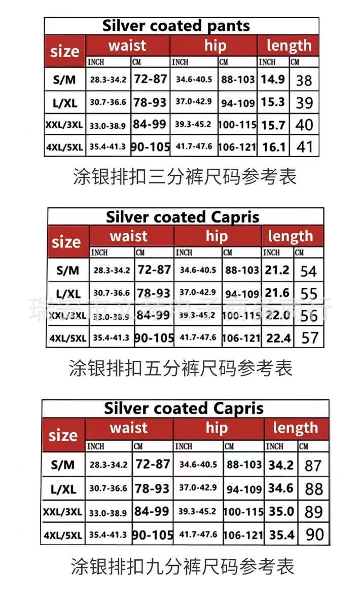 Este producto utiliza tejido totalmente recubierto, es inodoro, libre de formaldehído y no irrita la piel. El interior de los pantalones está totalmente recubierto en plata, tiene elasticidad en cuatro direcciones, es cómodo y duradero, no hace bolitas ni cambia de color, y es resistente a las arrugas. La fábrica admite fabricación personalizada y etiquetado privado según los estilos y tallas del cliente. Los logotipos se pueden personalizar.