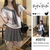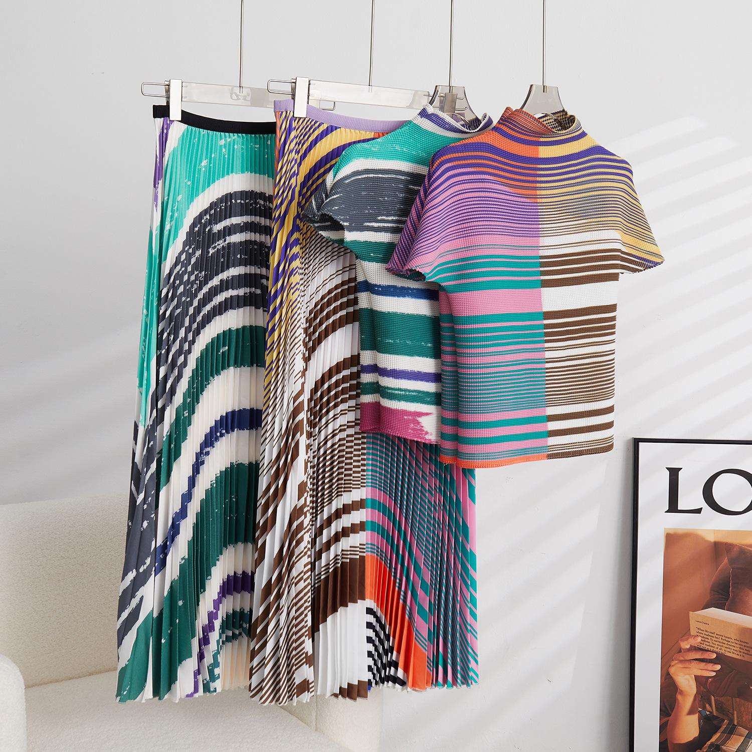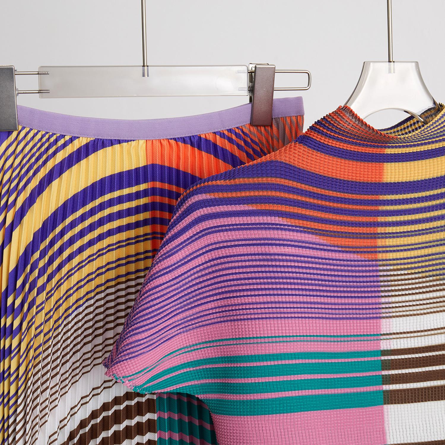 Ropa de gran venta de Xiaohongshu, traje plisado de moda para mujer, top ajustado estampado, falda plisada de manga larga, traje de dos piezas |