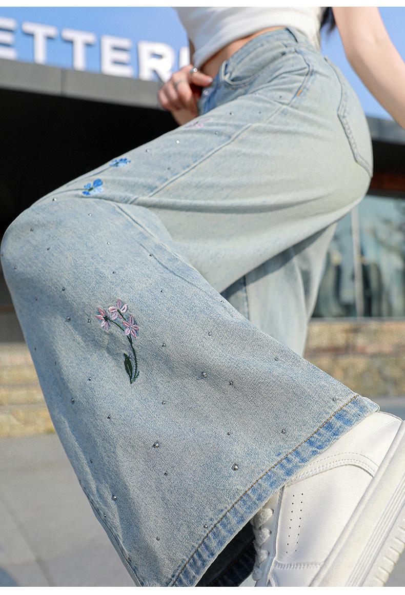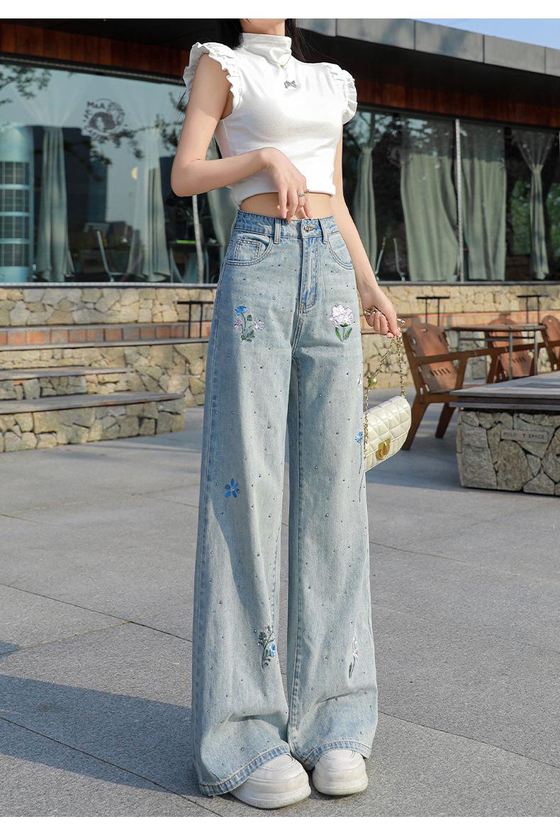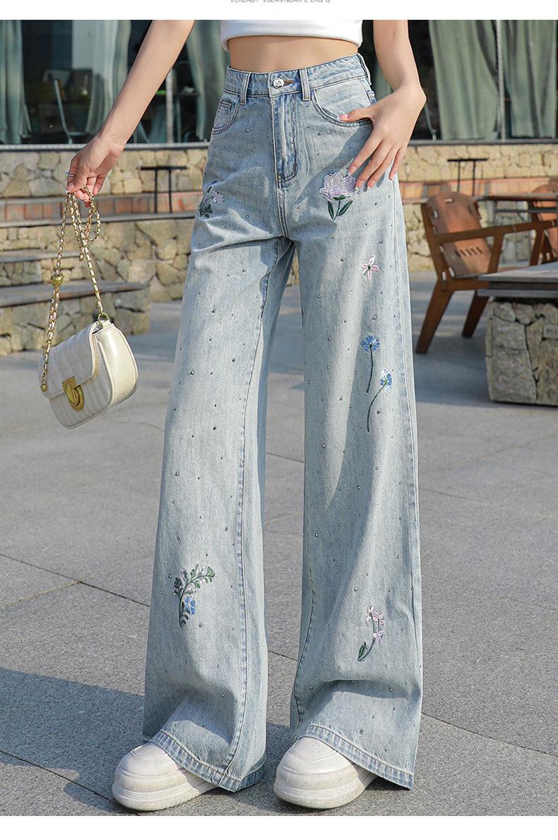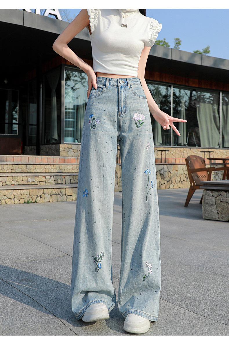 Pantalones Retro de Mezclilla Azul de Pierna Ancha para Mujer 2025 Verano Nuevo Estilo Alto y Delgado Bordados Pequeños Sueltos Pantalones Largos