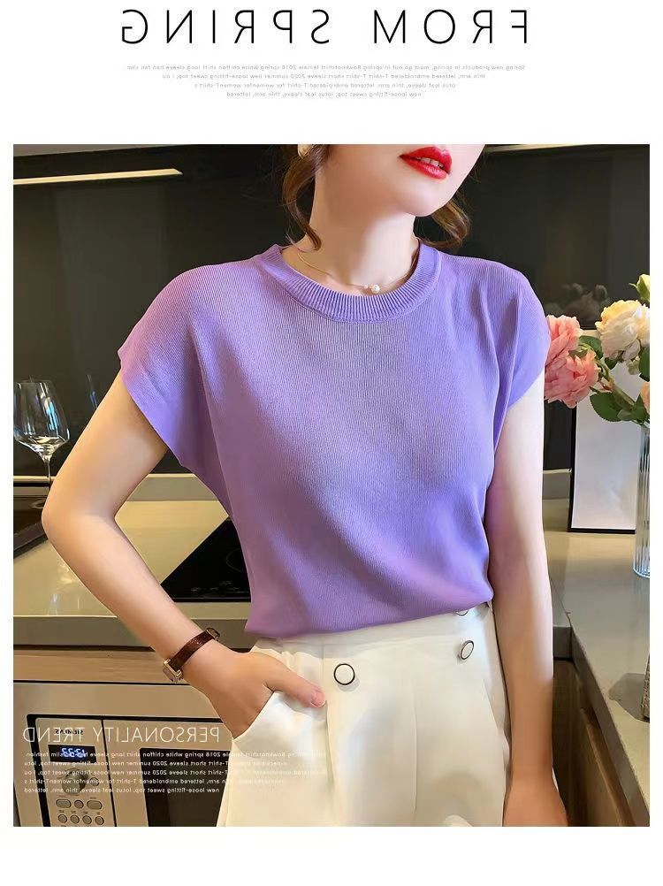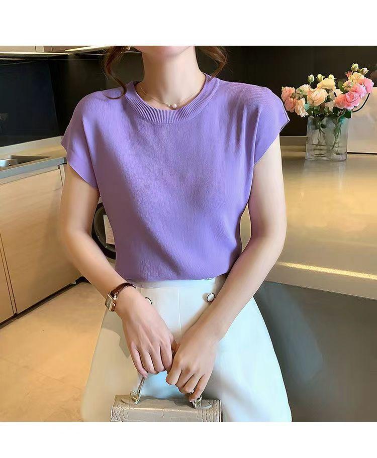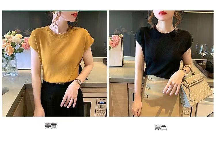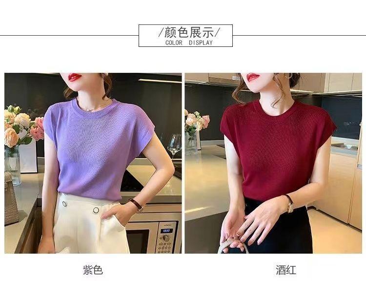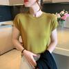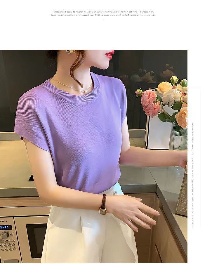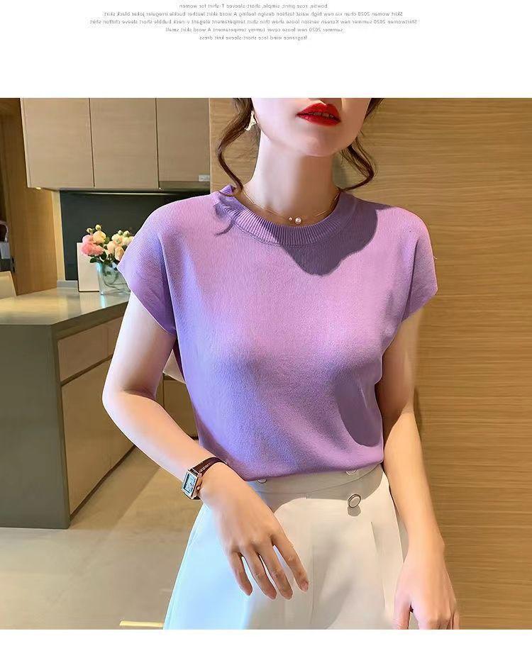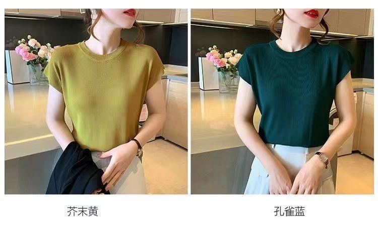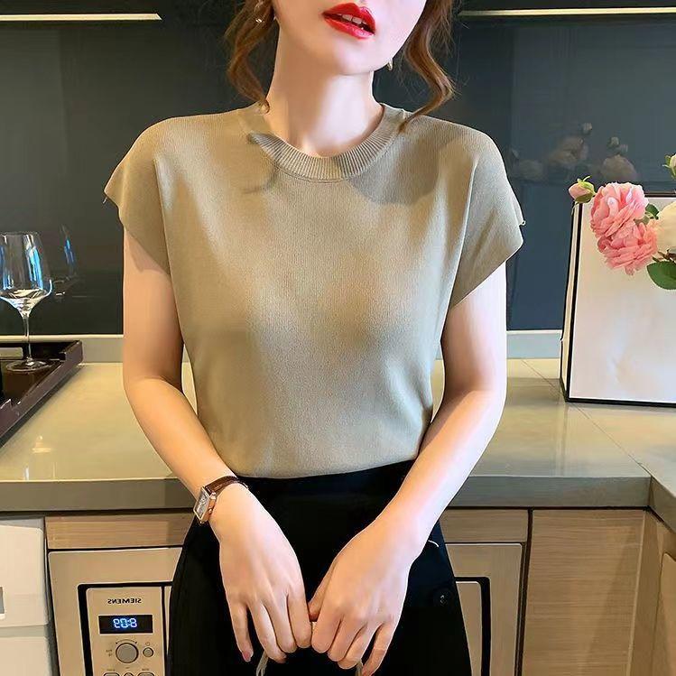 Tejido de Punto de Seda de Hielo para Mujer Verano Delgado 2022 Nuevo Estilo Holgado Cuello Redondo Color Puro Versátil Top de Manga Corta con Hombros Descubiertos