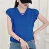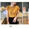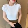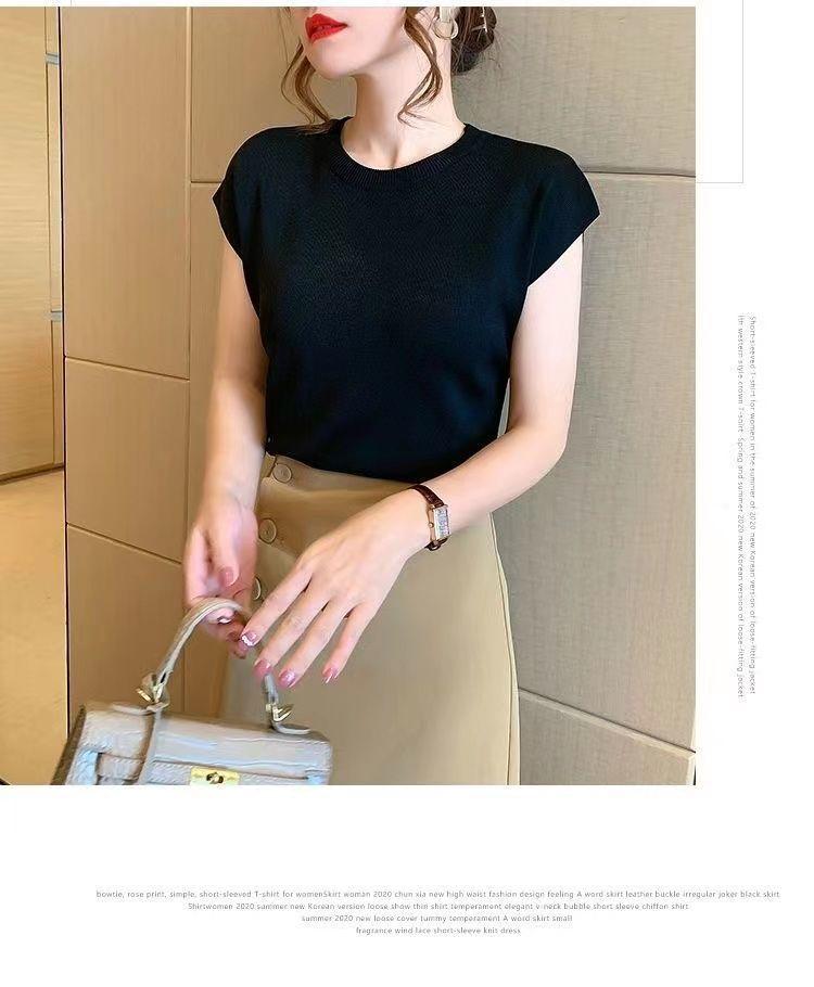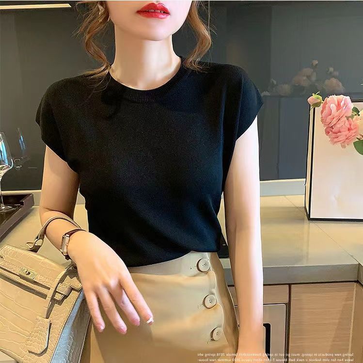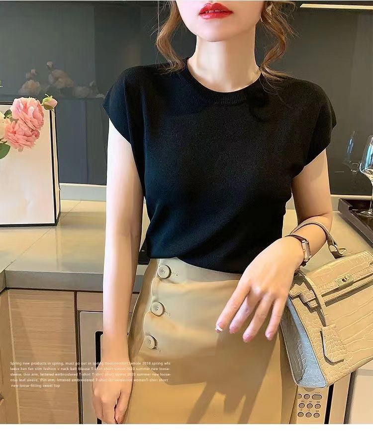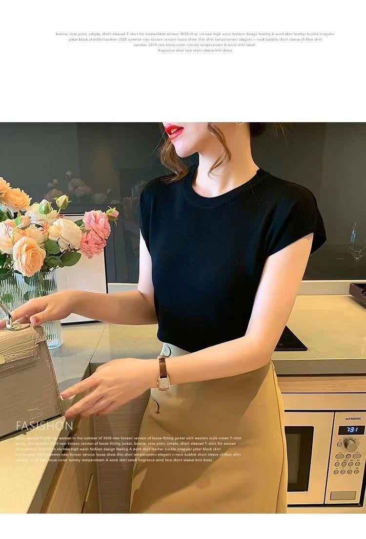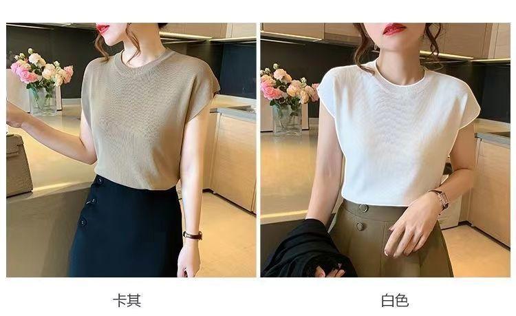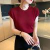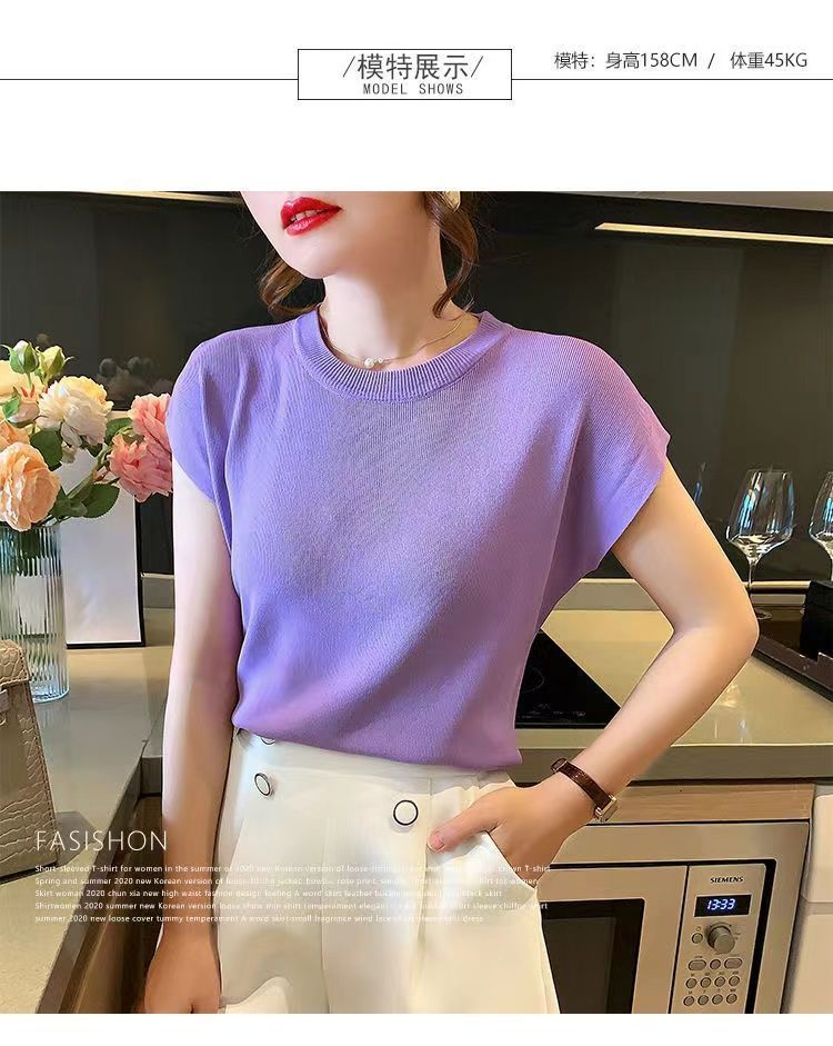Tejido de Punto de Seda de Hielo para Mujer Verano Delgado 2022 Nuevo Estilo Holgado Cuello Redondo Color Puro Versátil Top de Manga Corta con Hombros Descubiertos