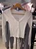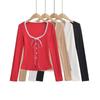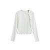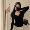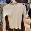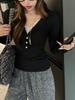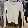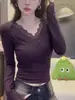 Camiseta de manga larga con cuello en V, lazo de encaje y gofre puro estilo BM para mujer, camiseta básica adelgazante de corte entallado BM