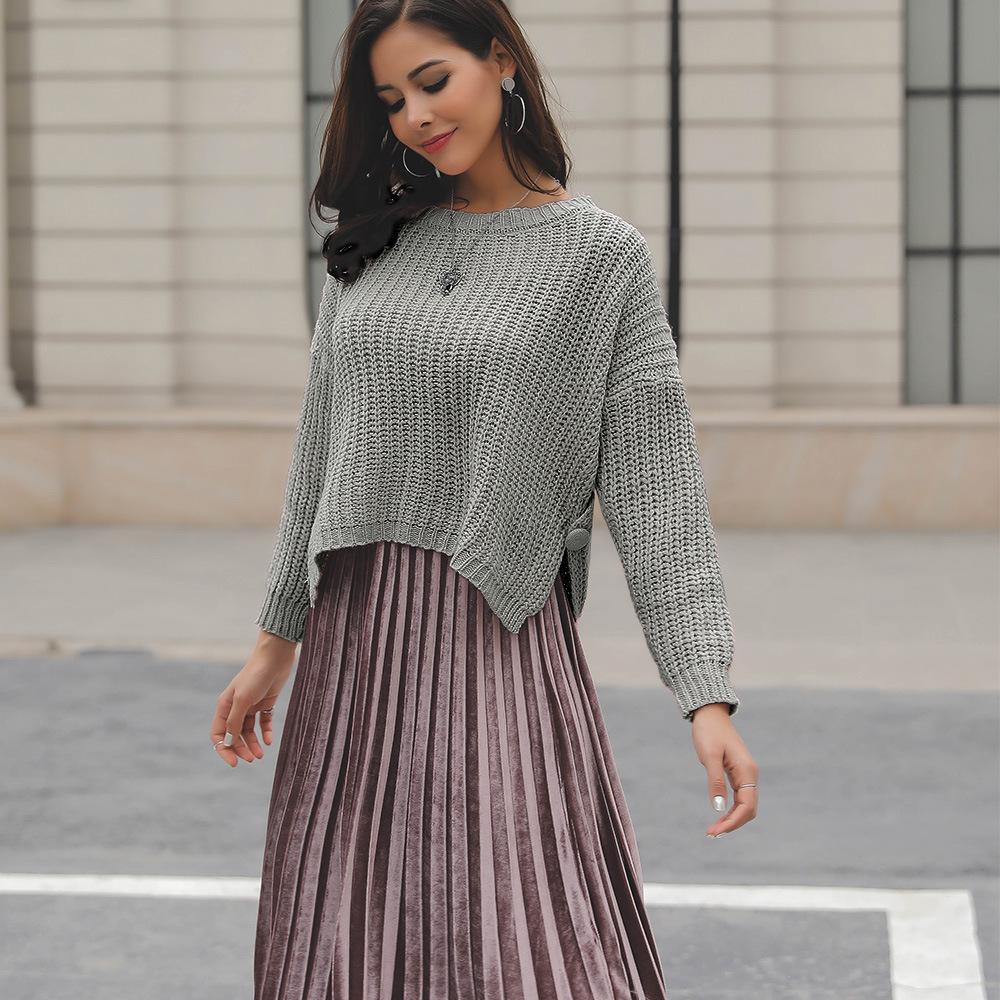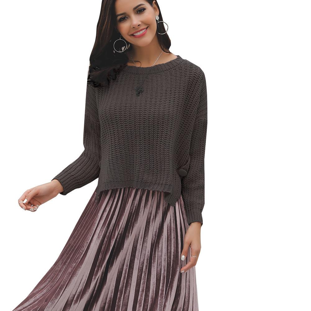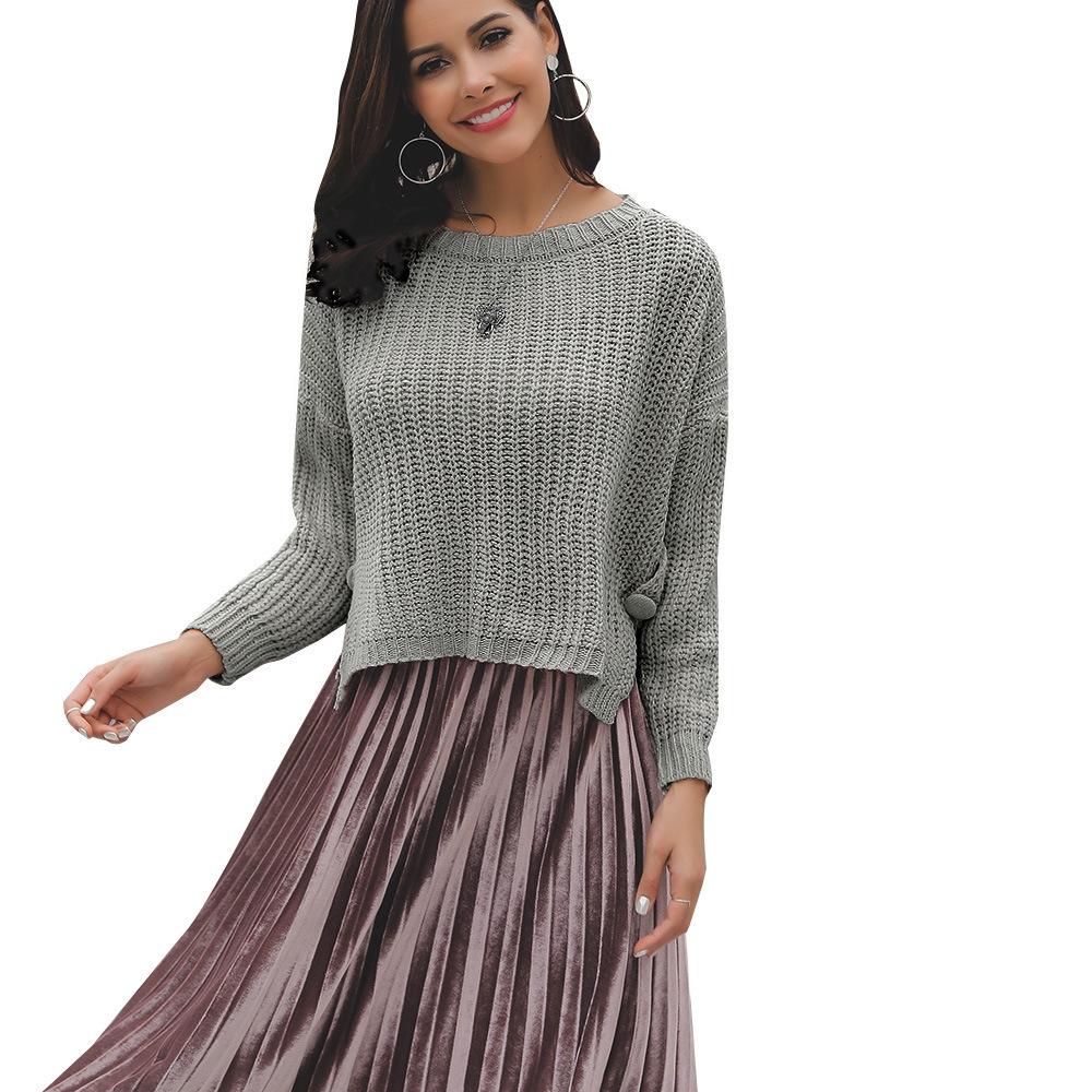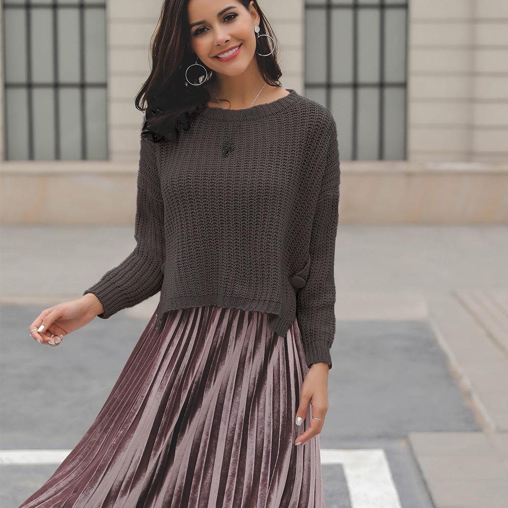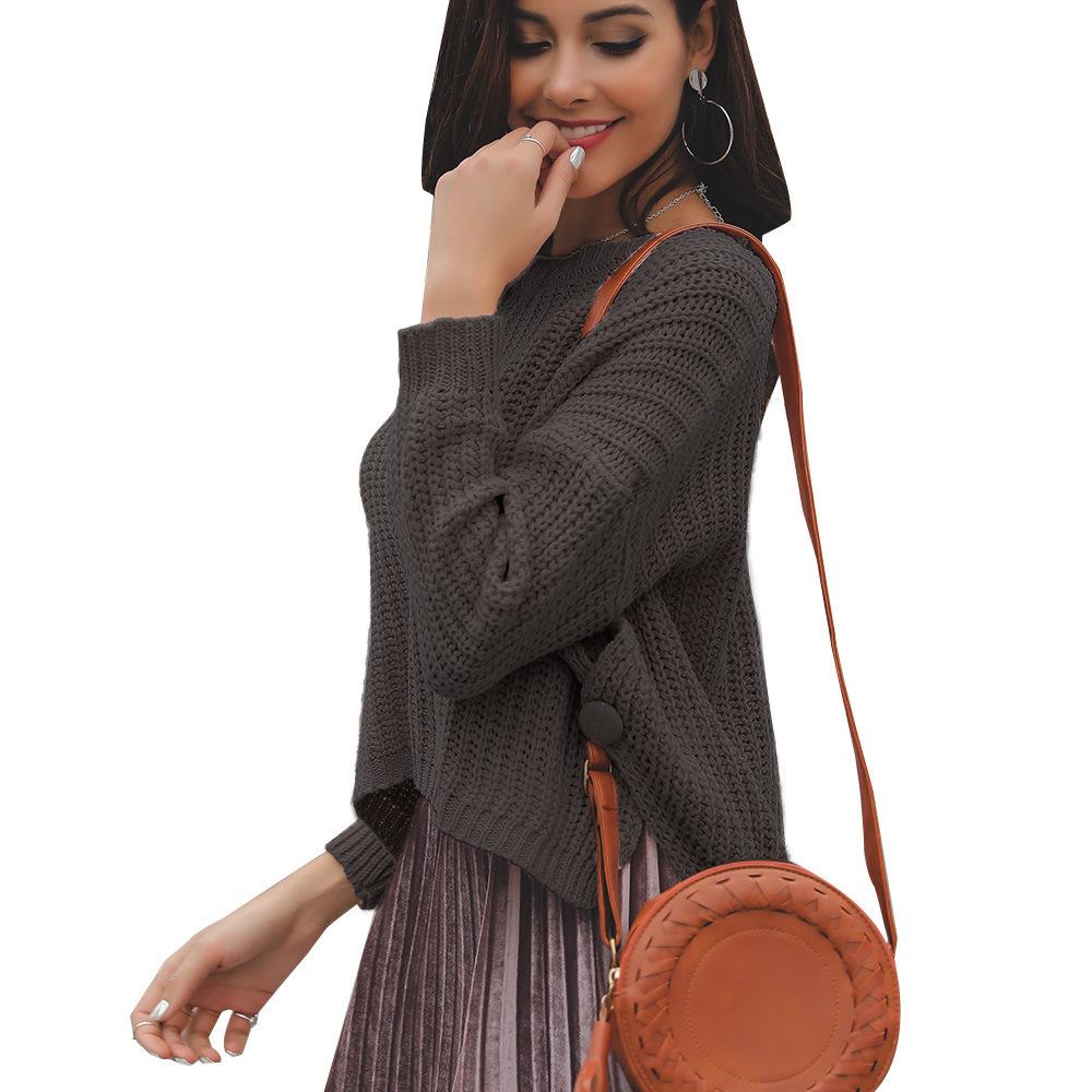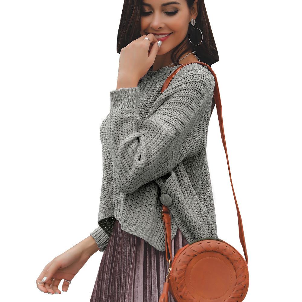 Suéter corto alto decorativo con hebilla de cartucho de punto básico de cuello redondo de color sólido de otoño e invierno para mujer de comercio exterior