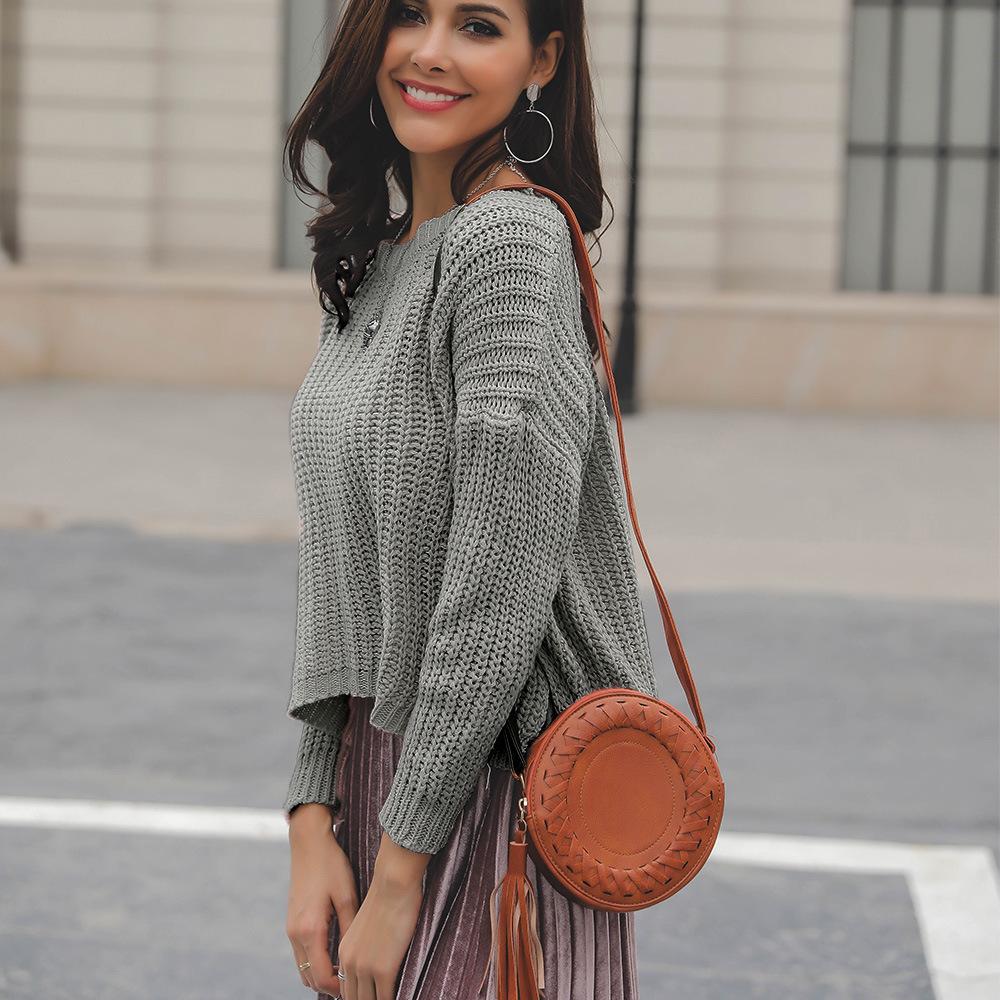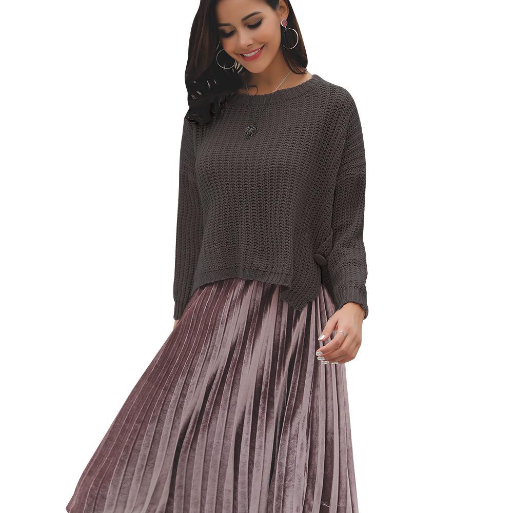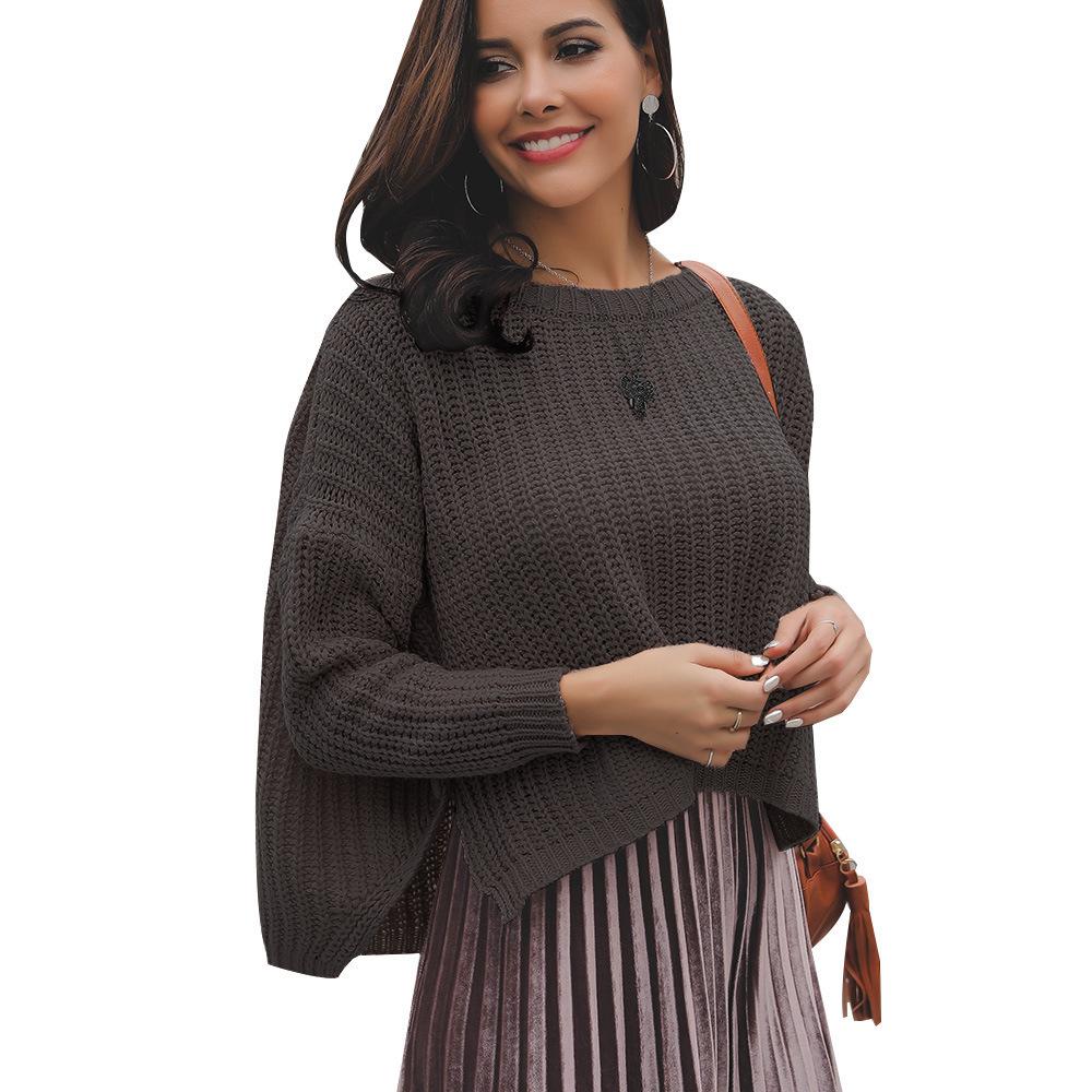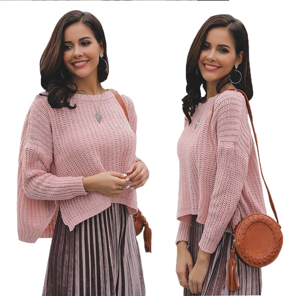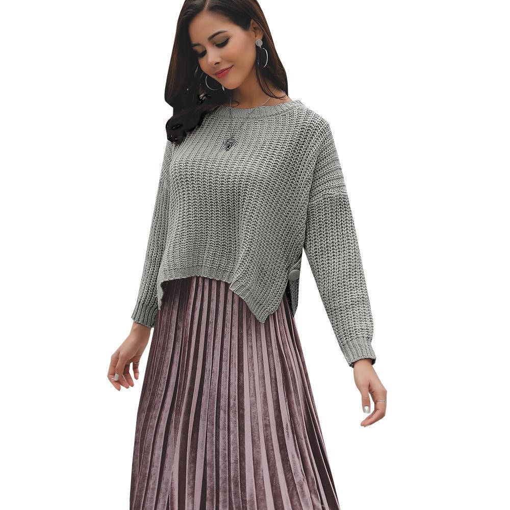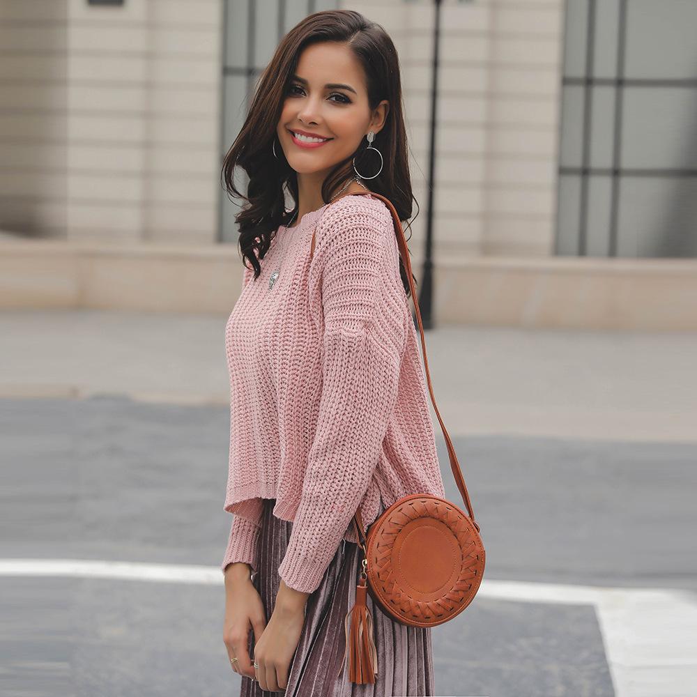Suéter corto alto decorativo con hebilla de cartucho de punto básico de cuello redondo de color sólido de otoño e invierno para mujer de comercio exterior