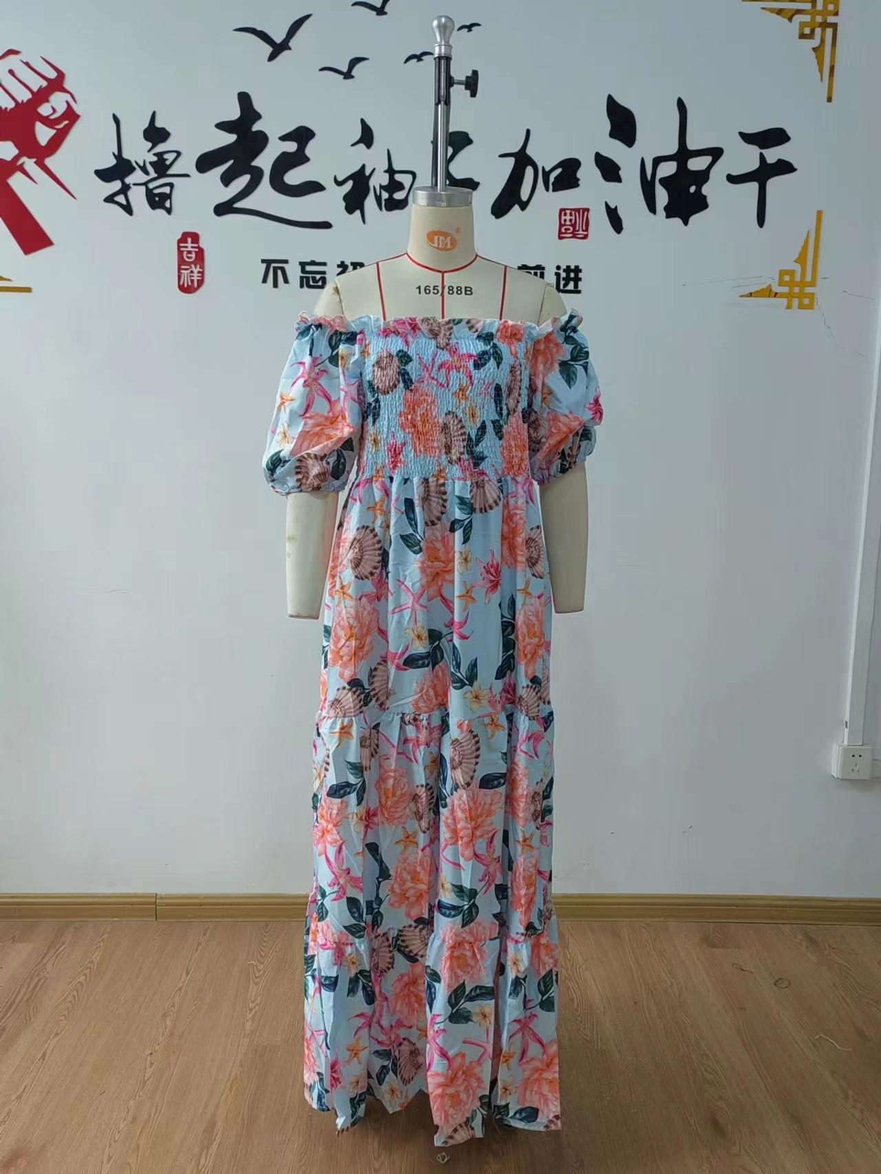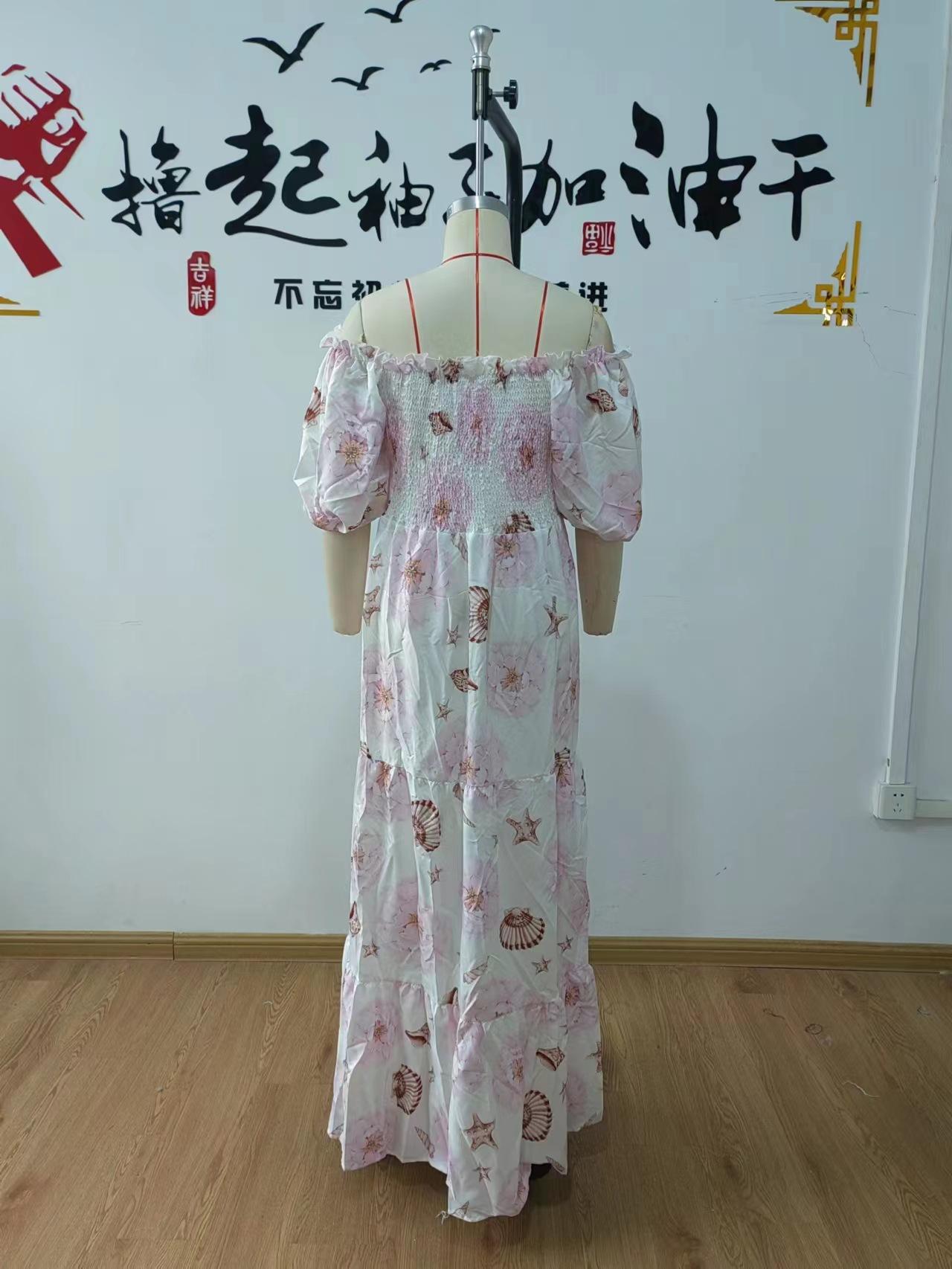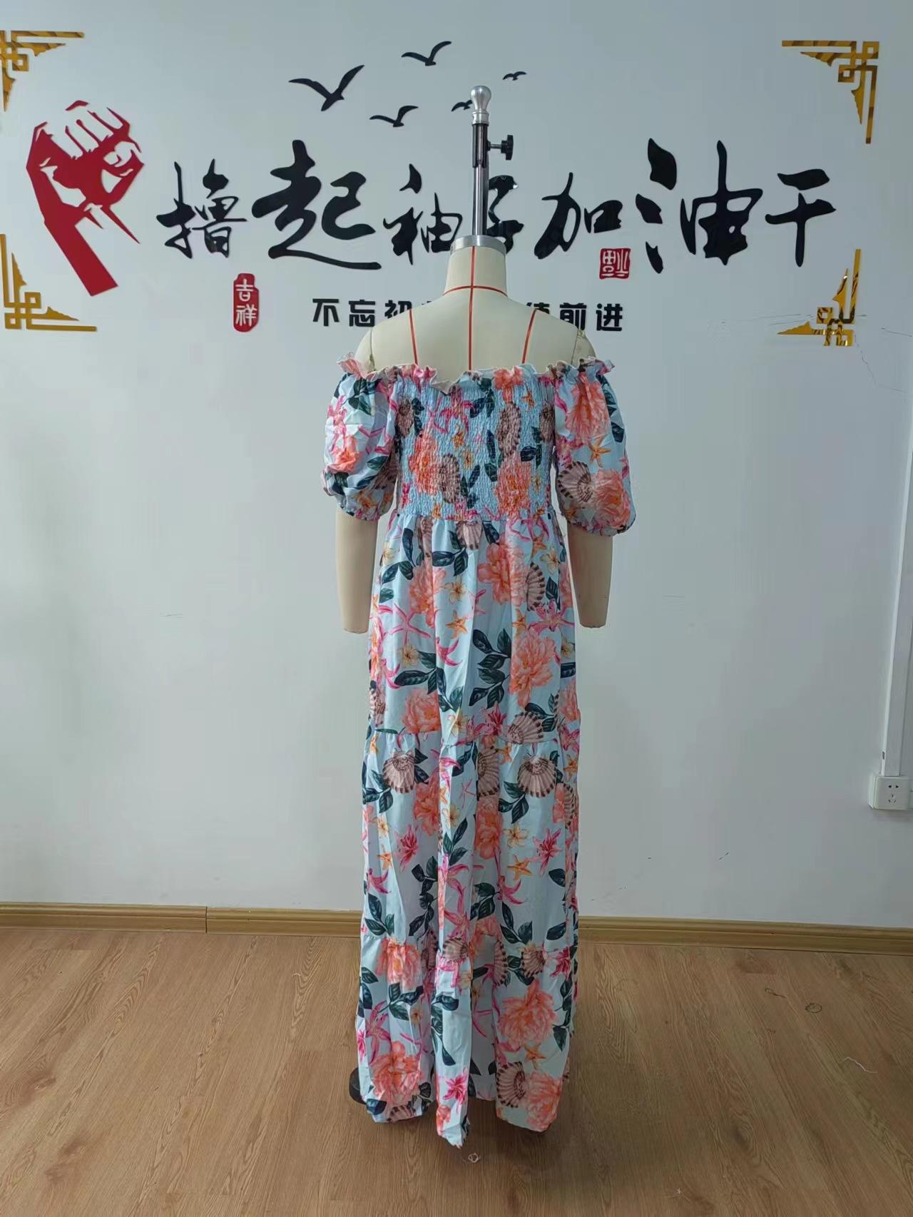 Vestido de mujer europeo y americano de primavera y verano 2025 con hombros descubiertos y estampado floral, falda de hadas larga