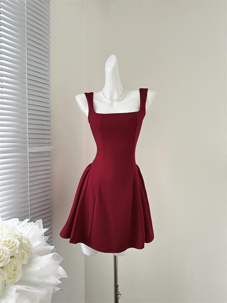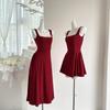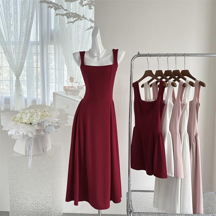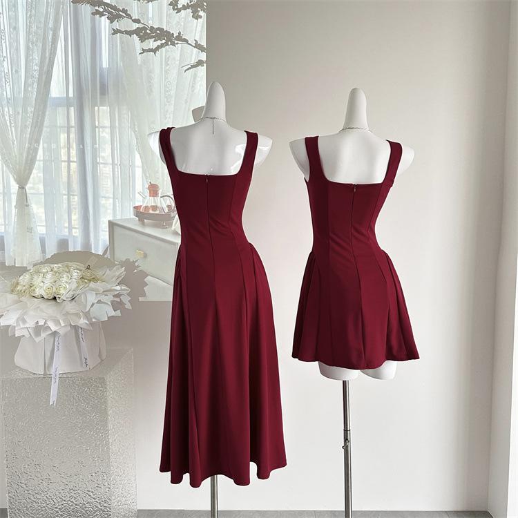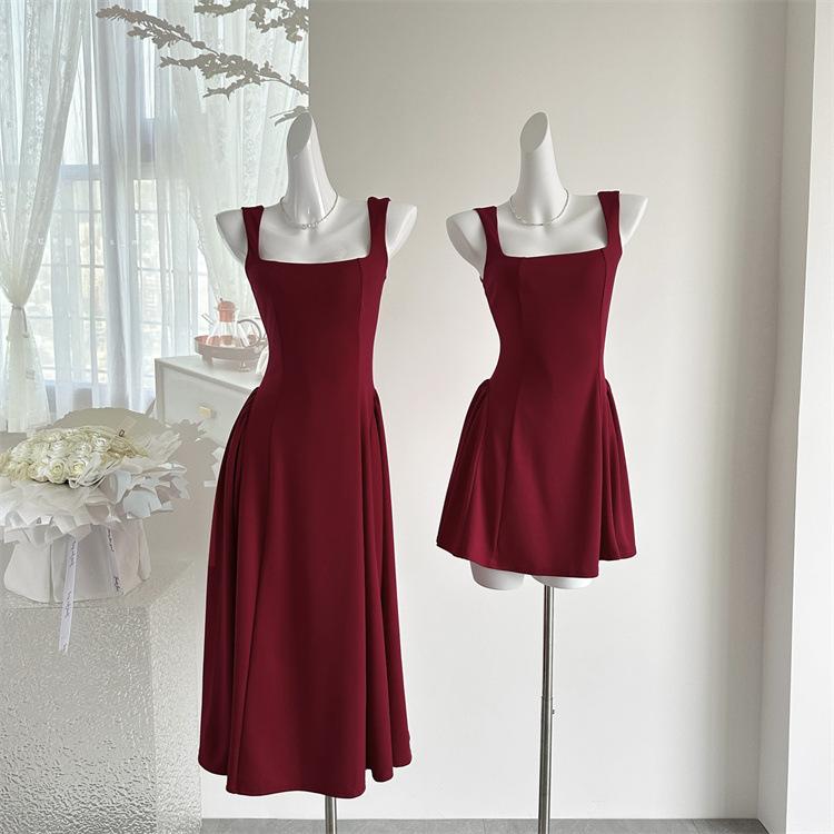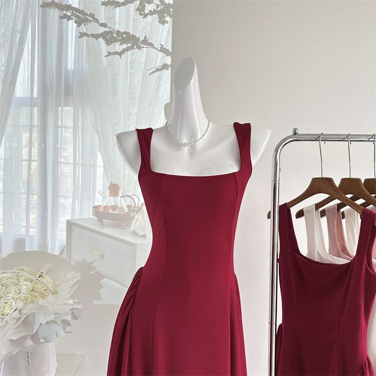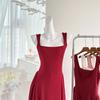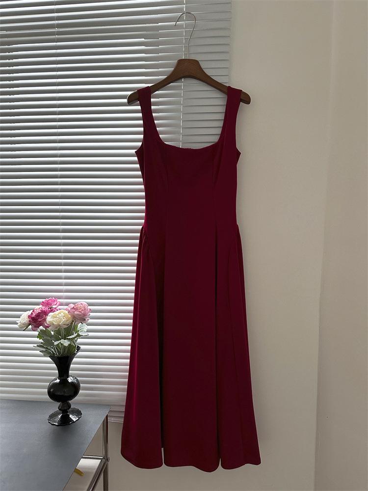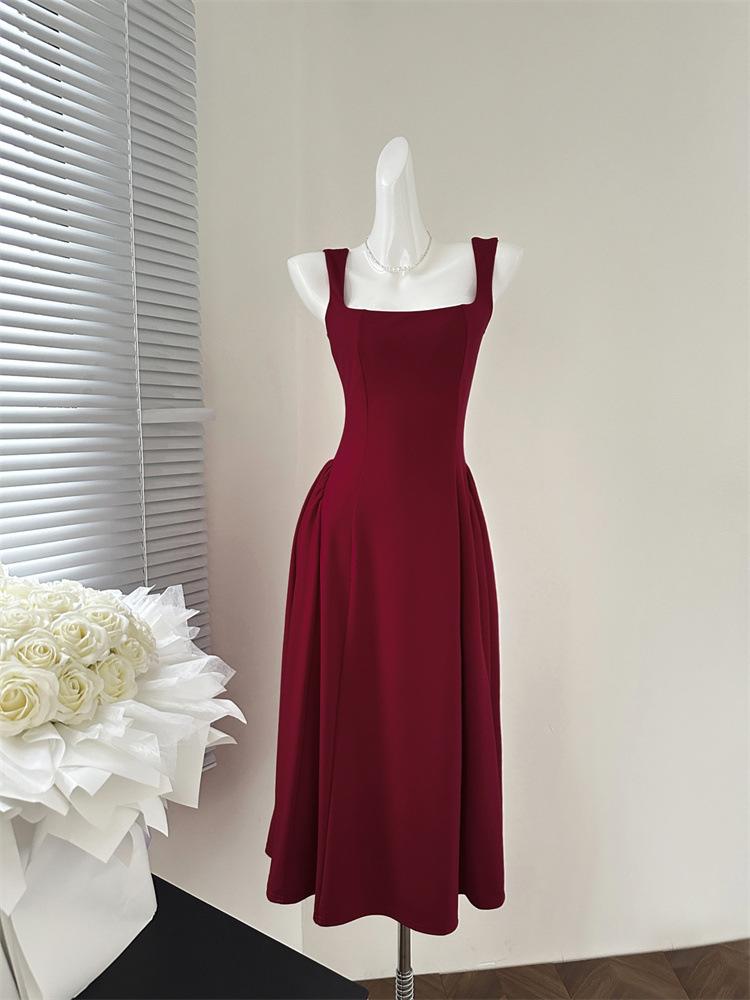 Vestido Rojo de Tirantes con Cuello en U para Mujer 2024 Nuevo Falda Línea A Francesa