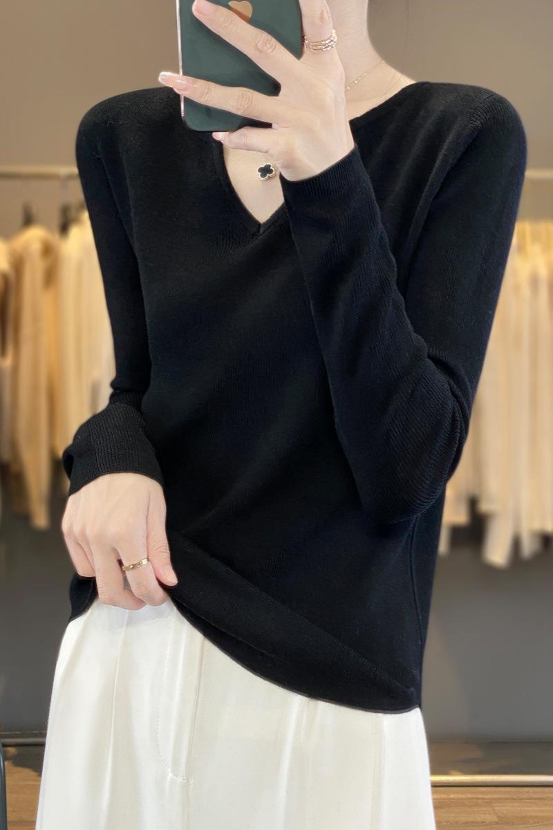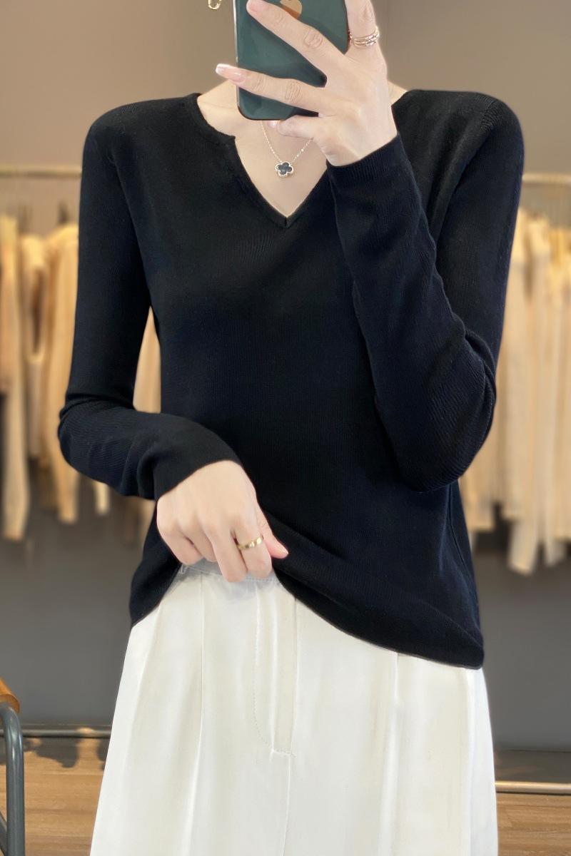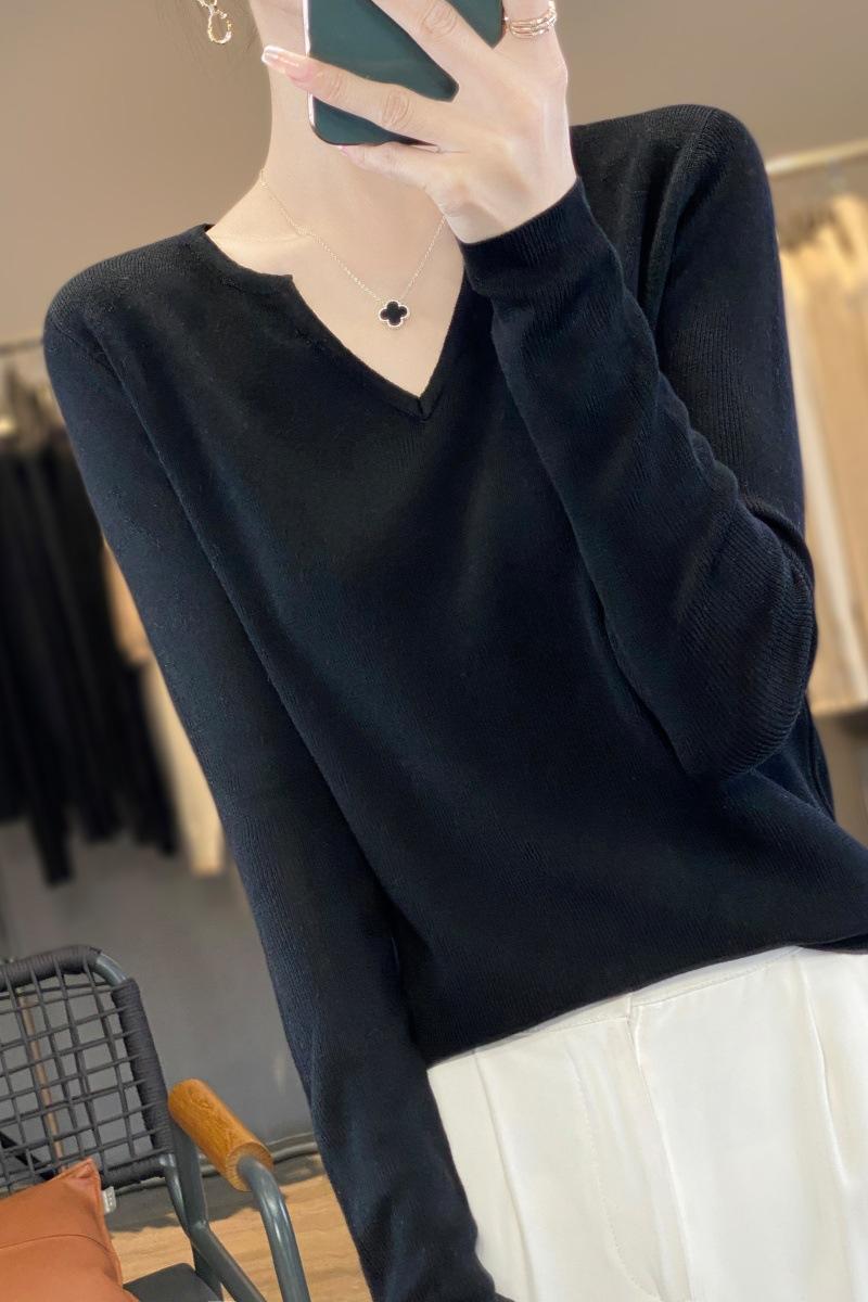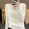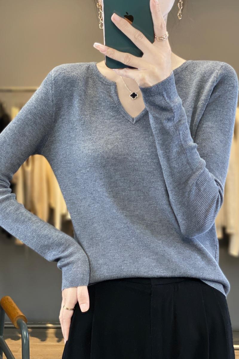 Suéter fino de punto de color liso a la moda para mujer, con cuello en V y corte entallado de lana peinada, para otoño e invierno.