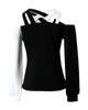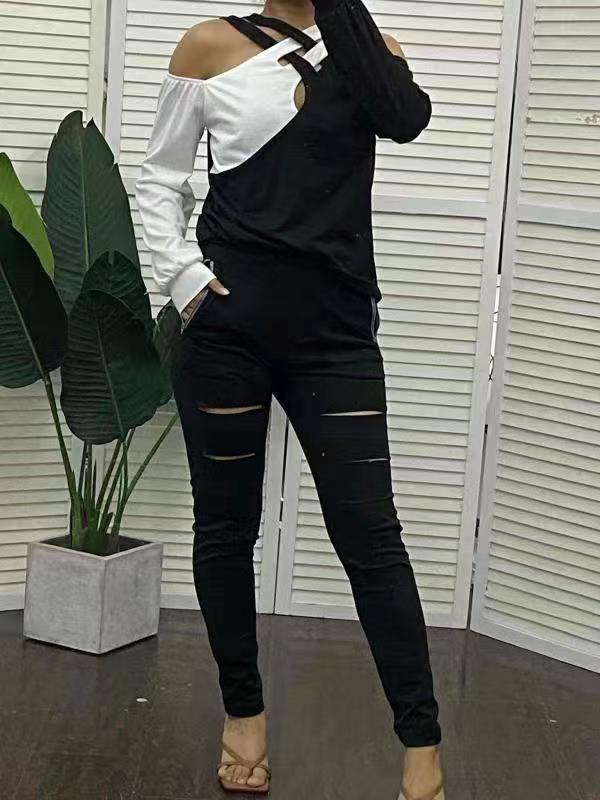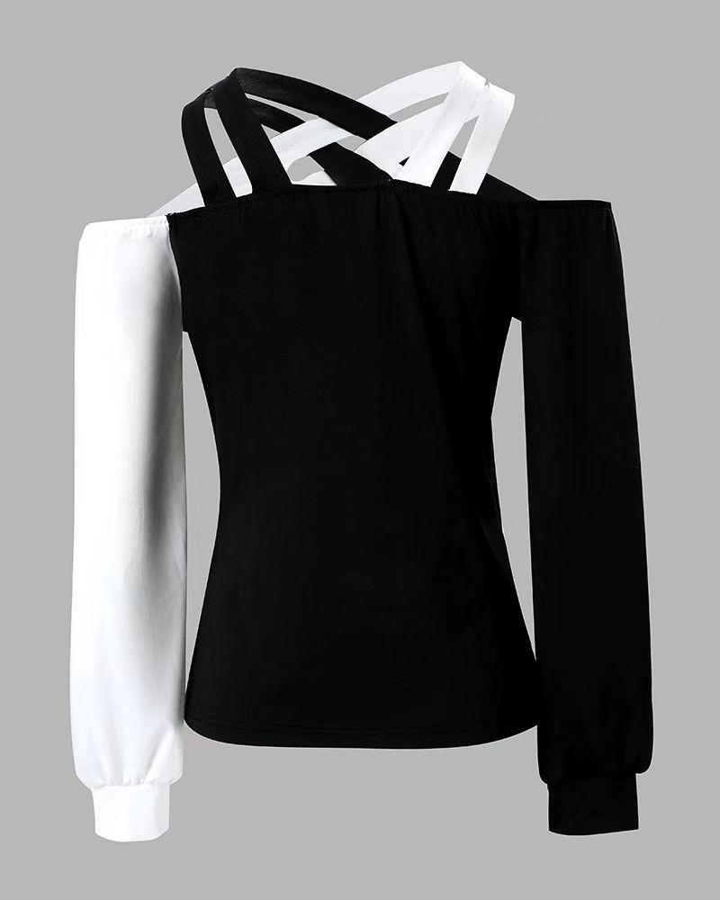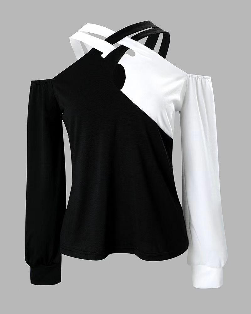 2023 Amazon transfronterizo nuevo diseño de temperamento casual para mujer combinación de colores hombro cuello manga larga top