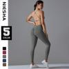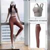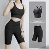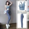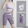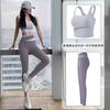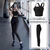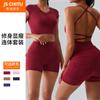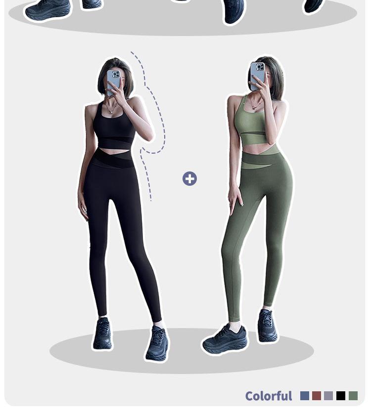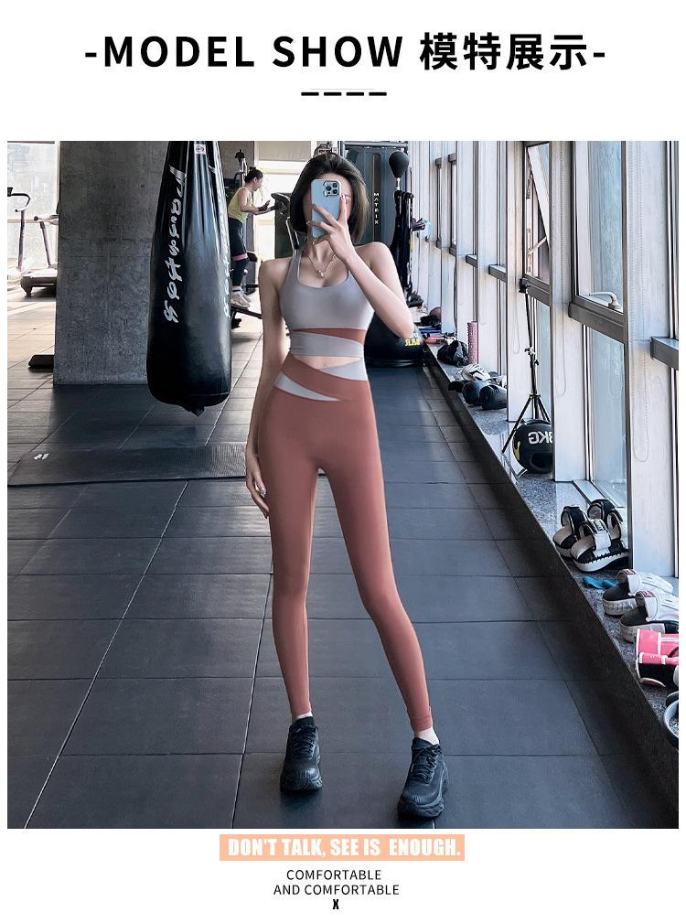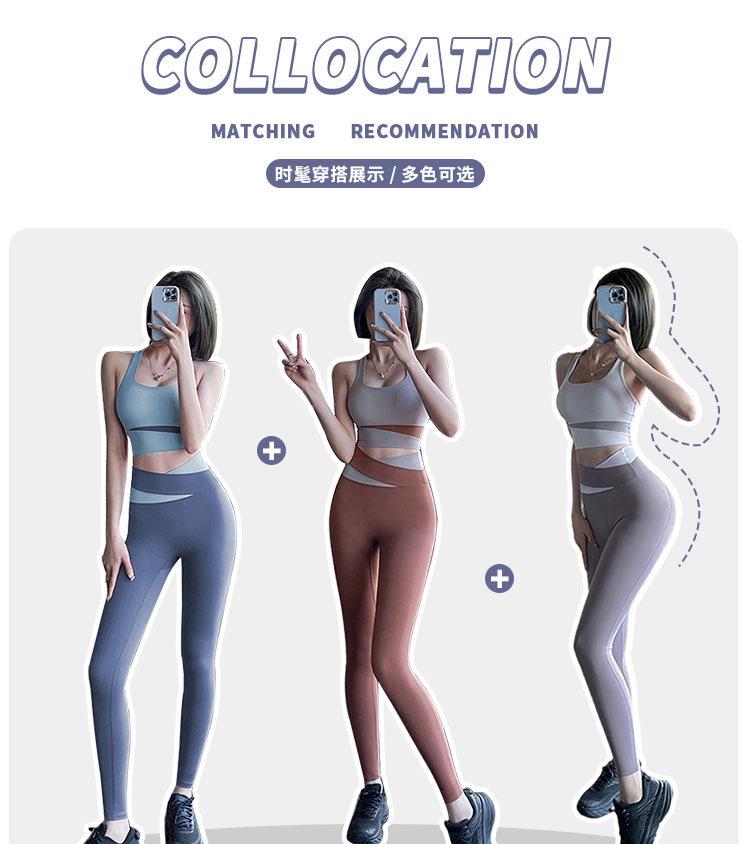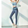 Traje de ropa de yoga de cintura alta a color contrastante para mujer, verano, espalda hermosa, sin costuras en cadera, para correr, fitness, dos piezas, fábrica al por mayor