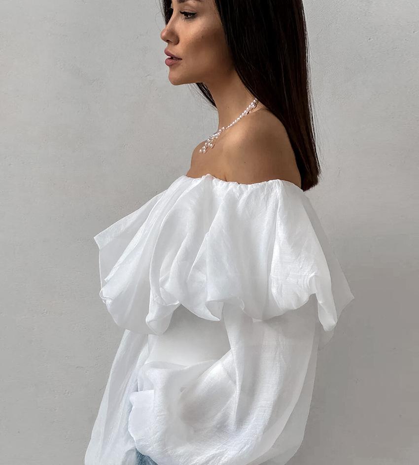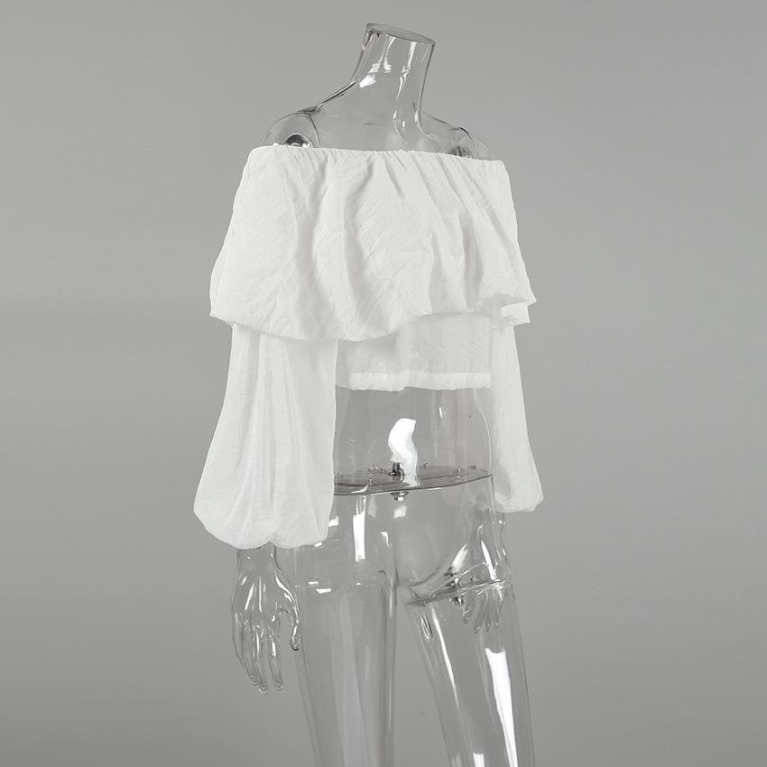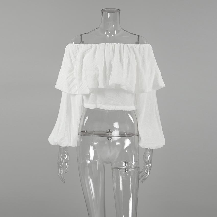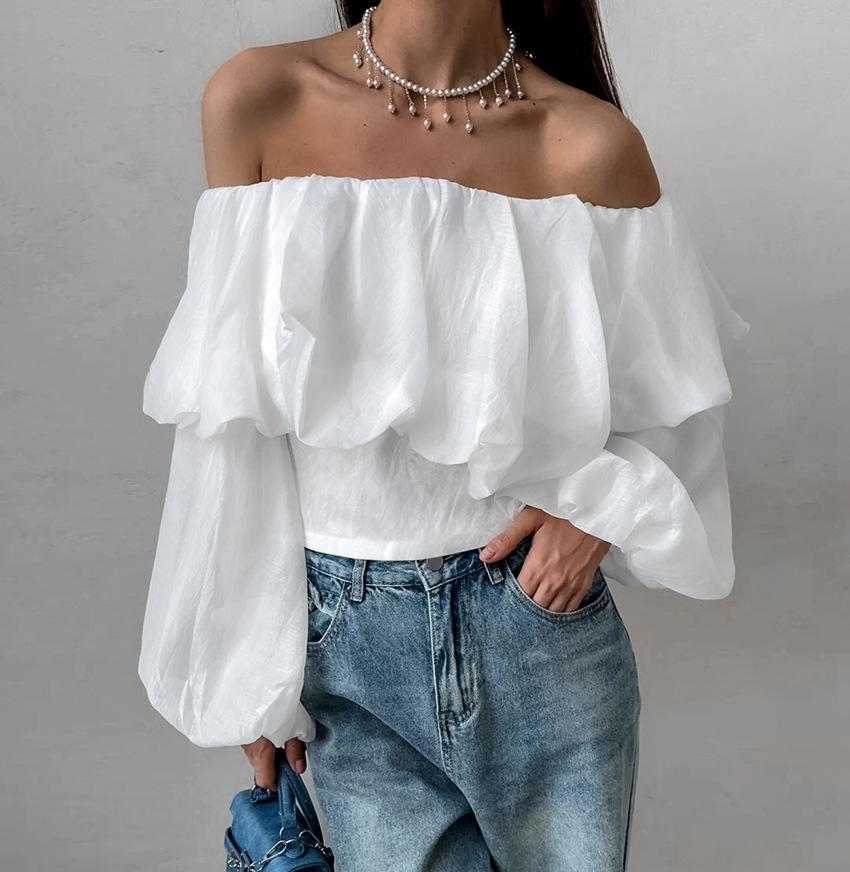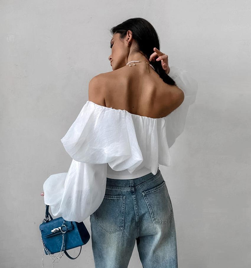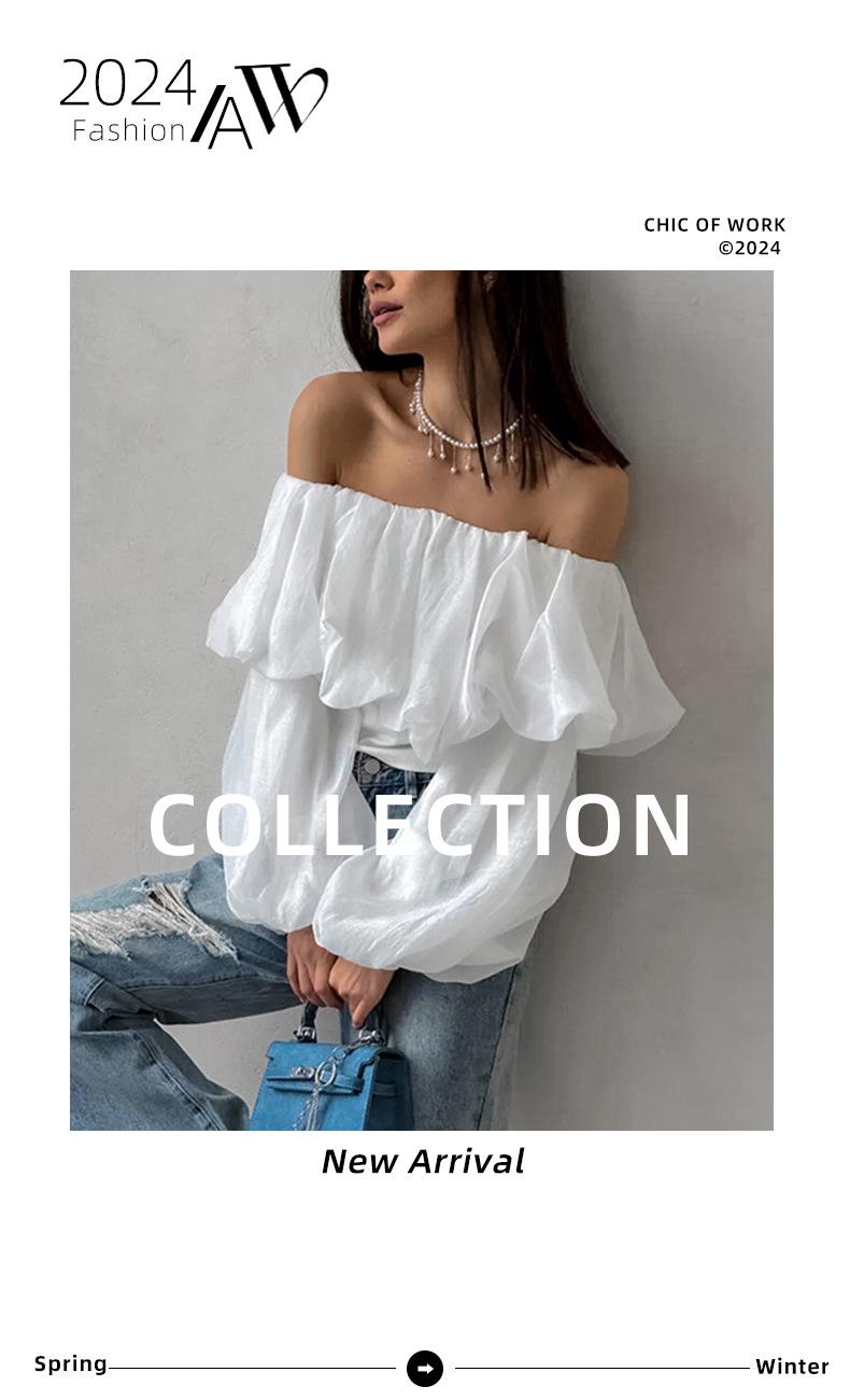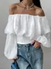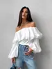 Camisa informal sexy de moda con cuello de un solo personaje y mangas abullonadas, blanca, estilo europeo y americano, con hombros descubiertos, para mujer de verano 2024
