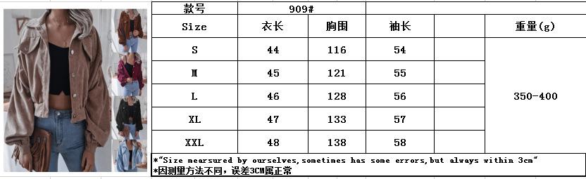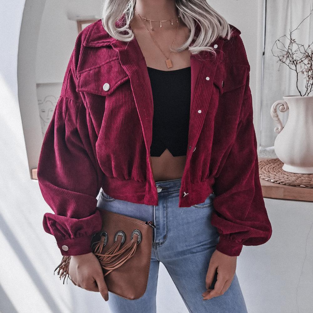 Chaqueta corta informal de pana de manga larga con farol transfronterizo de Europa y América para otoño e invierno, abrigo de mujer de un solo pecho