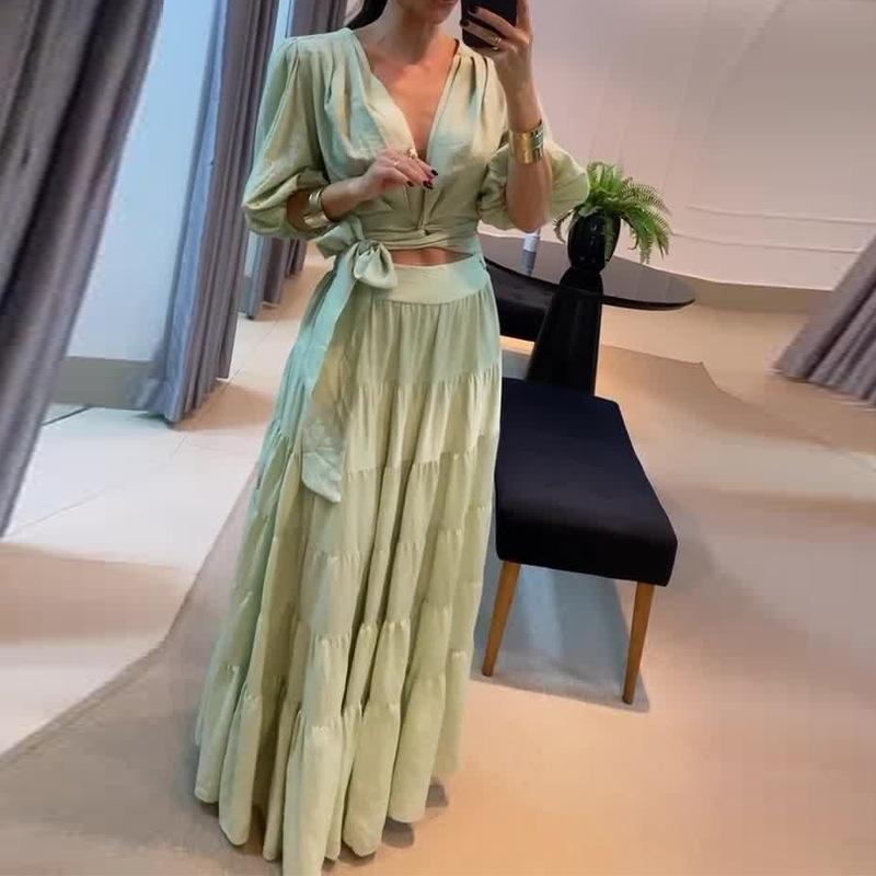 Otoño 2023, nuevo traje de falda con cintura con cordones y corte bajo de color sólido de moda transfronteriza de Amazon, Europa y América